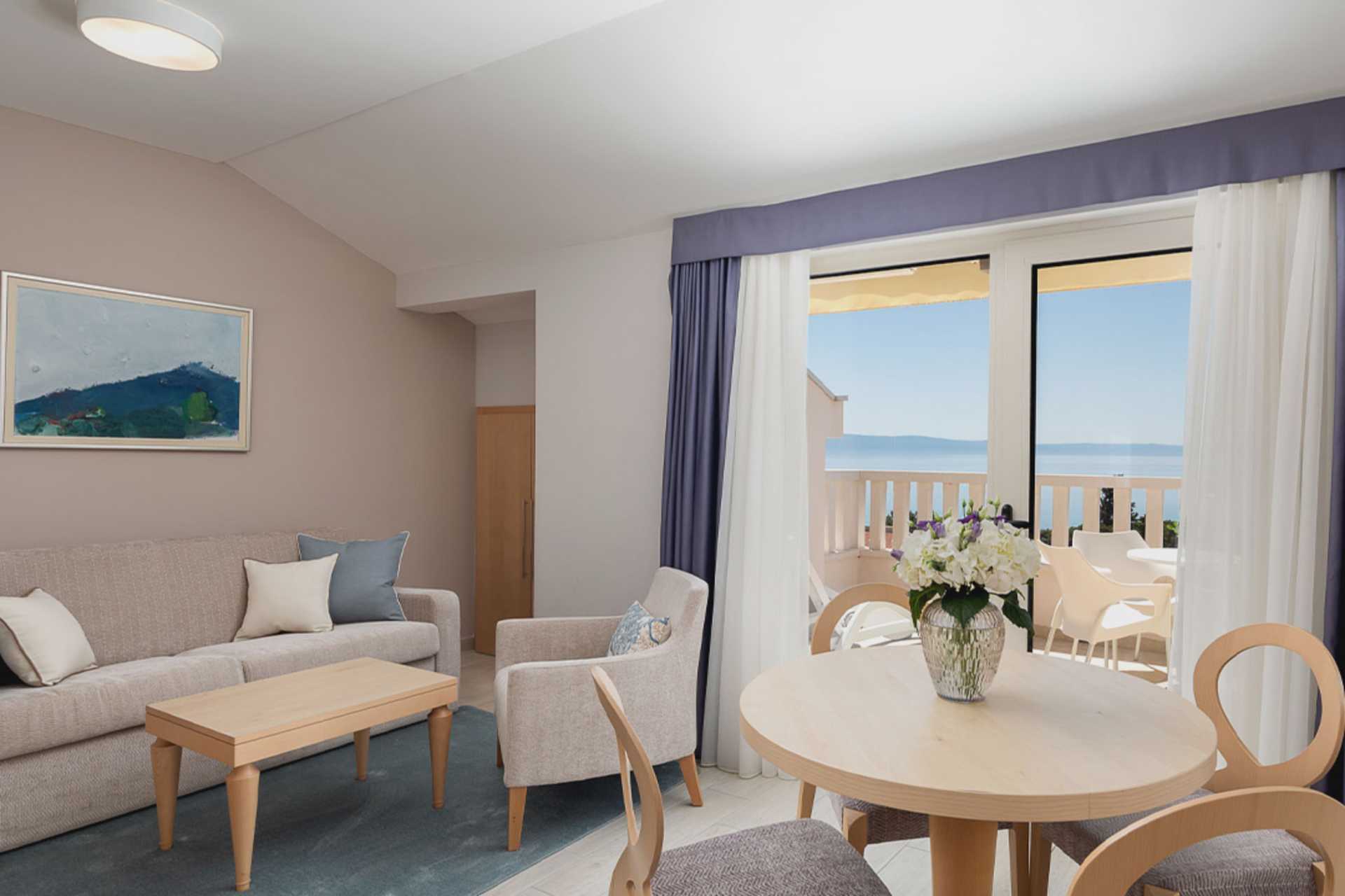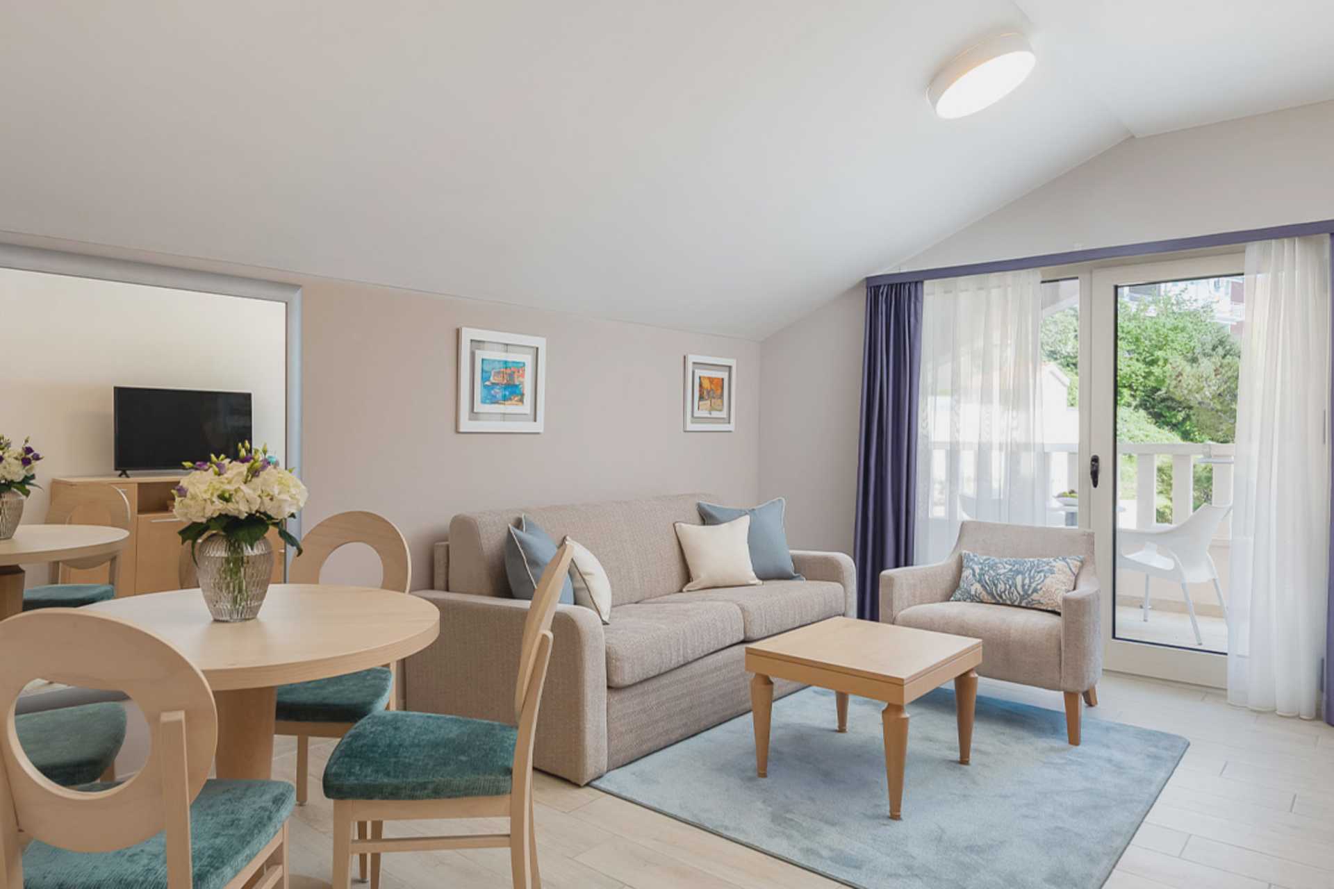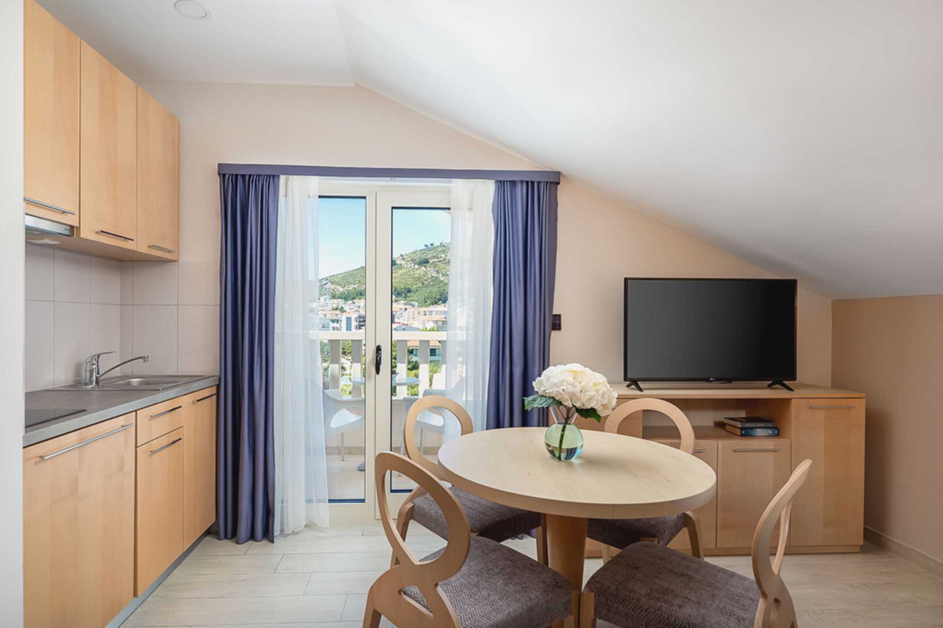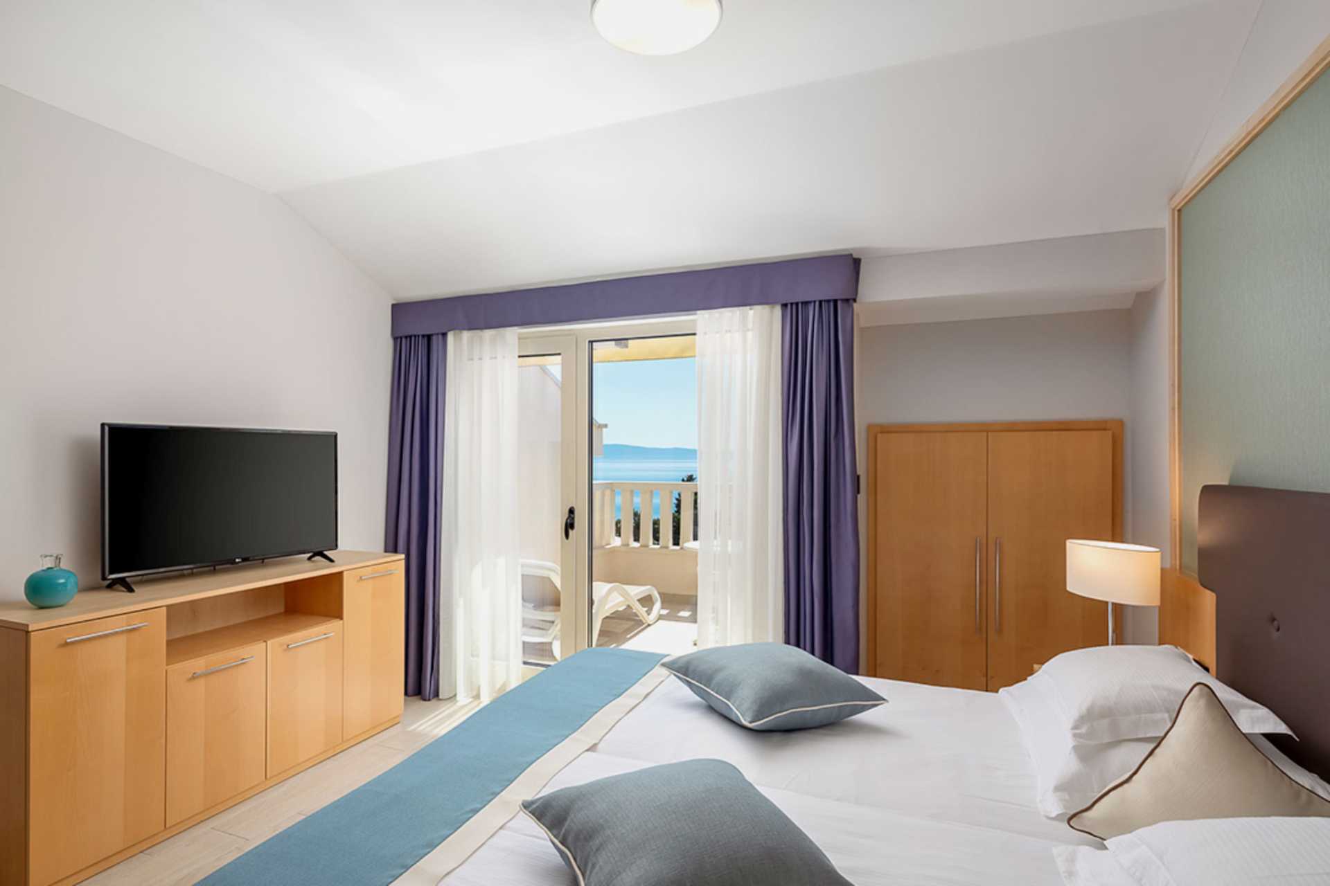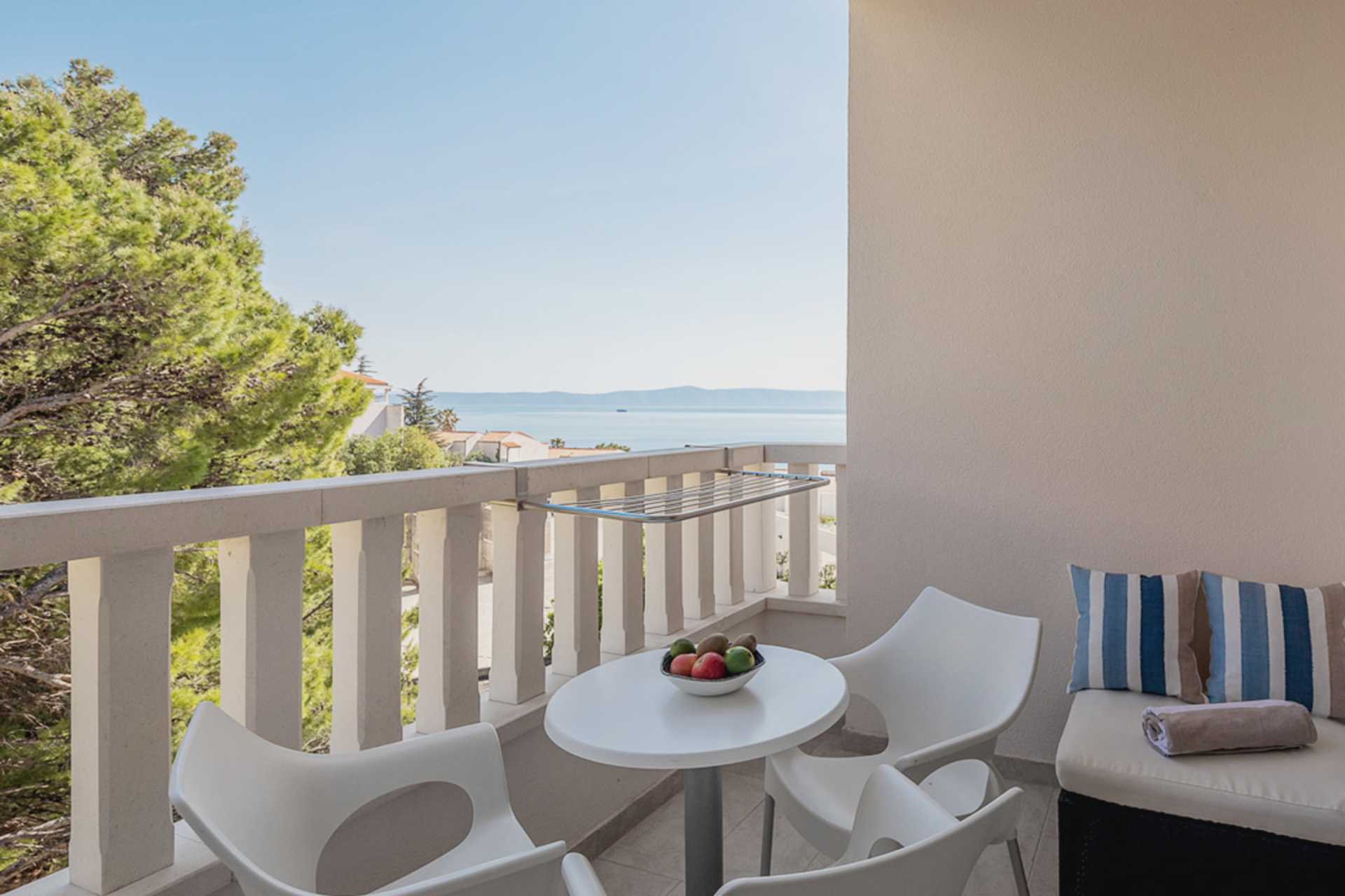 Kaksio maaparvekkeella tai parvekkella, joistakin parvekkeista rajoitettu merinäköala. Asunnoissa on erilaisia suunnitteluratkaisuja, ja ylimmän kerroksen asunnoissa on viistokatot ja parvekkeet voivat olla erikokoisia. Makuuhuone ja yhdistetty olohuone ja minikeittiö. Parivuode. Lisävuodemahdollisuus vuodesohvasta. Minikeittiö, jossa keittolevyt, jääkaappi, mikroaaltouuni, vedenkeitin ja peruskeittiövälineet. Maksuton wifi, ilmastointi ja tallelokero. Tv kansainvälisillä kanavilla. Hiustenkuivain. Kylpytakit ja tossut. Kylpyamme tai suihku ja wc. Siivous 7 krt/viikko.