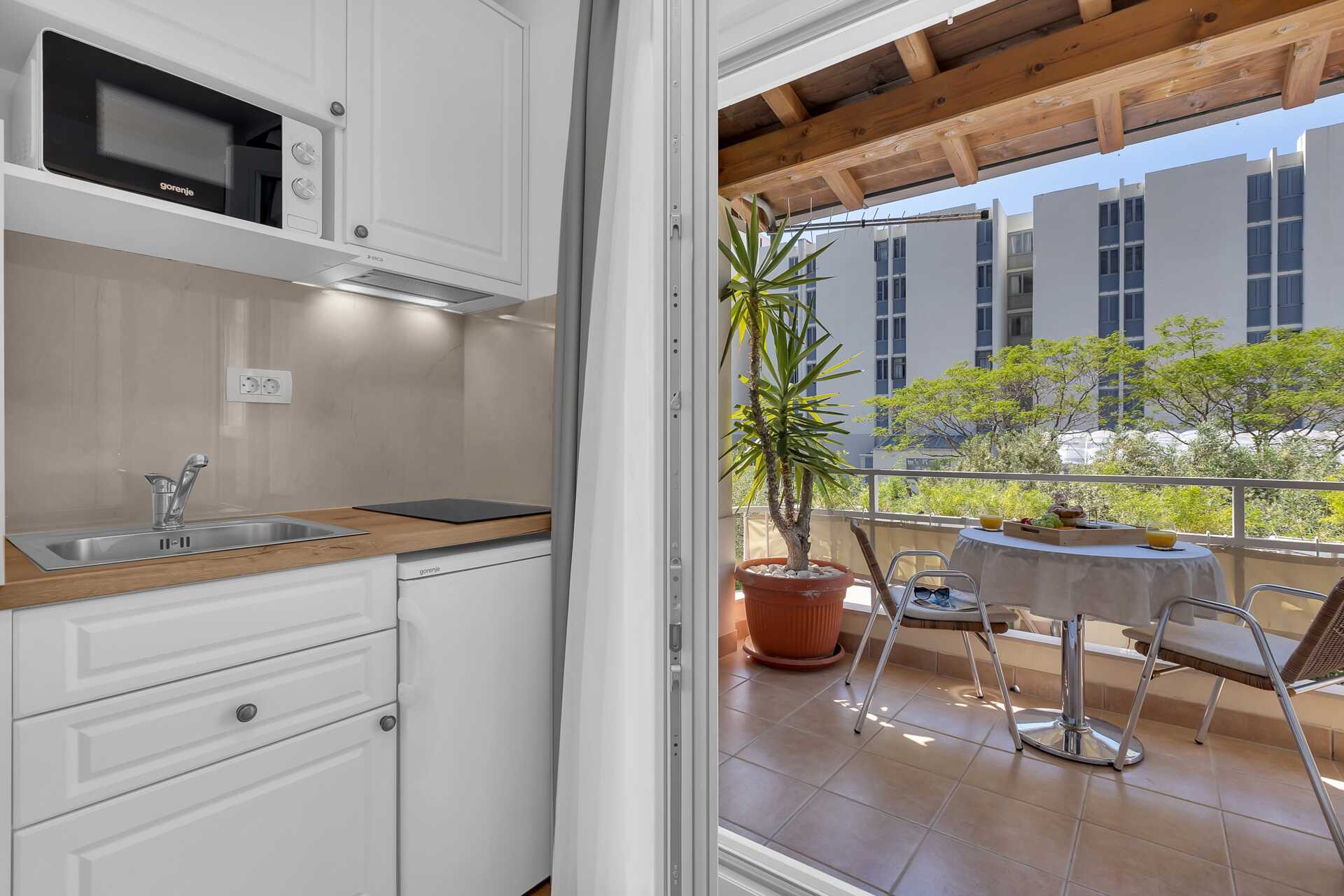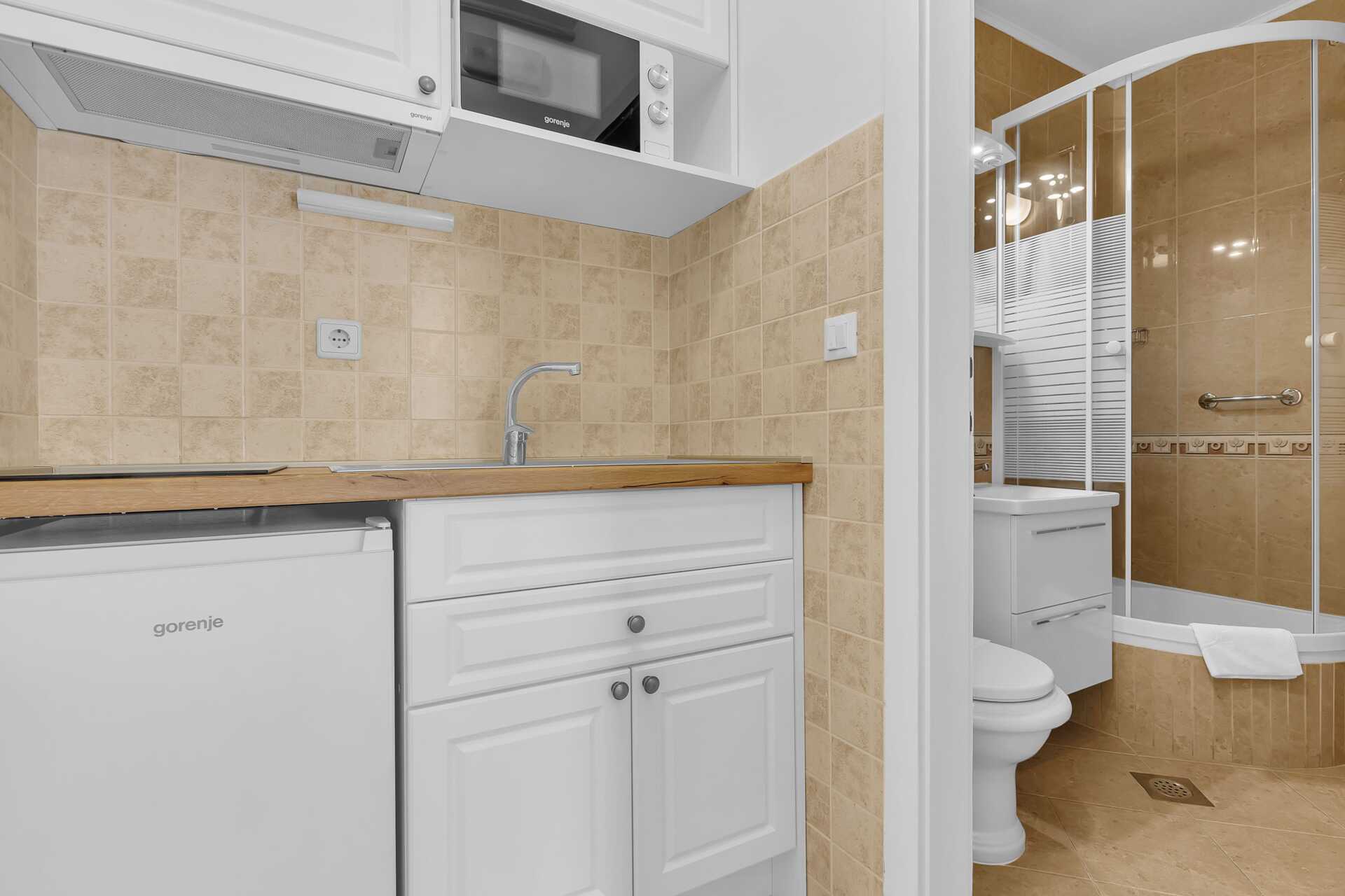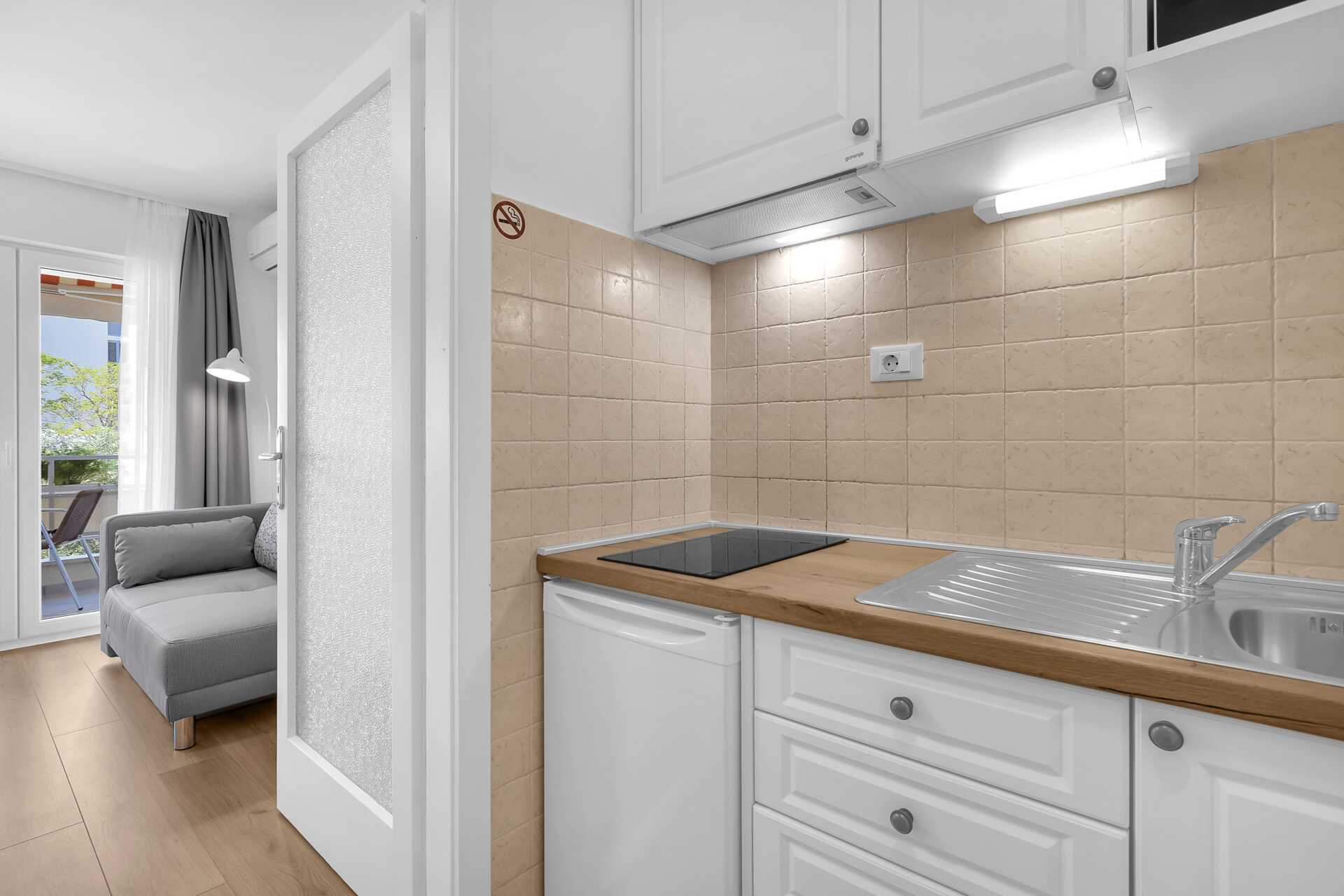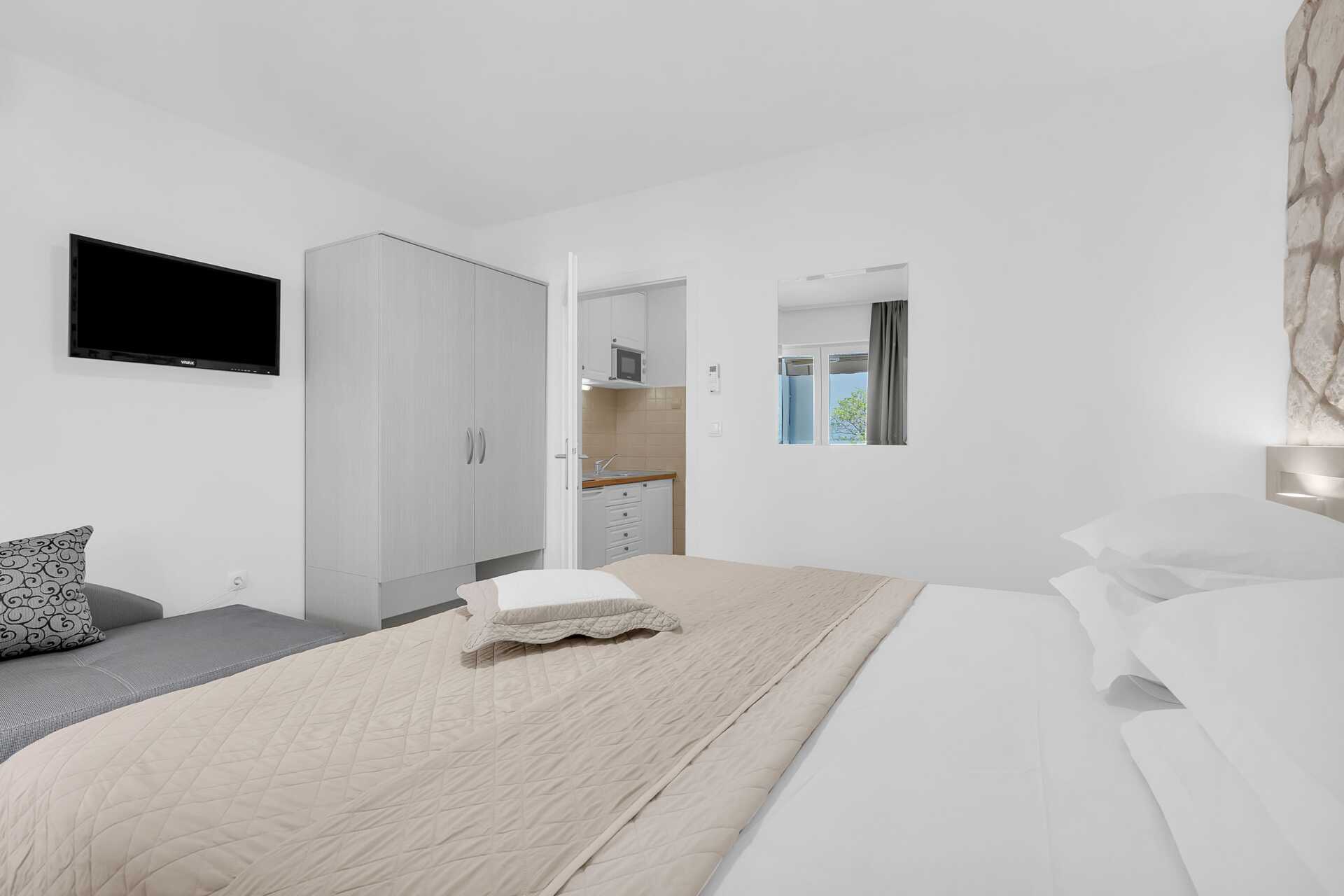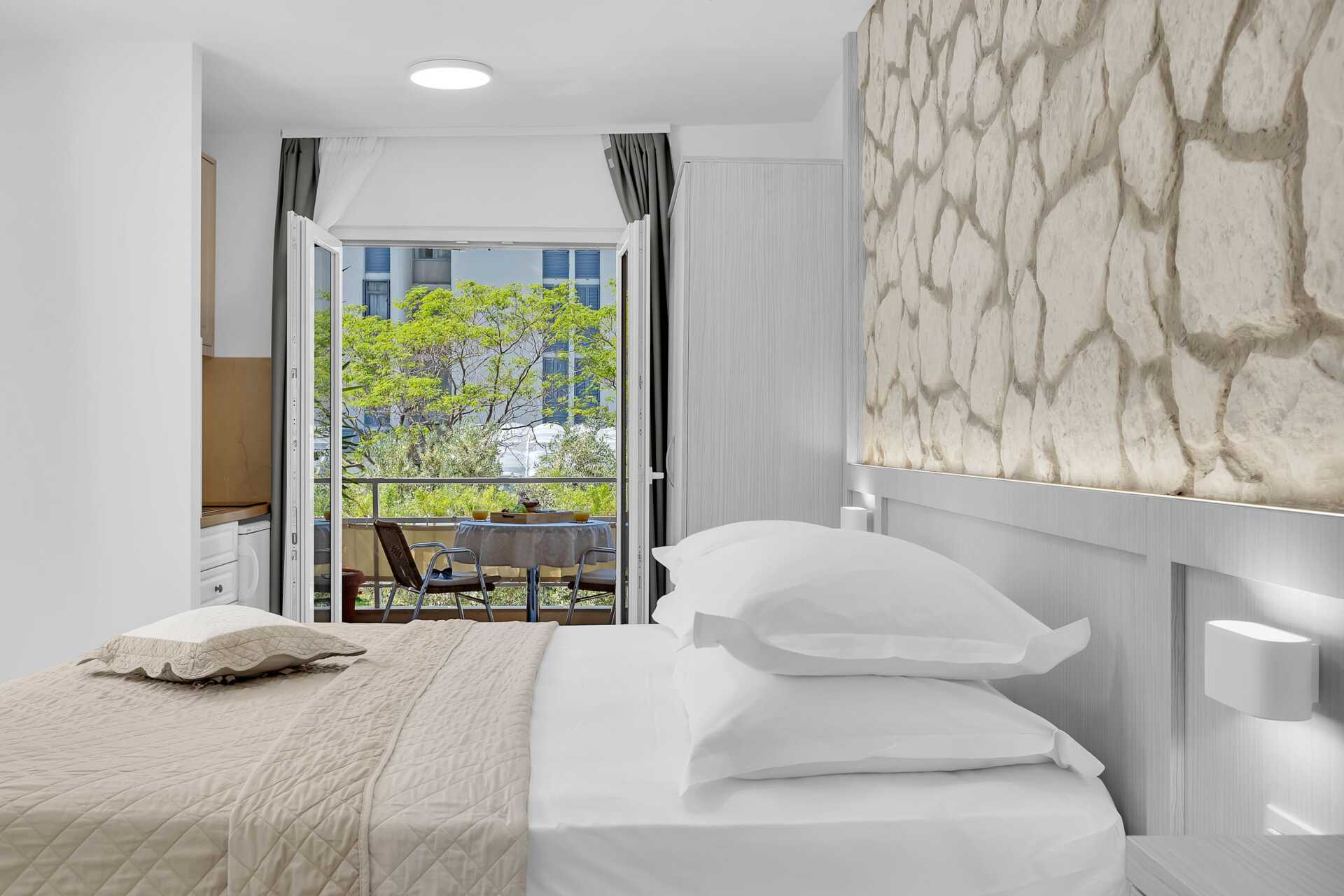 Yksiö parvekkeella. Yhdistetty makuuhuone ja minikeittiö. Parivuode. Lisävuodemahdollisuus vuodesohvasta. Minikeittiössä keittolevyt, jääkaappi, vedenkeitin ja yksinkertainen keittiövarustus. Maksuton wifi, ilmastointi ja tallelokero. Tv kansainvälisillä kanavilla. Hiustenkuivain. Kylpyhuoneessa suihku ja wc. Siivous 6 krt/viikko.