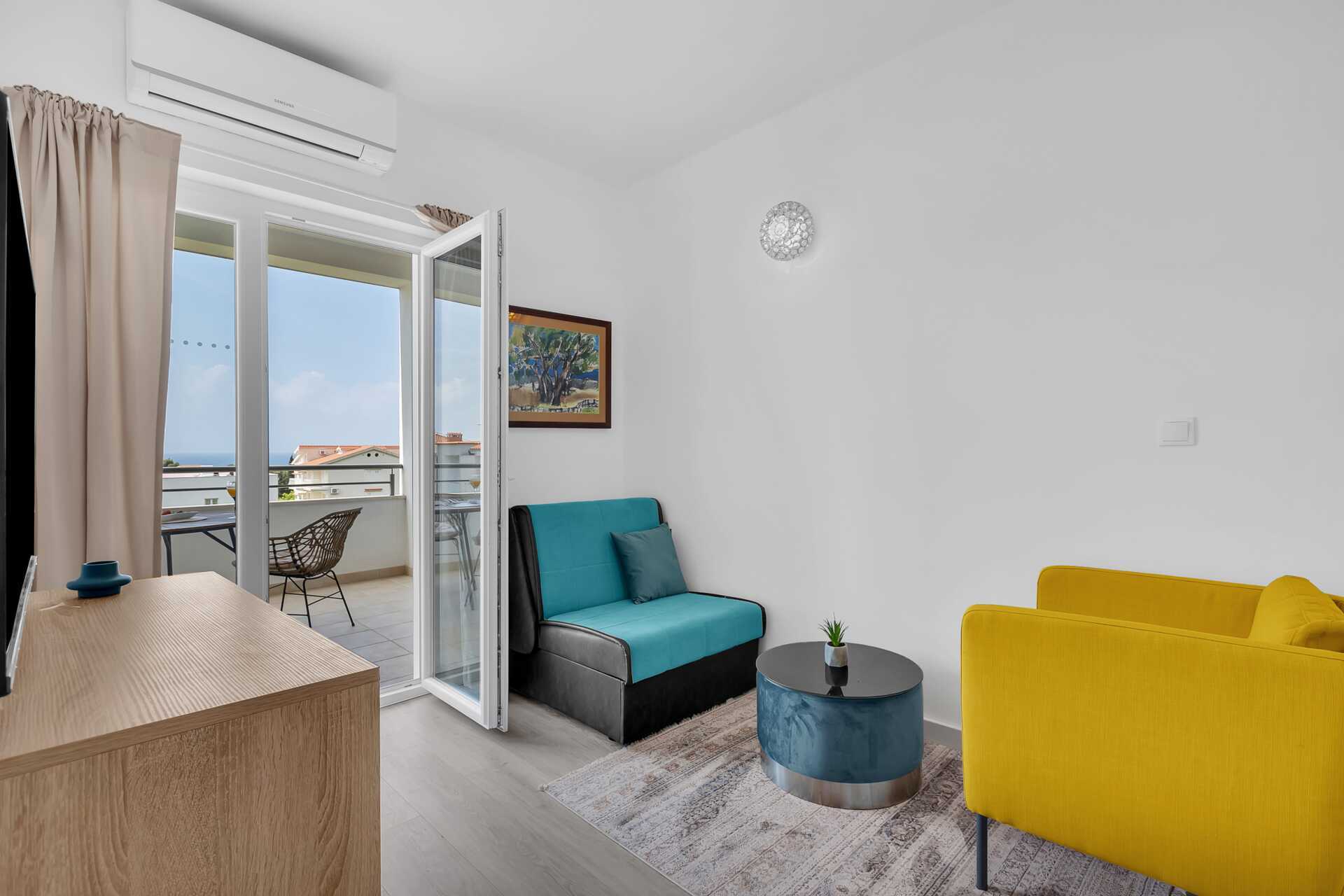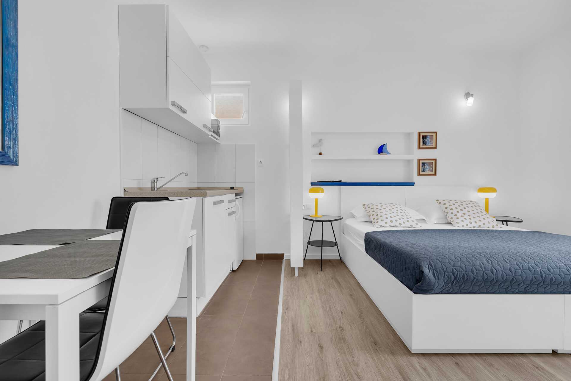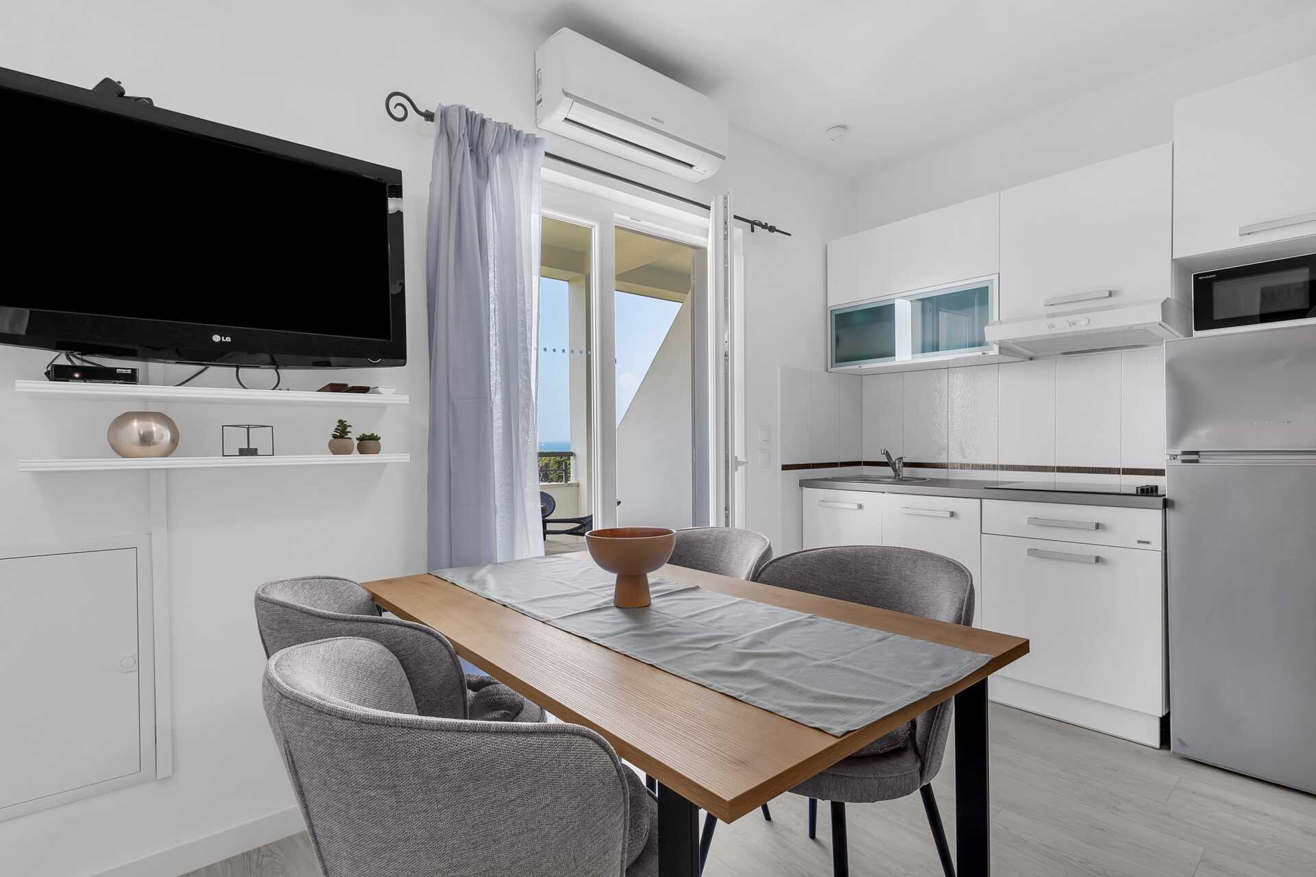 Yksiö jossa on parveke, osassa näkymä merelle päin. Makuuhuone yhdistetty minikeittiöön. Minikeittiössä jääkaappi, kahvinkeitin, mikro ja yksinkertainen keittiövarustus. Parivuode tai kaksi erillistä sänkyä. Wifi, ilmastointi ja tallelokero sisältyvät hintaan. Tv kansainvälisillä kanavilla. Kylpyhuone kylpyamme/ suihku ja wc. Siivous 6 krt/viikko.