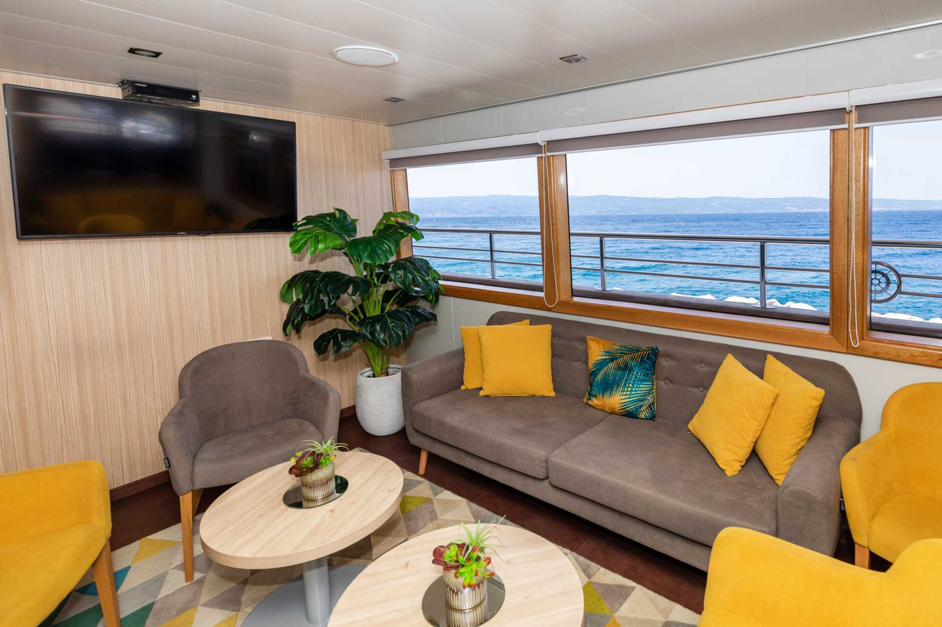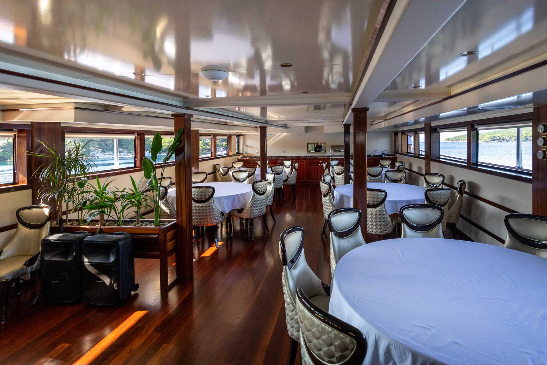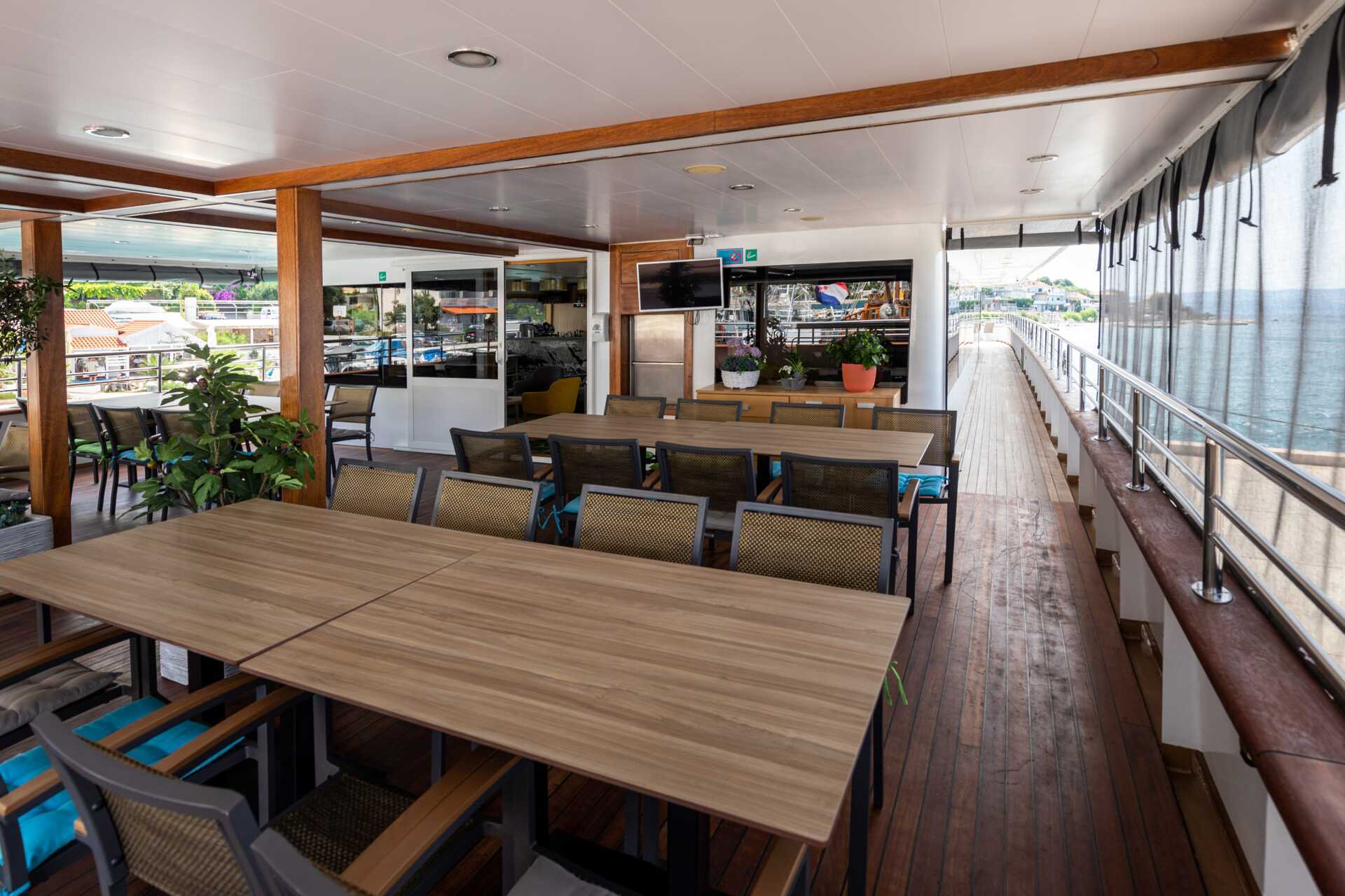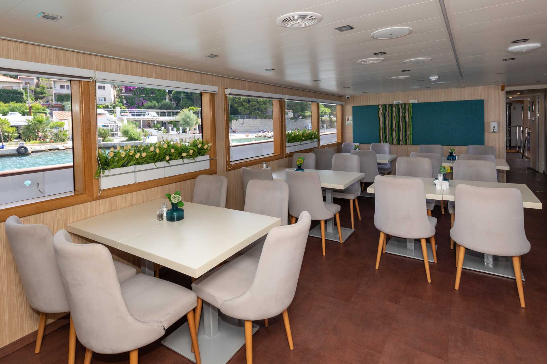Yläkerrassa on suuri ravintola, jossa on oleskelutila. Ravintola jatkuu ulkona kannella, joten voit nauttia sekä aamiaisen että lounaan ulkona. Buffetaamiaisella tarjoillaan päivittäin tuoretta leipää ja lounaalla on tarjolla paikallisia annoksia ja salaattibaari. Panoraamaikkunoista on aina mahdollisuus nähdä ulos merelle ja saaristoon. Ravintolassa on ilmastointi ja maksuton wifi ja tv.