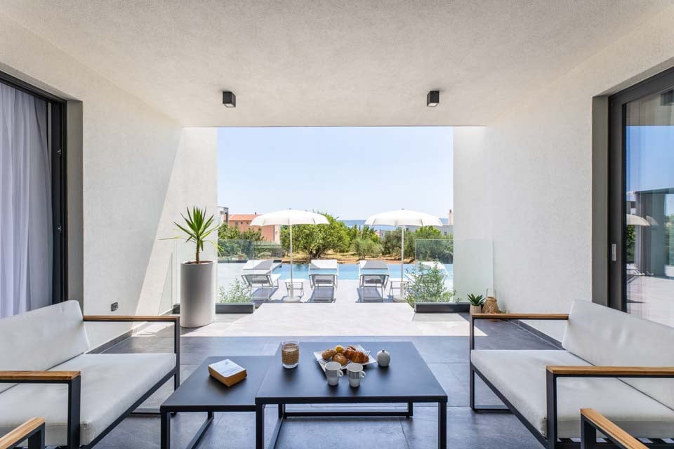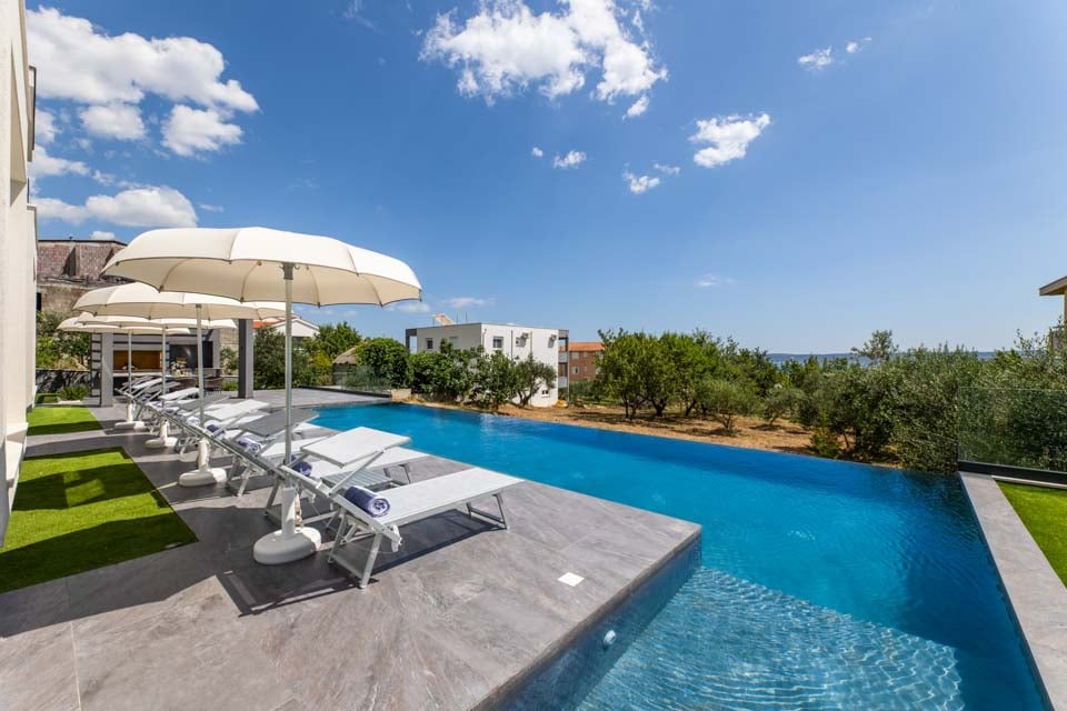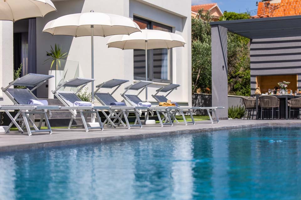 Jokainen viidestä tilavasta makuuhuoneesta on yksityinen pyhäkkö, jossa on ylelliset huonekalut, moderni sisustus ja oma kylpyhuone äärimmäisen mukavuuden takaamiseksi. Suuret ikkunat ja parvekkeet kutsuvat sisään kultaista Kroatian auringonpaistetta ja tarjoavat henkeäsalpaavat näkymät Adrianmerelle ja rehevään ympäristöön.