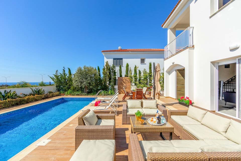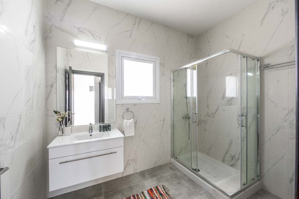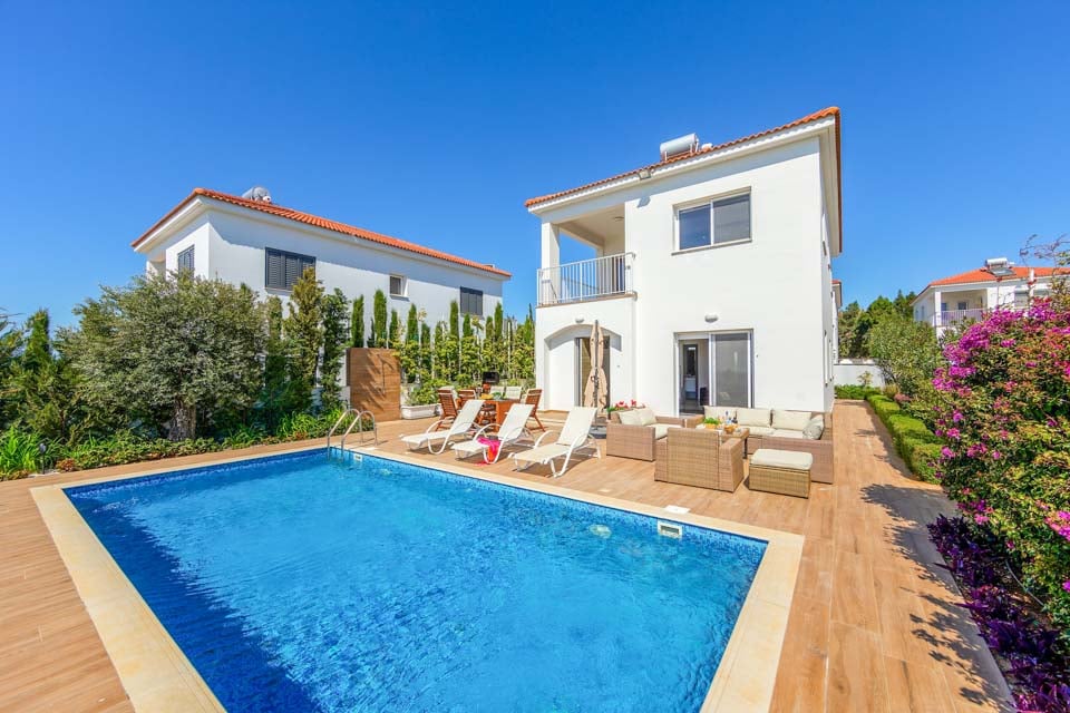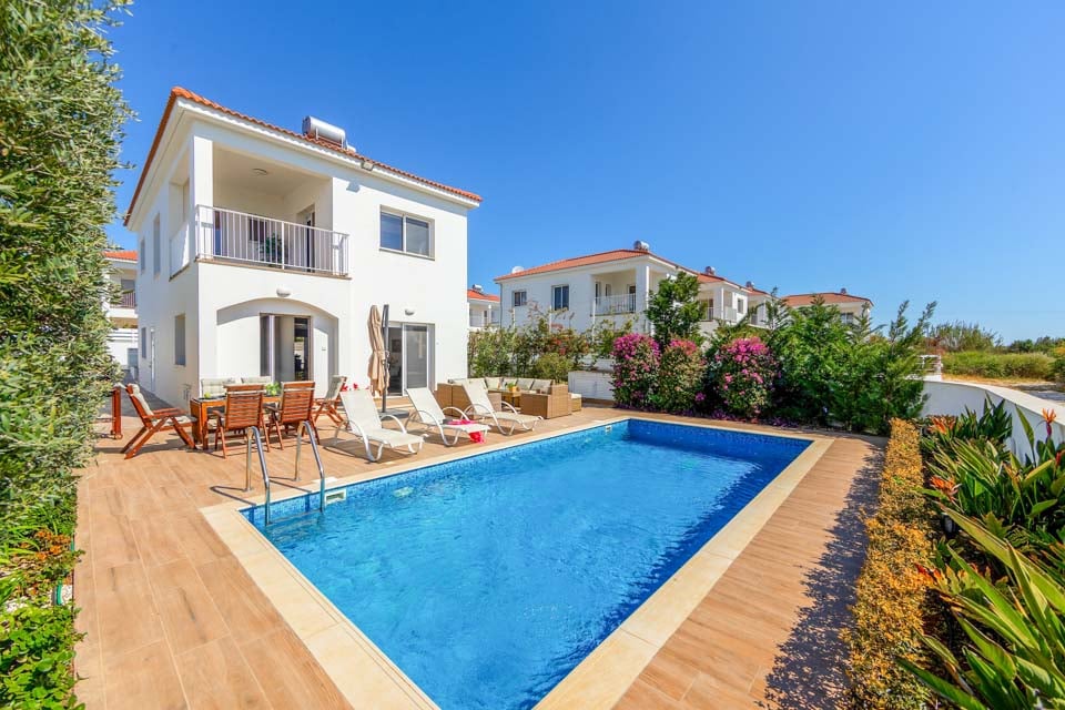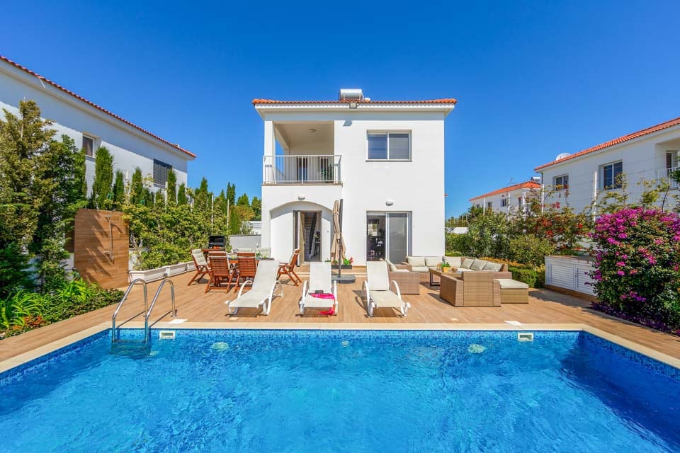 Vaihtoehtoisesti voit palata takaisin huvilaan rentoutumaan uima-altaan äärelle. Ulkona ruokailua varten on grilli ja ruokapöytä on parhaimmillaan auringonpaisteessa. Rentoudu ja nauti puutarhasohvista samalla, kun nautit tämän vuoden myydyimmästä kirjasta ja mezze-lajitelmasta, jota jaat ystävien ja perheen kesken. Sisältä huvila on avoin ja minimalistinen, ja neutraalit valkoiset ja harmaat sävyt kirkastavat huoneita. Olohuone on L-kirjaimen muotoinen ja johtaa täysin varusteltuun keittiöön, jossa on kaikki uusimmat kodinkoneet. Ensimmäisessä kerroksessa on kolme valoisaa ja ilmavaa makuuhuonetta, joissa on ilmainen ilmastointi viilentämään lämpiminä kesäiltoina.
