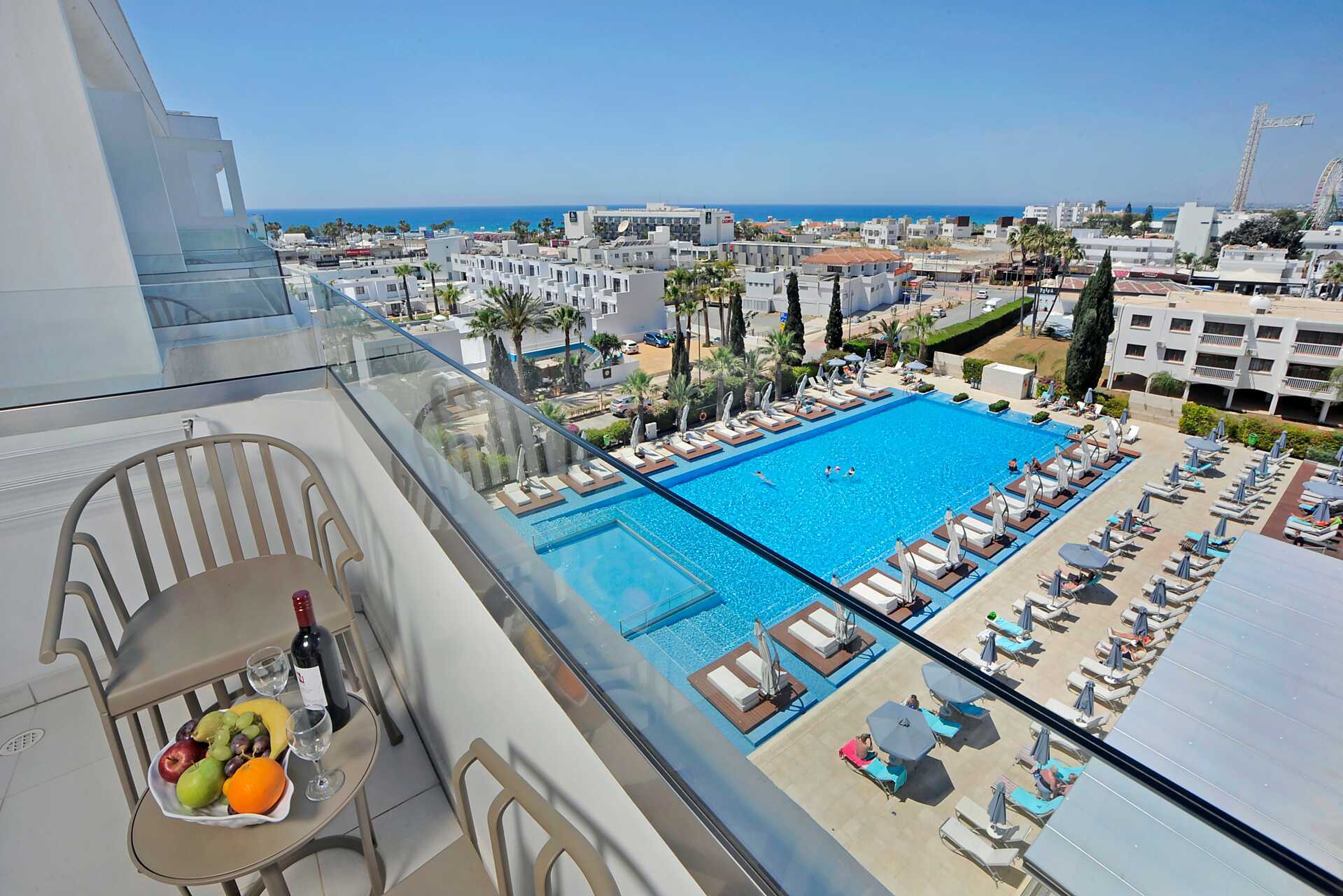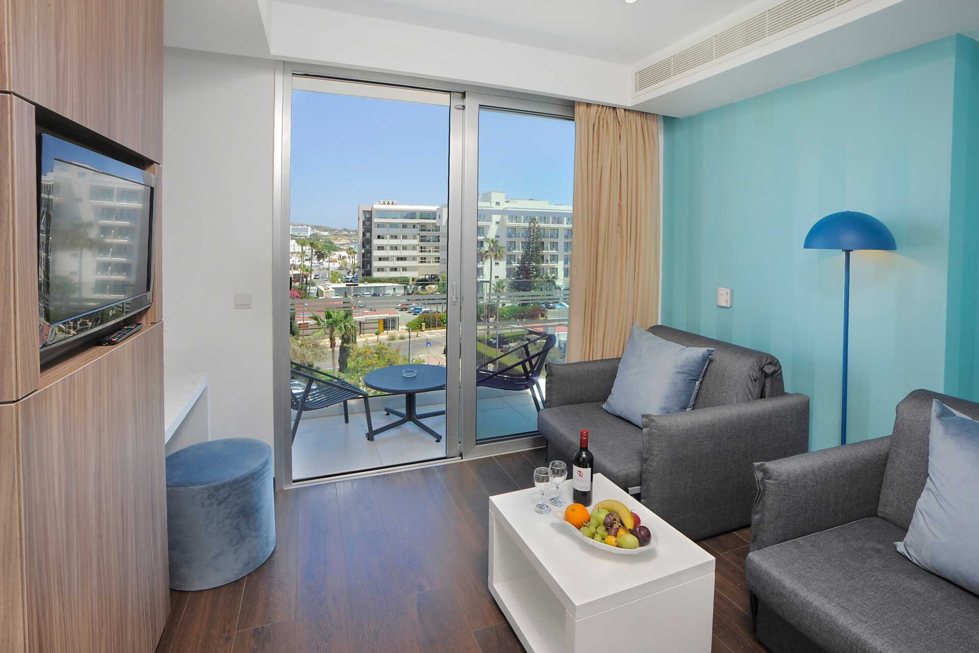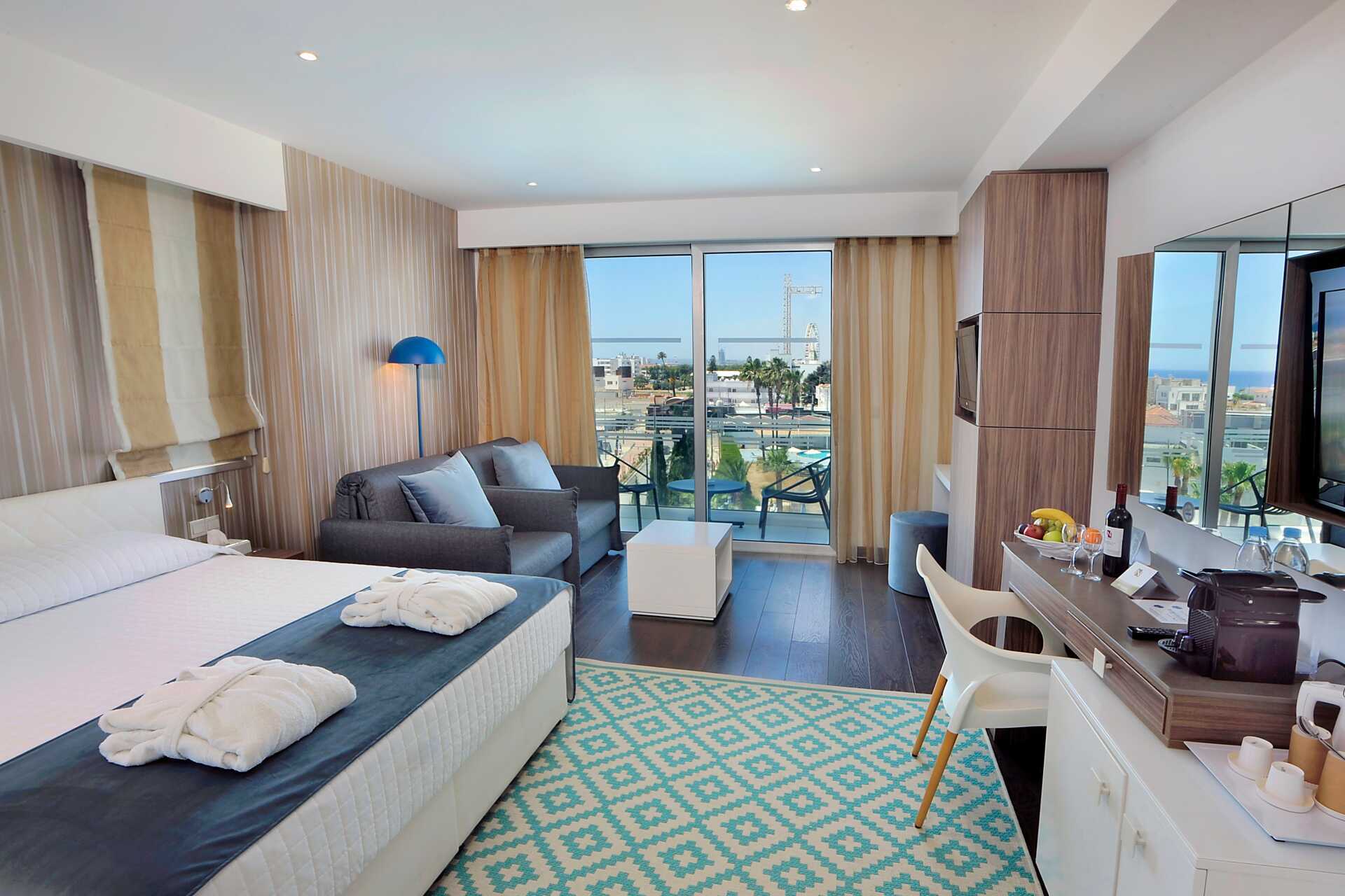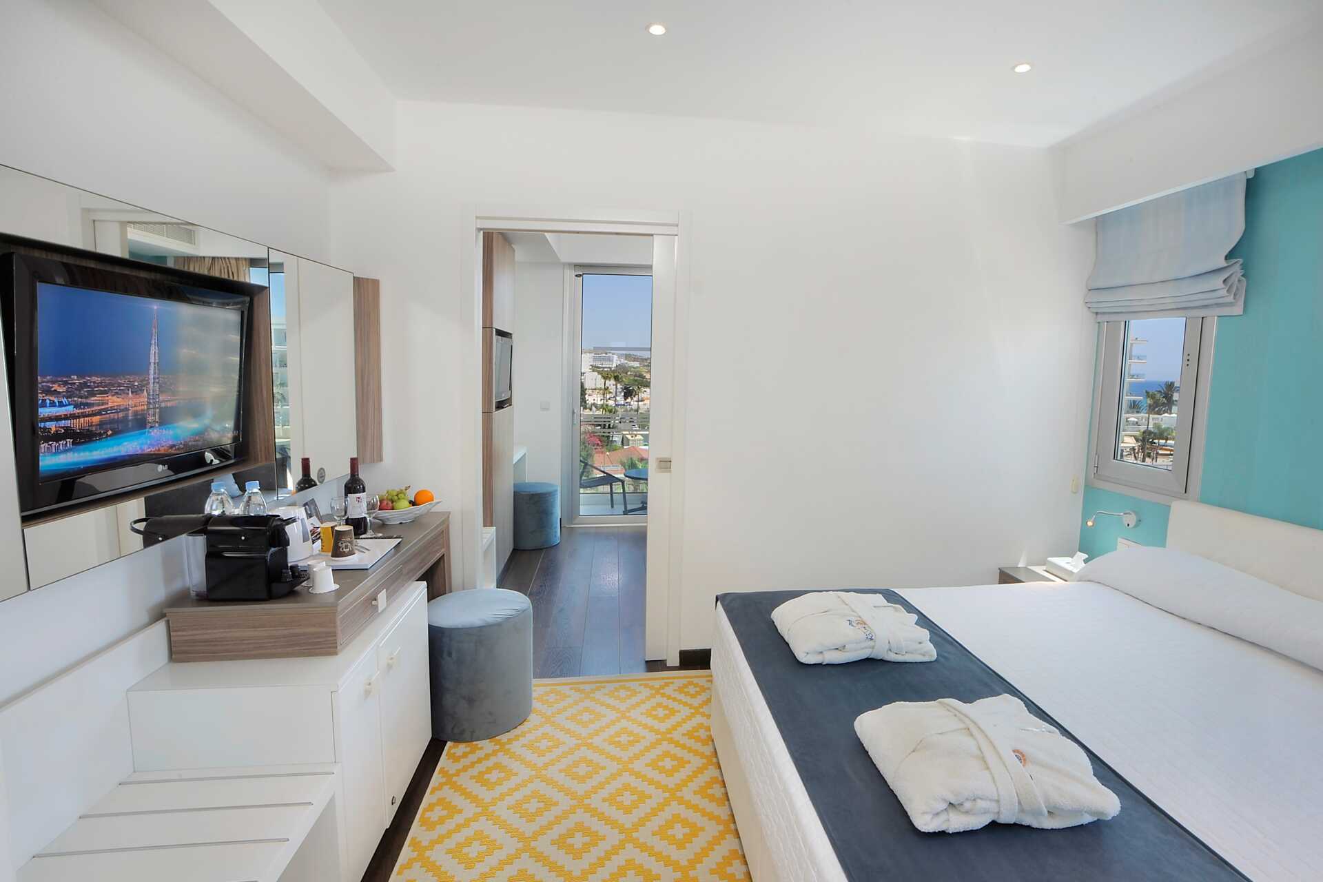 Juniorsviittejä parvekkeella ja rajoitetulla merinäköalalla. Juniorsviitti koostuu makuuhuoneesta, jossa on oleskelutila. Parivuode. Lisävuodemahdollisuus vuodesohvasta. Joissakin huoneissa makuutila on erotettu oleskelutilasta liukuovilla. Maksuton wifi, ilmastointi ja tallelokero. Jääkaappi. Vedenkeitin, kahvia ja teetä. Nespresso-kahvinkeitin - kapselit mukana ja täytetään päivittäin. Tv kansainvälisillä kanavilla. Hedelmät ja viini odottavat huoneessa saavuttaessa. Kylpytakit ja tossut. Hiustenkuivain. Kylpyhuoneessa suihku ja wc. Siivous 7 krt/viikko. Alle 2-vuotiaat lapset lasketaan lisävuoteella majoittuviksi henkilöiksi.