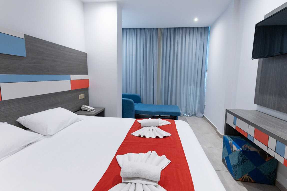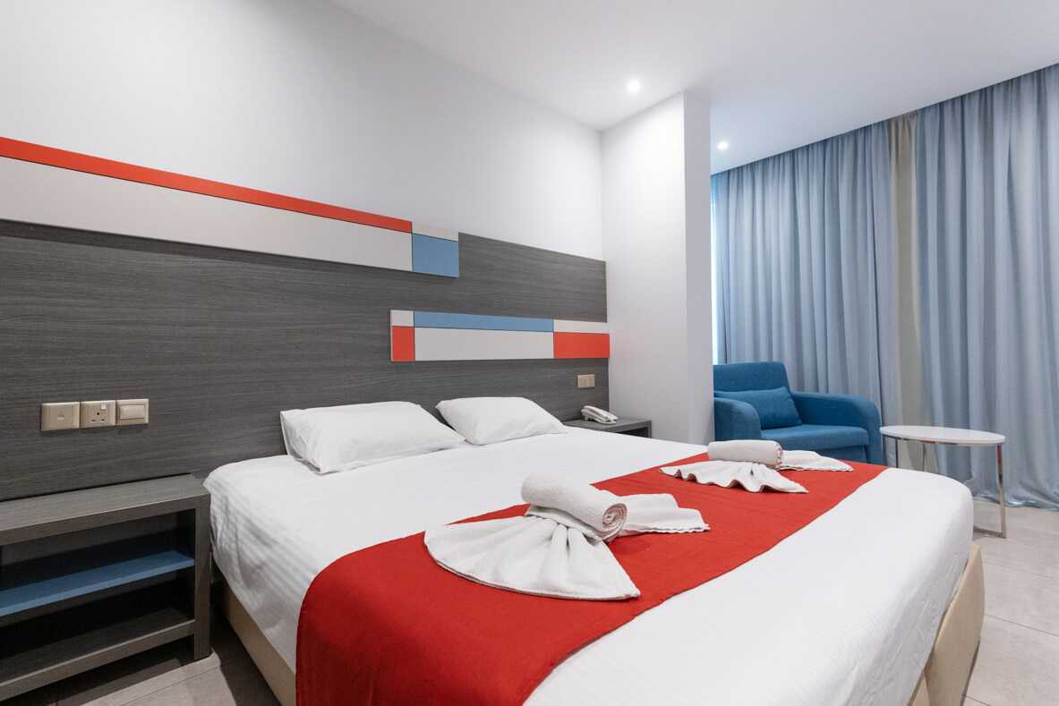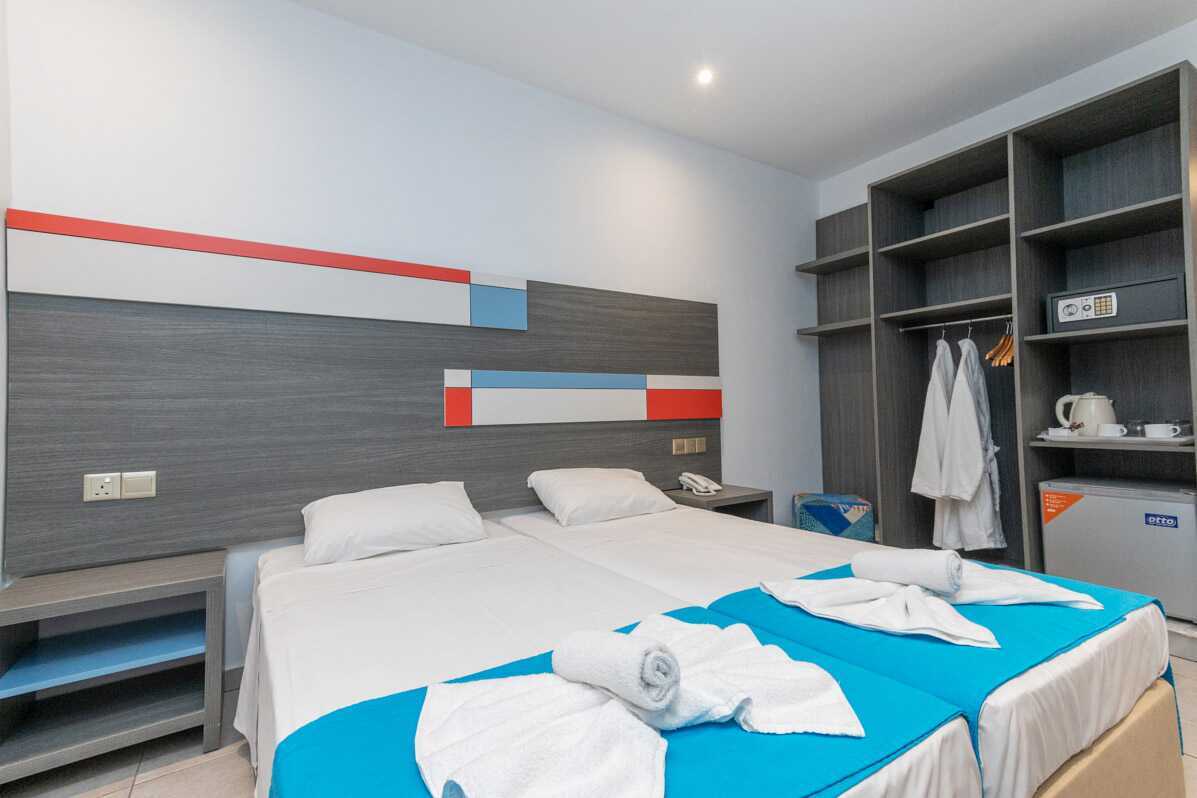 Superior-huone parvekkeella. Parivuode tai kaksi yhden hengen sänkyä. Lisävuodemahdollisuus kokoontaitettavassa sängyssä tai nojatuolissa. Maksuton wifi, ilmastointi ja tallelokero. Jääkaappi. Tv kansainvälisillä kanavilla. Hiustenkuivain. Kylpyhuoneessa suihku ja wc. Siivous 7 krt/viikko. Alle 2-vuotiaat lapset lasketaan lisävuoteella majoittuviksi henkilöiksi.