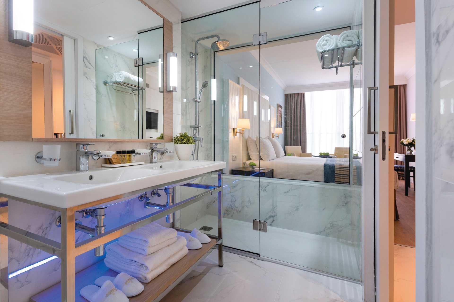 Sviittejä, joissa on parveke allasnäkymällä. Parivuode. Maksuton wifi, ilmastointi ja tallelokero. Jääkaappi. Pullo vettä, täytetään päivittäin. Vedenkeitin, teetä ja kahvia. Tv kansainvälisillä kanavilla. Kylpytakit ja tossut. Hiustenkuivain. Kylpyhuone, jossa on jacuzzi, suihku ja wc. Siivous 7 krt/viikko.