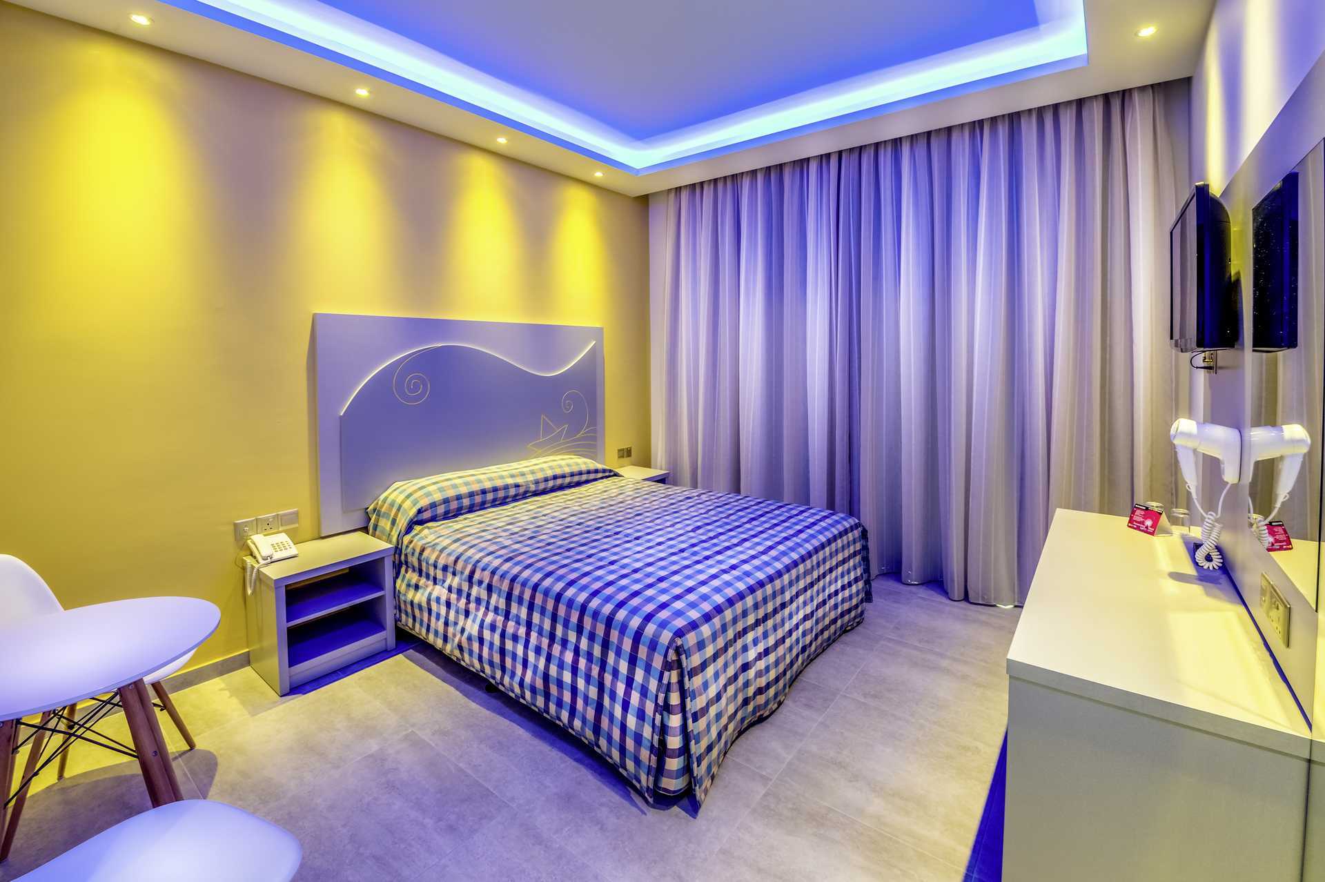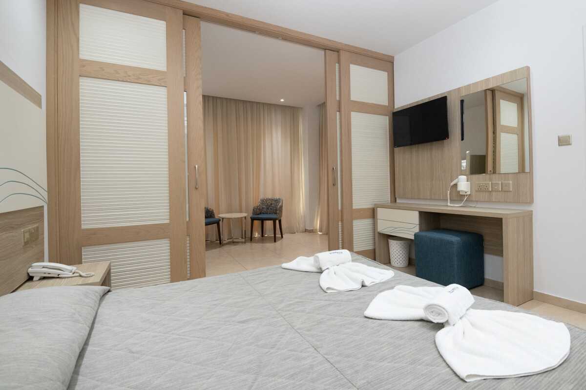 Perhesviitti parvekkeella ja merinäköalalla. Sviitti koostuu makuuhuoneesta ja olohuoneesta, jotka voidaan erottaa liukuovella. Parivuode tai kaksi yhden hengen sänkyä. Lisävuodemahdollisuus kerrossängystä. Maksuton ilmastointi ja wifi. Tallelokero lisämaksusta. Jääkaappi. Vedenkeitin, kahvia ja teetä. Tv kansainvälisillä kanavilla. Hiustenkuivain. Kylpyhuoneessa kylpyamme tai suihku ja wc. Siivous 7 krt/viikko.