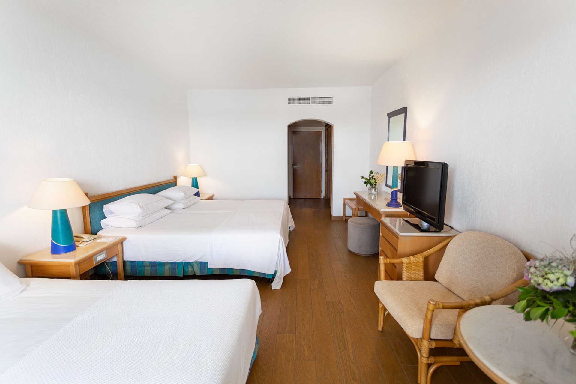Deluxe-huone parvekkeella ja merinäköalalla. Parivuode tai kaksi yhden hengen sänkyä. Lisävuodemahdollisuus vuodesohvasta. Maksuton wifi, ilmastointi ja tallelokero. Kattotuuletin. Minibaari lisämaksulla. Vedenkeitin, kahvia ja teetä. Tv kansainvälisillä kanavilla. Hiustenkuivain. Amme ja wc. Siivous 7 krt/viikko. Alle 2-vuotiaat lapset lasketaan lisävuoteella majoittuviksi henkilöiksi.