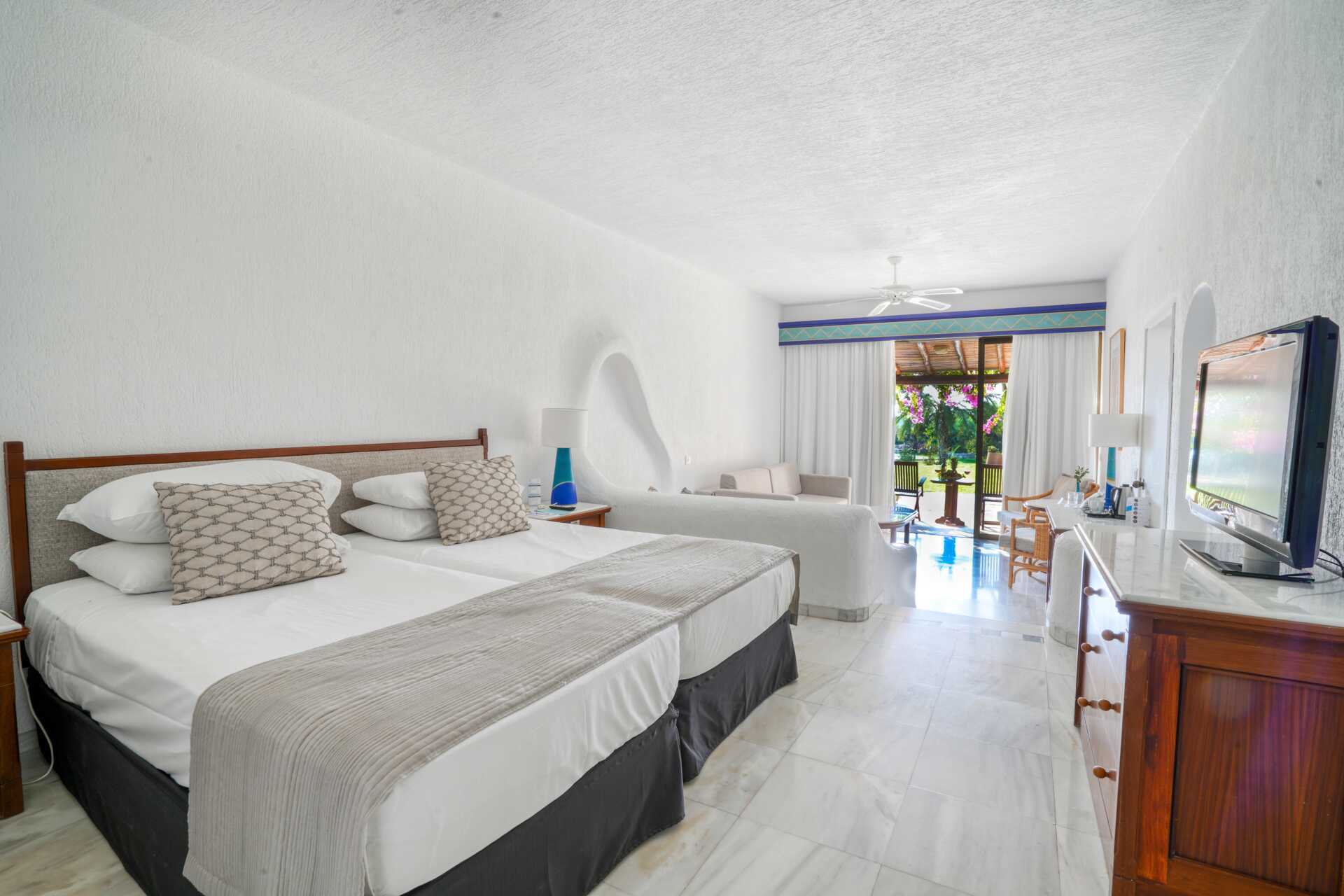 Garden Room maaterassilla. Terassilla on kaksi aurinkotuolia sekä pöytä ja tuolit, puutarha on suoraan ulkona. Parivuode tai kaksi yhden hengen sänkyä. Lisävuodemahdollisuus vuodesohvalla. Huoneessa on yhden tai kahden askelman tasoeroja. Maksuton wifi, ilmastointi ja tallelokero. Kattotuuletin. Minibaari lisämaksulla. Vedenkeitin, kahvia ja teetä. Tv kansainvälisillä kanavilla. Hiustenkuivain. Amme ja wc. Siivous 7 krt/viikko. Alle 2-vuotiaat lapset lasketaan lisävuoteella majoittuviksi henkilöiksi.
