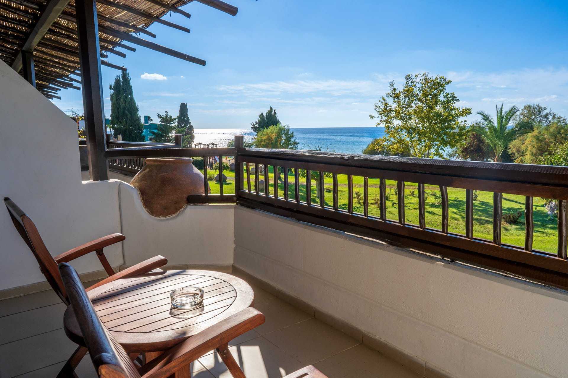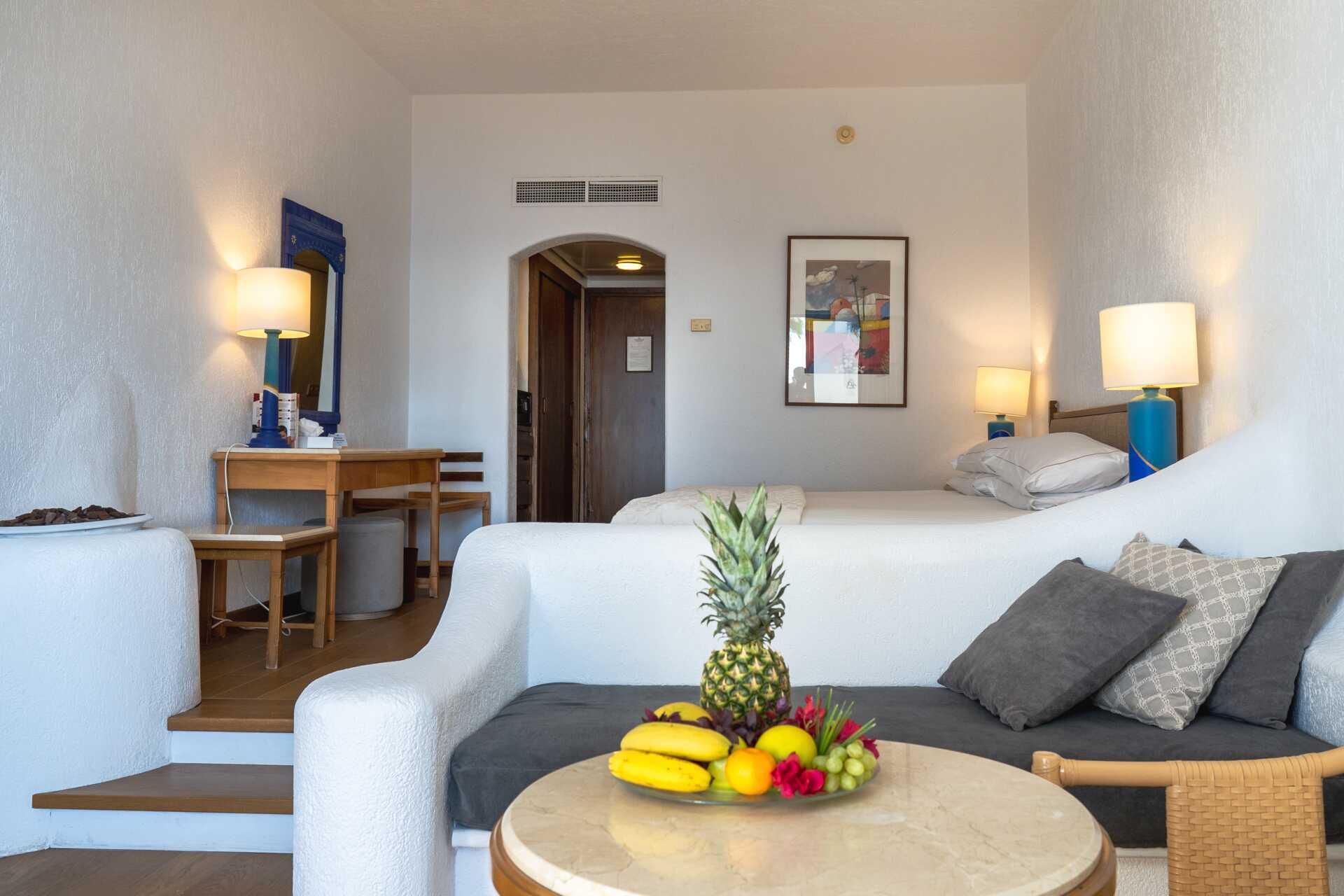 Sviitti maaterassilla. Sviitti sijaitsee sekä puutarhan että meren äärellä. Muutama askelma erottaa makuuhuoneen olohuoneesta. Parivuode ja yhden hengen vuode. Lisävuodemahdollisuus vuodesohvasta. Maksuton wifi, ilmastointi ja tallelokero. Minibaari lisämaksulla. Vedenkeitin, kahvia ja teetä. Tv kansainvälisillä kanavilla. Hiustenkuivain. Amme ja wc. Siivous 7 krt/viikko. Alle 2-vuotiaat lapset lasketaan lisävuoteella majoittuviksi henkilöiksi.
