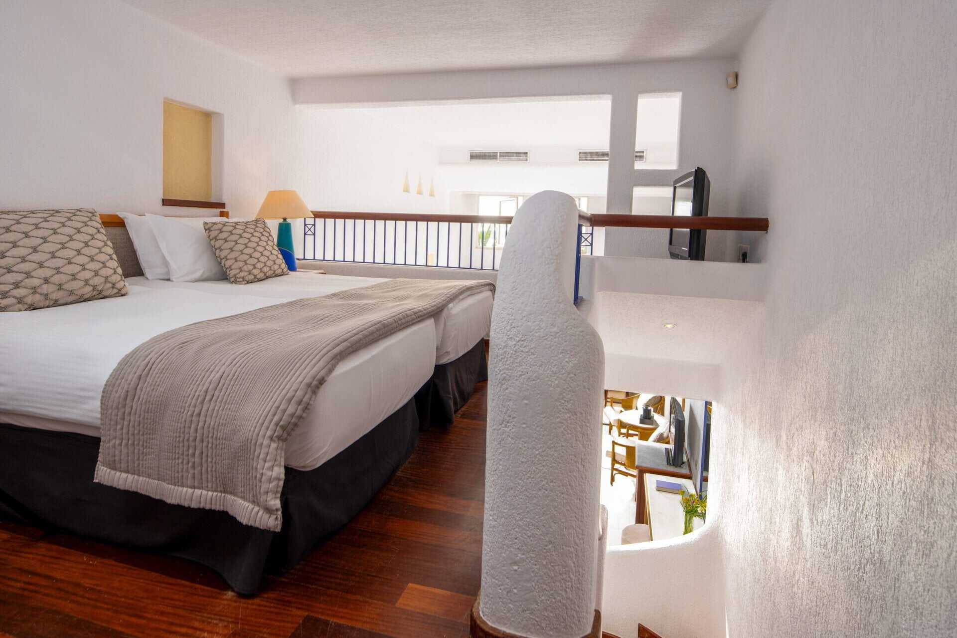 Perhehuone parvekkeella ja merinäköalalla. Sisääntulokerroksessa on olohuone parvekkeella, kaksi erillistä sänkyä, vuodesohva, TV kansainvälisillä kanavilla ja kylpyhuone, jossa on hiustenkuivaaja, kylpyamme ja wc. Yläkerrassa on makuuparvi, jossa kaksi erillistä sänkyä, TV kansainvälisillä kanavilla ja kylpyhuone hiustenkuivaajalla, kylpyammeella ja wc:llä. Maksuton wifi, ilmastointi ja tallelokero. Minibaari lisämaksulla. Vedenkeitin, kahvia ja teetä. Siivous 7 krt/viikko. Alle 2-vuotiaat lapset lasketaan lisävuoteella majoittuviksi henkilöiksi.