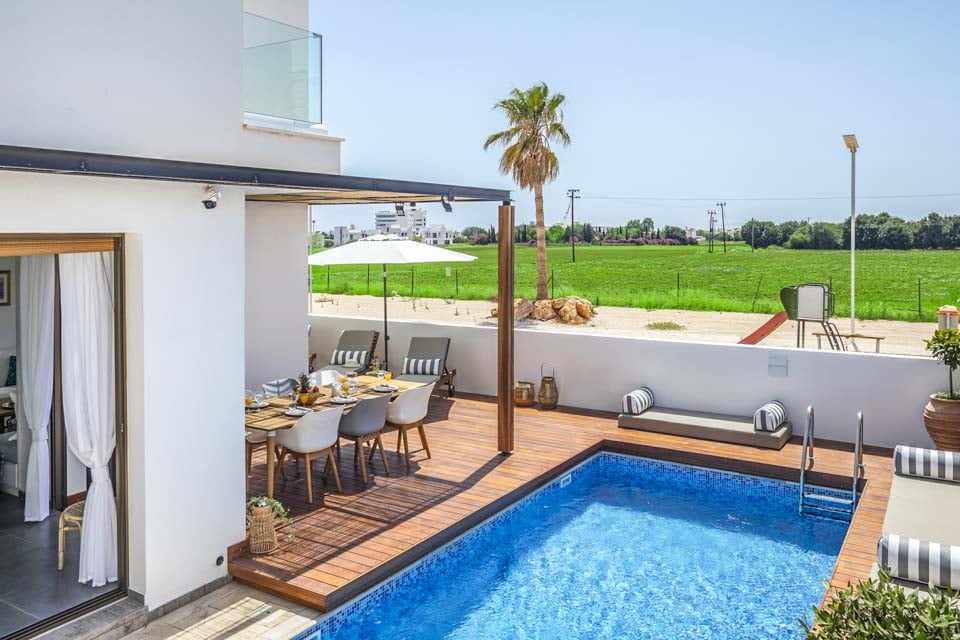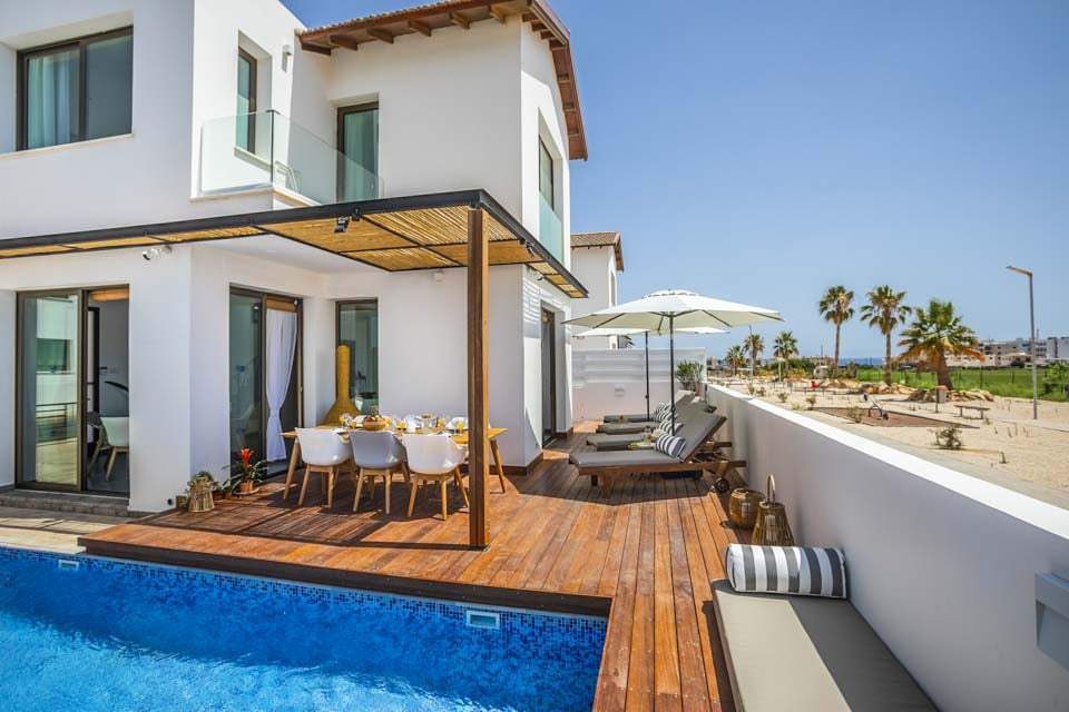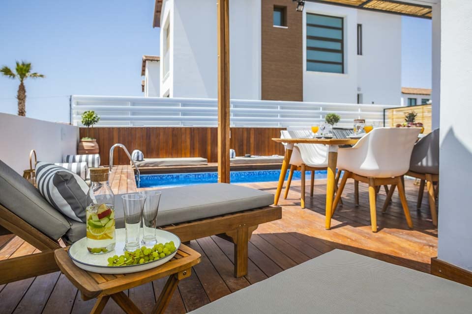 Sisätiloissa tämä moderni kiinteistö on täynnä viehätystä ja boheemityylistä kalustusta. Viihtyisä olohuone, josta on lasiovet, avautuu ruokailutilaan ja täysin varusteltuun keittiöön, jossa on astianpesukone ja pyykinpesukone. Portaat johtavat ensimmäiseen kerrokseen, josta löytyy kolme makuuhuonetta. Yksi on päämakuuhuone, jossa on oma kylpyhuone ja king-size-vuode, kun taas muut kahden hengen huoneet jakavat erillisen perhekylpyhuoneen. Kaikissa makuuhuoneissa on ilmastointi ja taulutelevisio.