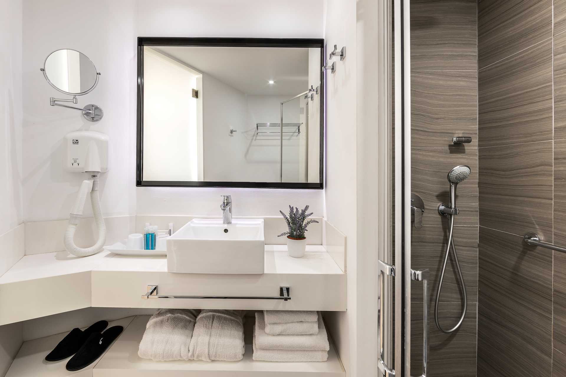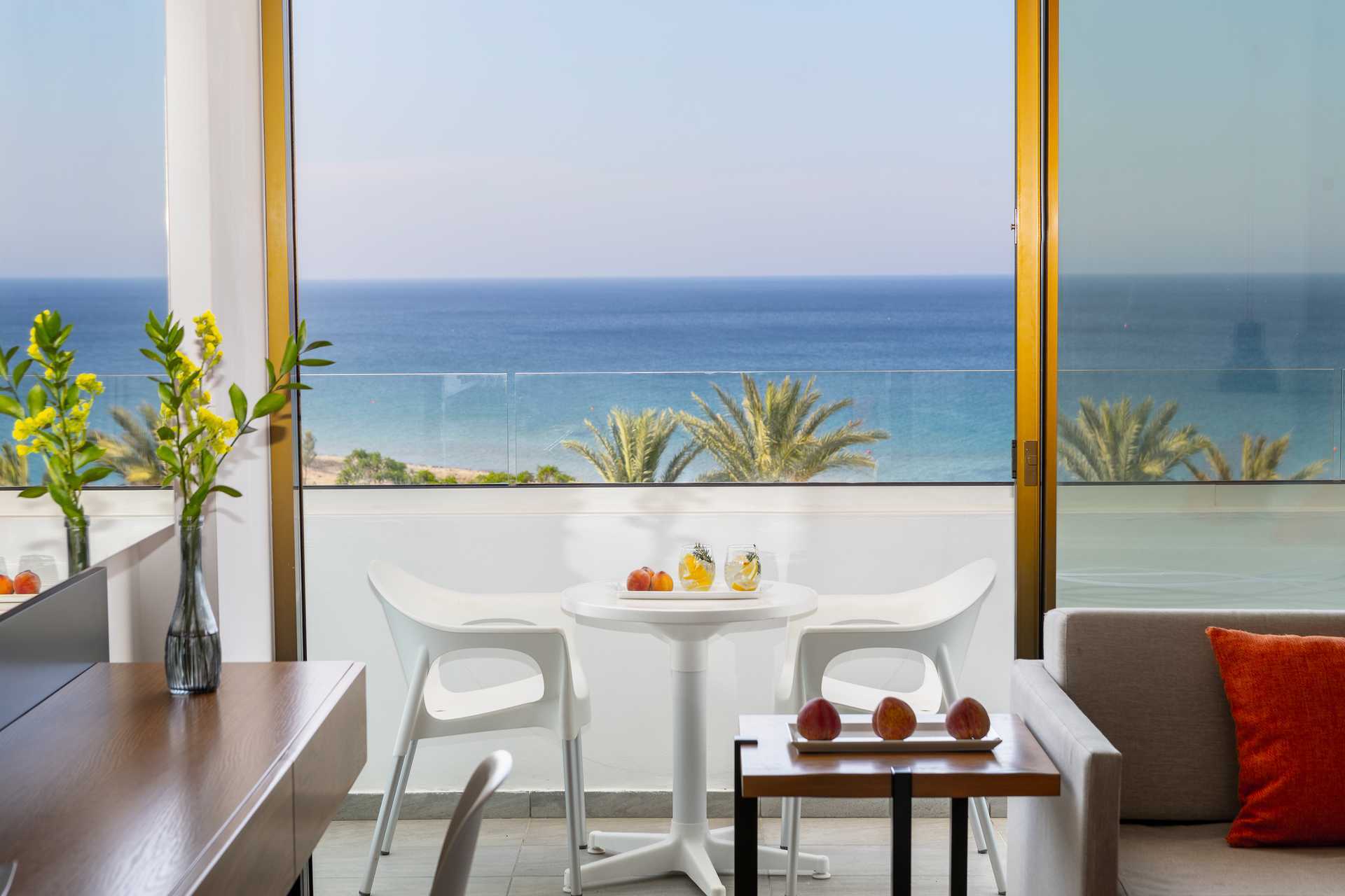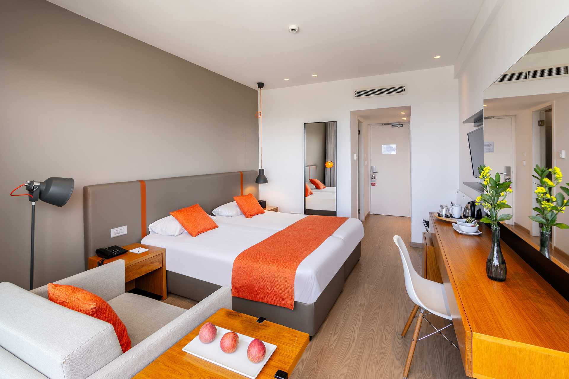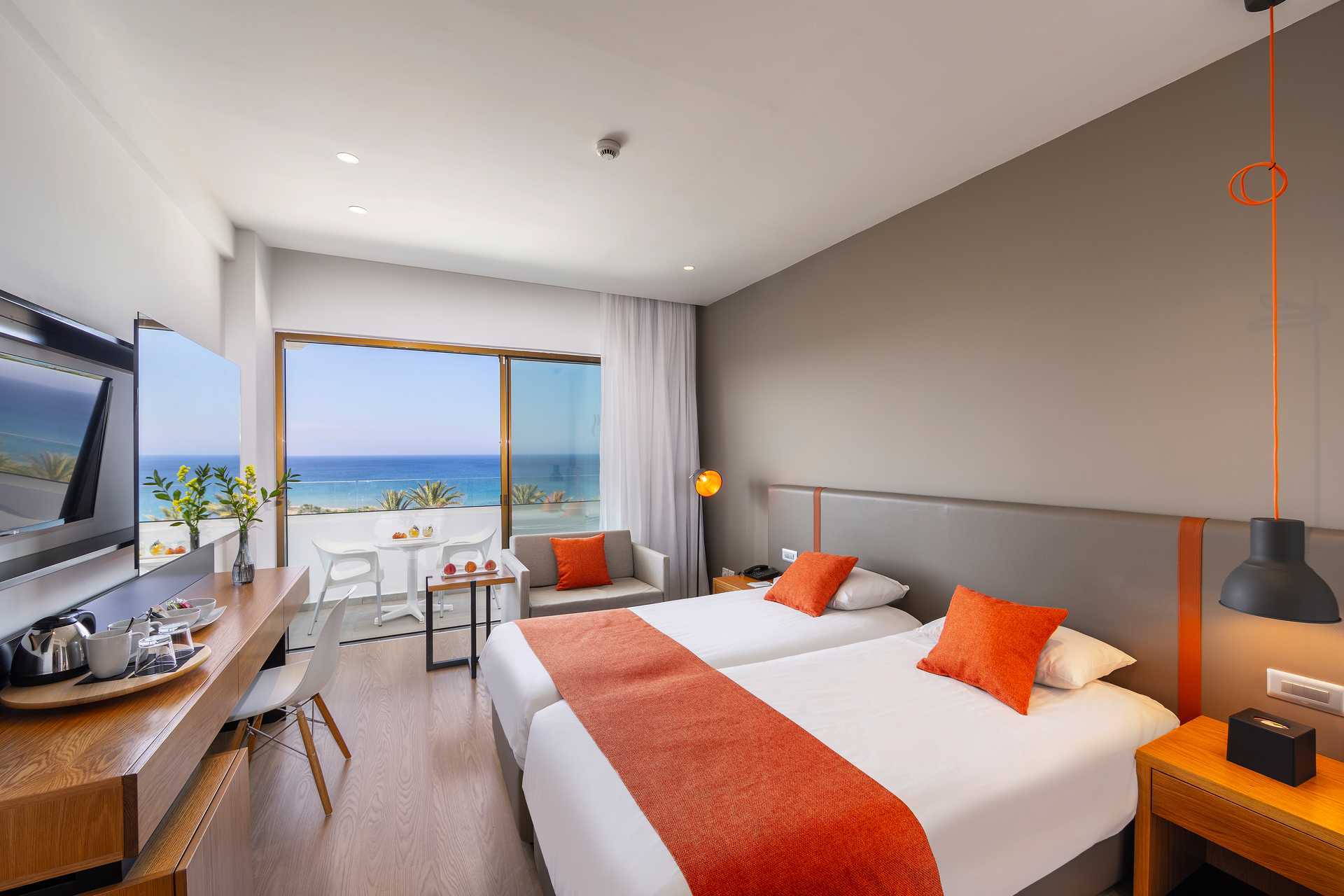 Kahden hengen huone parvekkeella ja merinäköalalla tai rajoitetulla merinäköala. Parivuode tai kaksi yhden hengen sänkyä. Lisävuodemahdollisuus vuodesohvasta. Tyynymenu. Maksuton wifi, ilmastointi ja tallelokero. Pieni jääkaappi. Vedenkeitin, kahvia ja teetä. Tv kansainvälisillä kanavilla. Rantakassi. Kylpytakit ja tossut. Hiustenkuivain. Kylpyhuoneessa suihku tai kylpyamme ja wc. Siivous 7 krt/viikko. Alle 2-vuotiaat lapset lasketaan lisävuoteella majoittuviksi henkilöiksi.