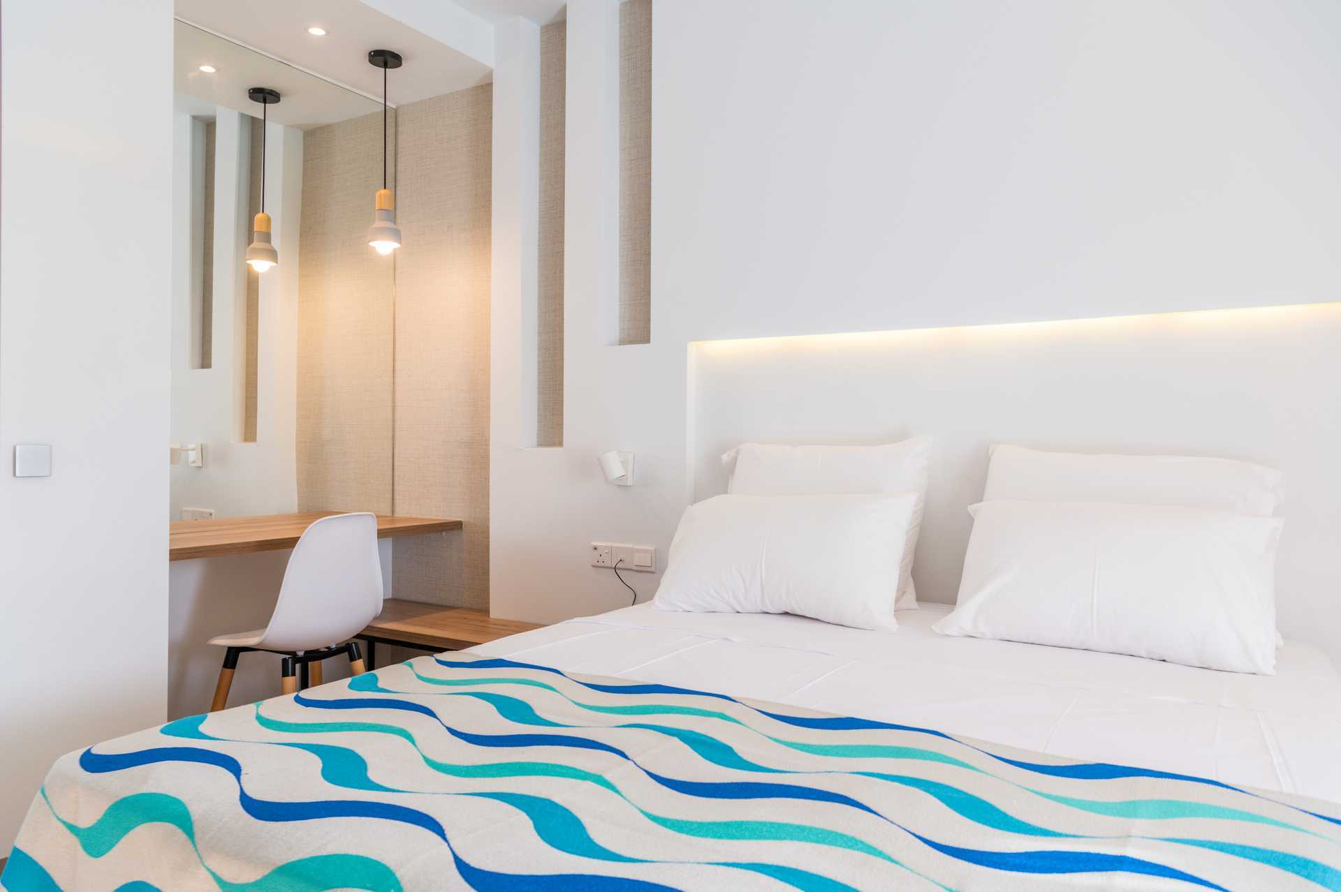 Kaksioita parvekkeella tai maaterassilla. Yhdistetty olohuone ja minikeittiö sekä erillinen makuuhuone. Parivuode tai kaksi erillistä sänkyä ja mahdollisuus lisävuoteeseen sohvasta. Minikeittiö, jossa jääkaappi, mikro, keittolevyt ja yksinkertainen keittovarustus. Kahvin ja teen keittomahdollisuus. Tv satelliittikanavilla. Maksuton wifi ja ilmastointi ja tallelokero. Hiustenkuivain. Kylpyamme tai suihku ja wc. Siivous 6 krt/viikko.