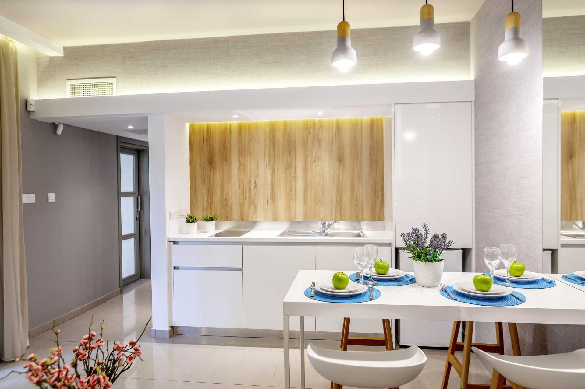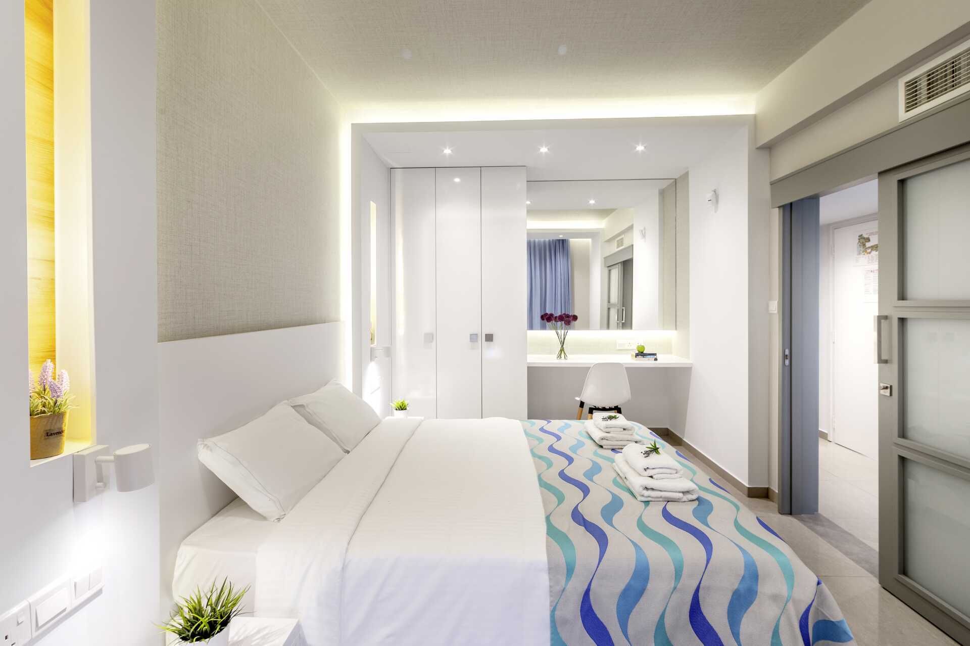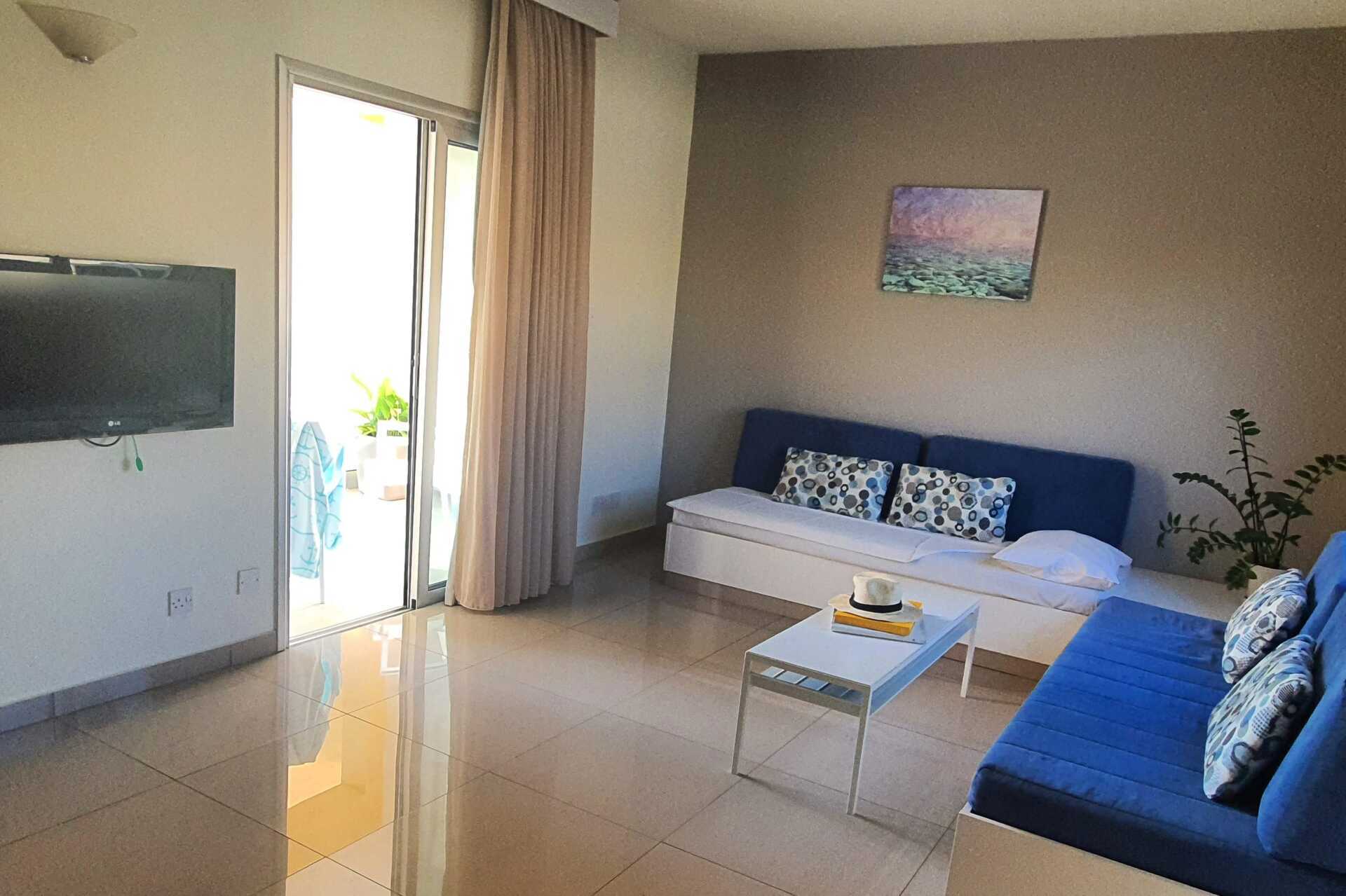 Kolmio parvekkeella tai terassilla. Kaksi makuuhuonetta ja yhdistetty olohuone/minikeittiö. Parivuode tai kaksi yhden hengen vuodetta. Mahdollisuus lisävuoteeseen sohvasta. Minikeittiö, jossa liesi, jääkaappi, mikro, teen ja kahvin keittomahdollisuus ja yksinkertainen keittovarustus. Maksuton wifi, ilmastointi ja tallelokero. Tv satelliittikanavilla. Hiustenkuivain. Kaksi kylpyhuonetta, jossa on kylpyamme tai suihku ja sekä wc. Siivous 6 krt/viikko.
