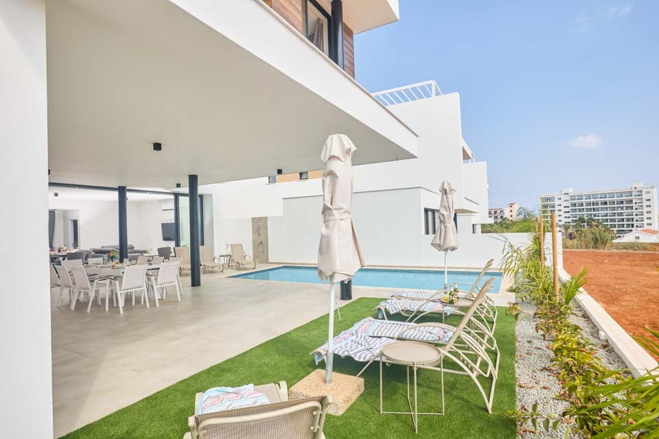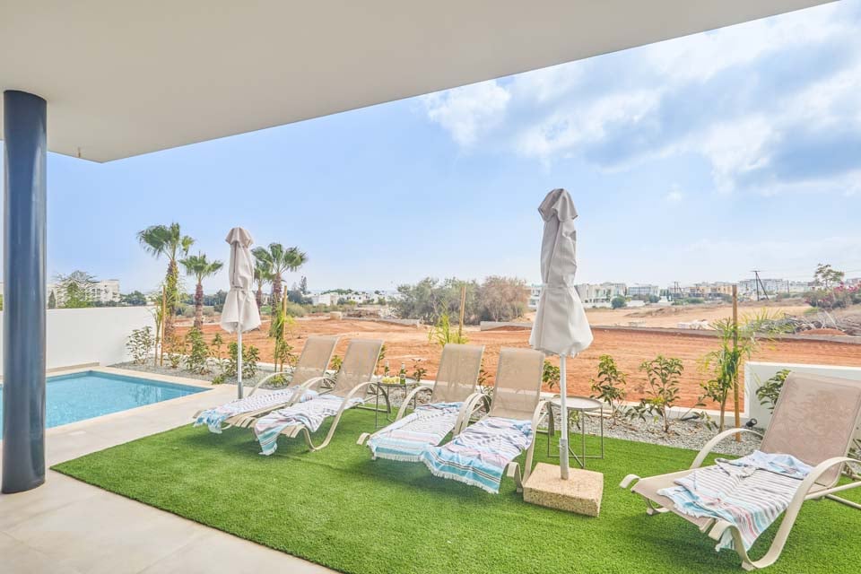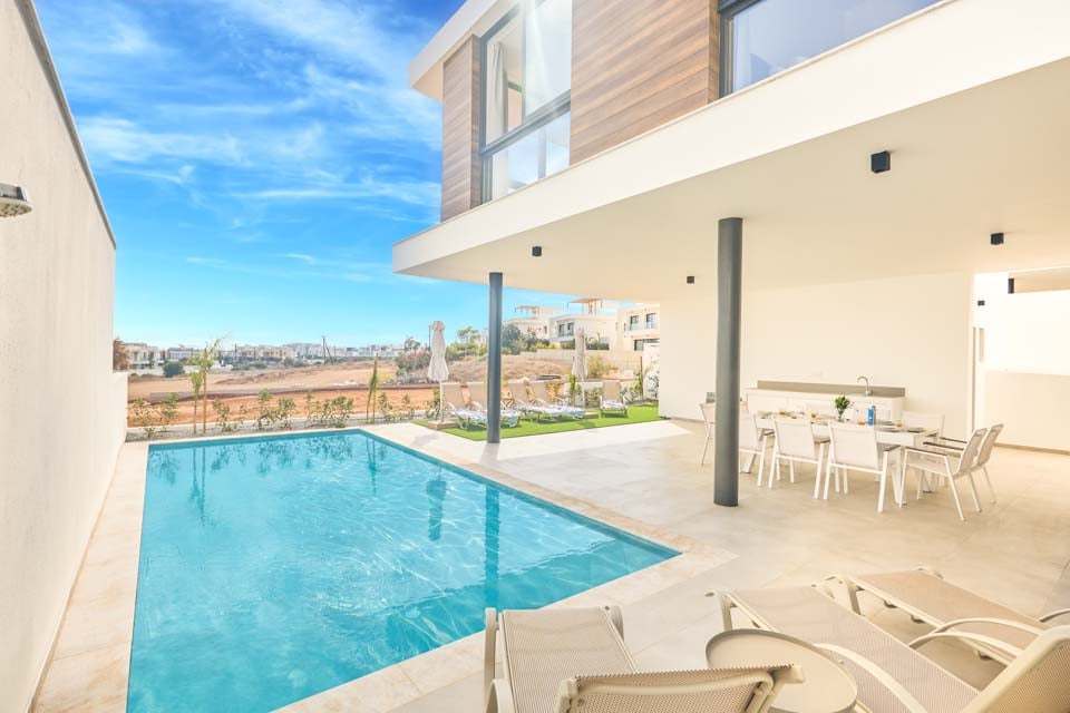 Sisällä huvilassa on viisi kauniisti suunniteltua makuuhuonetta sekä viisi suihkuhuonetta, jotka takaavat yksityisyyden ja mukavuuden kaikille vieraille. Avoimet oleskelu- ja ruokailutilat ovat valoisia ja tyylikkäitä, ja niistä on suora yhteys ulkoterassille, jossa voit rentoutua, ruokailla ulkona tai nauttia Kyproksen auringosta.