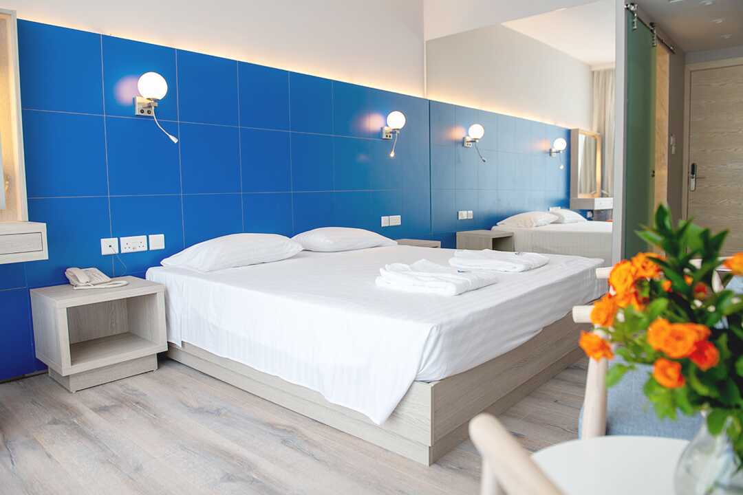 Kahden hengen huone parvekkeella ja merinäköalalla. Parivuode tai kaksi yhden hengen sänkyä. Mahdollisuus lisävuoteeseen nojatuolissa tai kokoontaitettavassa sängyssä. Maksuton wifi, ilmastointi ja tallelokero. Minibaari. Tv kansainvälisillä kanavilla. Hiustenkuivain. Kylpyhuoneessa suihku ja wc. Siivous 7 krt/viikko. Alle 2-vuotiaat lapset lasketaan lisävuoteella majoittuviksi henkilöiksi.