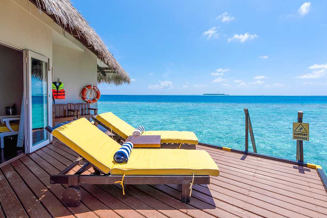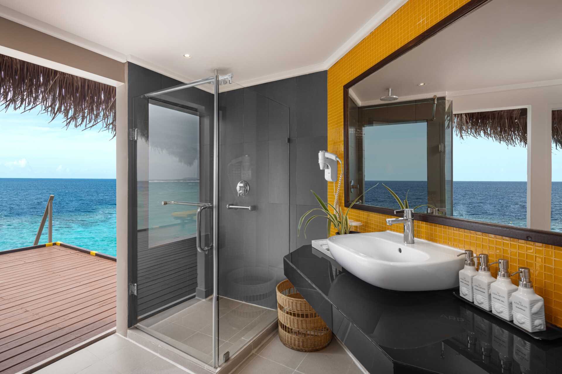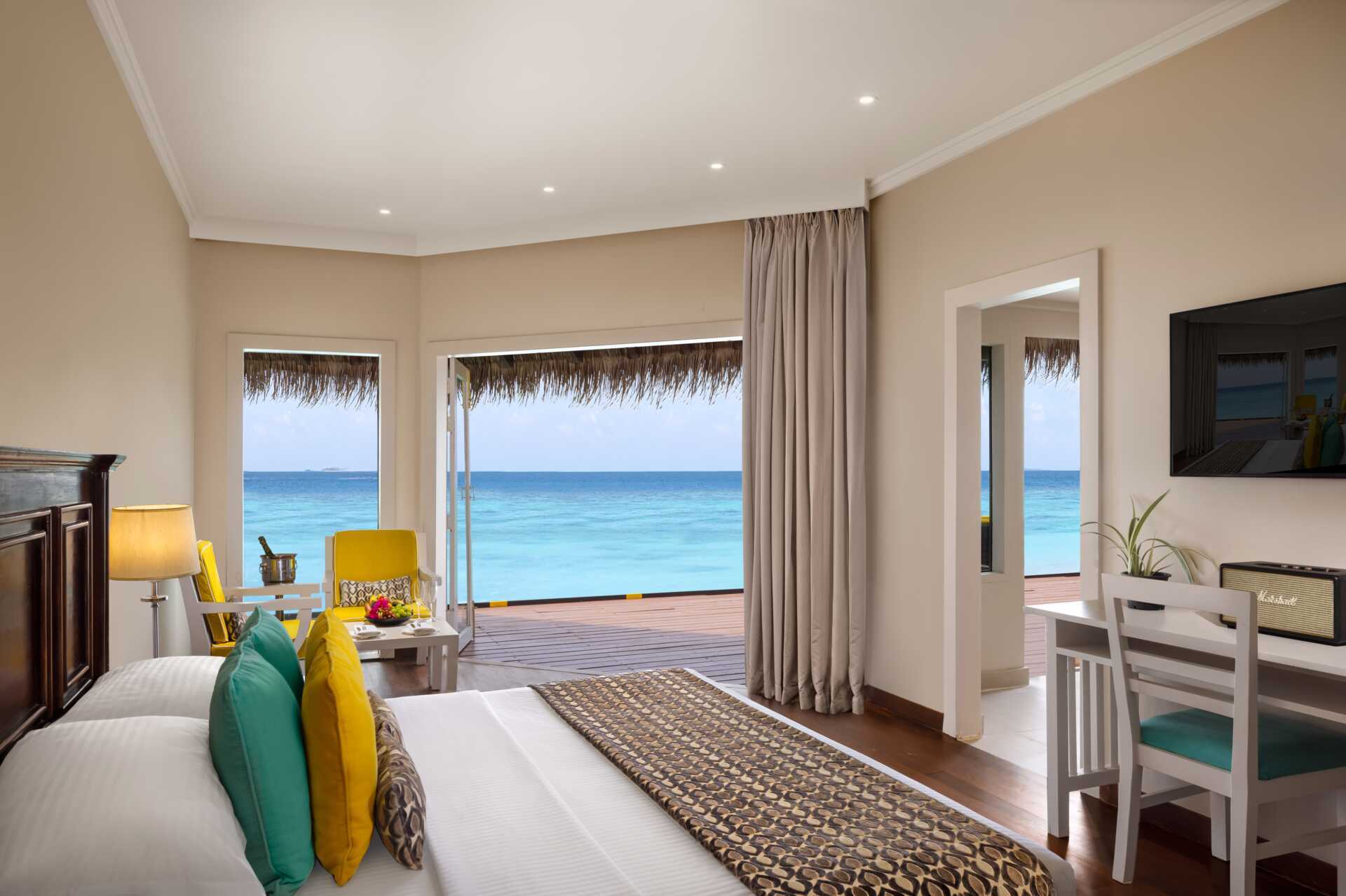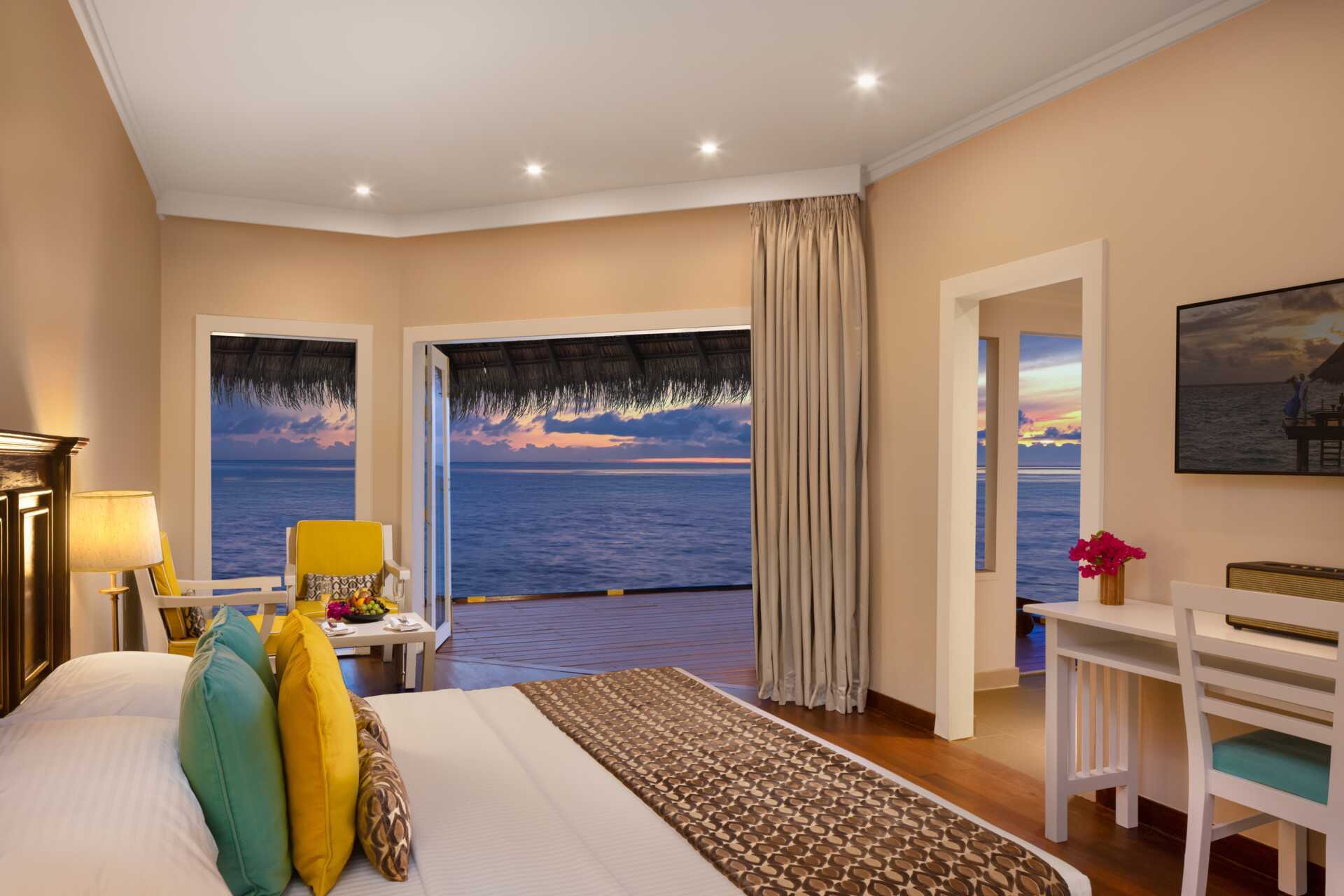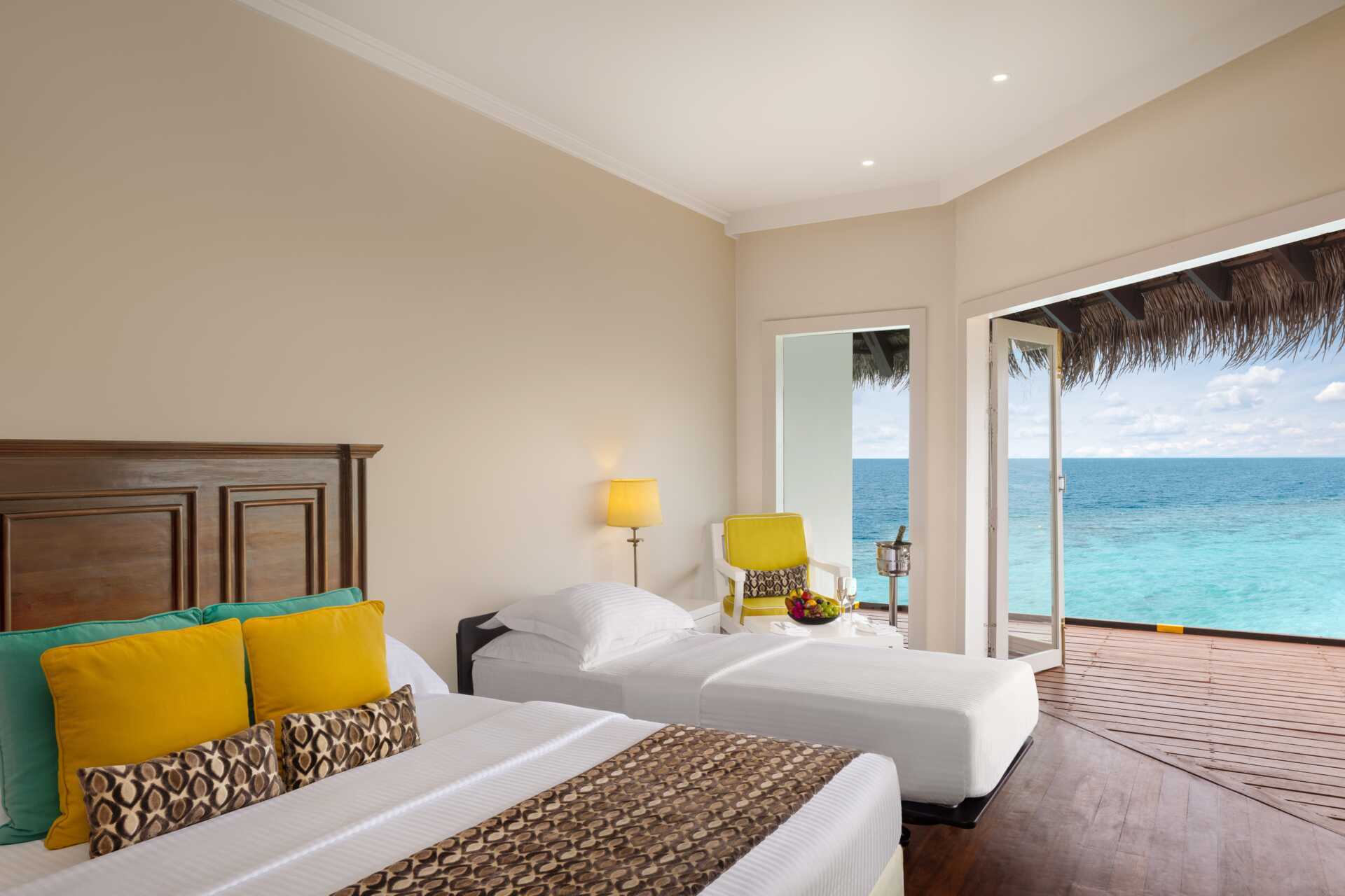 Water villa, jossa on aurinkoterassi, aurinkotuoleja ja tikkaat suoraan Intian valtamerelle. Parivuode. Lisävuodemahdollisuus yhdelle hengelle. Maksuton wifi, ilmastointi ja tallelokero. Jääkaappi. Vedenkeitin, kahvia ja teetä. Tv kansainvälisillä kanavilla. Hiustenkuivain. Suihku ja wc. Siivous 7 krt/viikko.