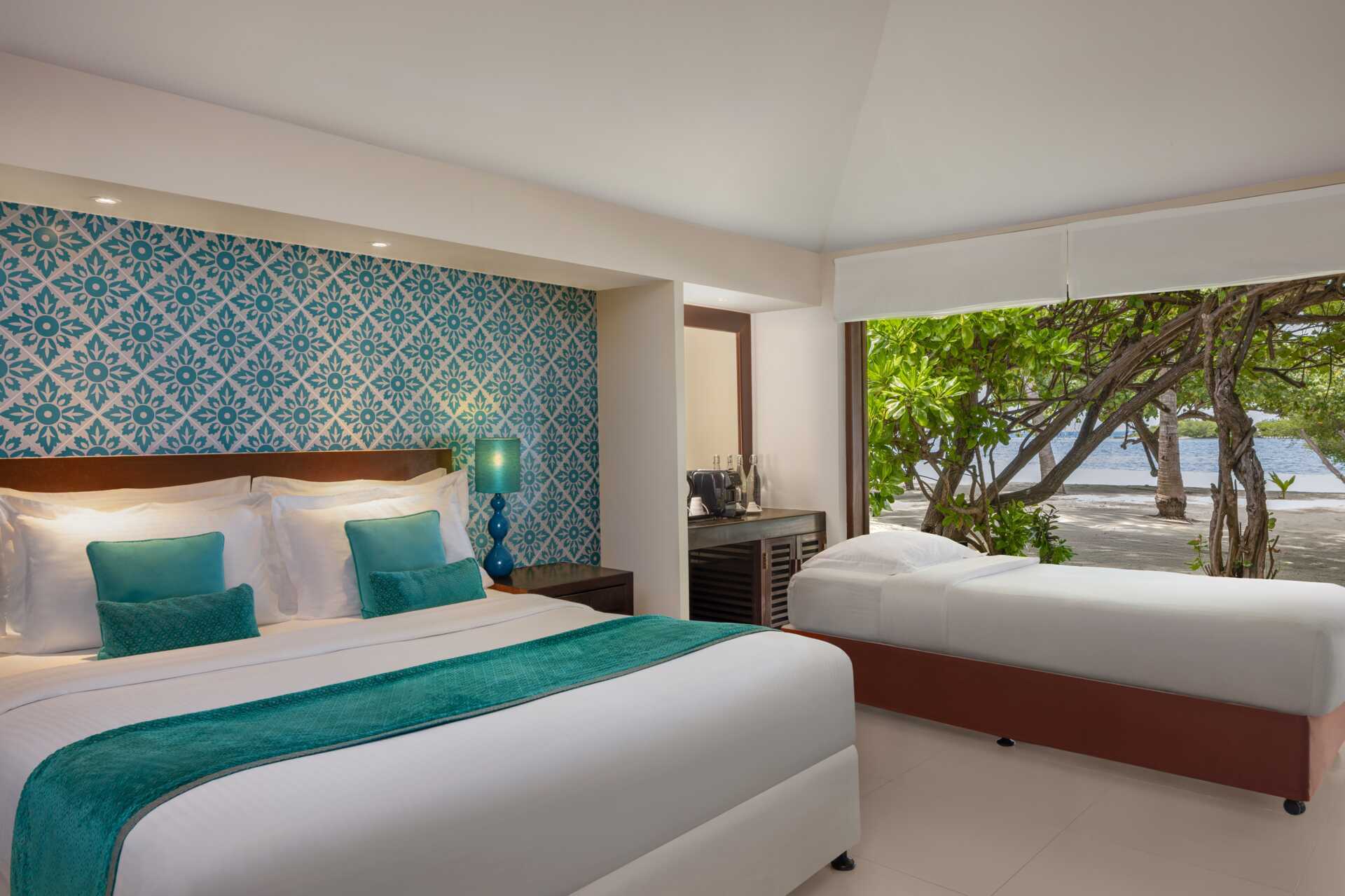 Huvila, Seafront maaterassilla Huvilat sijaitsee rannalla. Parivuode. Lisävuodemahdollisuus yhdelle aikuiselle tai kahdelle lapselle. Maksuton wifi, ilmastointi ja tallelokero. Minibaari sisältyy (limsaa, mehua ja kaksi pulloa vettä) ja se täytetään päivittäin. Nespresso-keitin kapseleineen. Vedenkeitin, kahvia ja teetä. Tv kansainvälisillä kanavilla. Rantakassi ja varvassandaalit. Kylpyamme tai suihku ja wc. Siivous 7 krt/viikko.