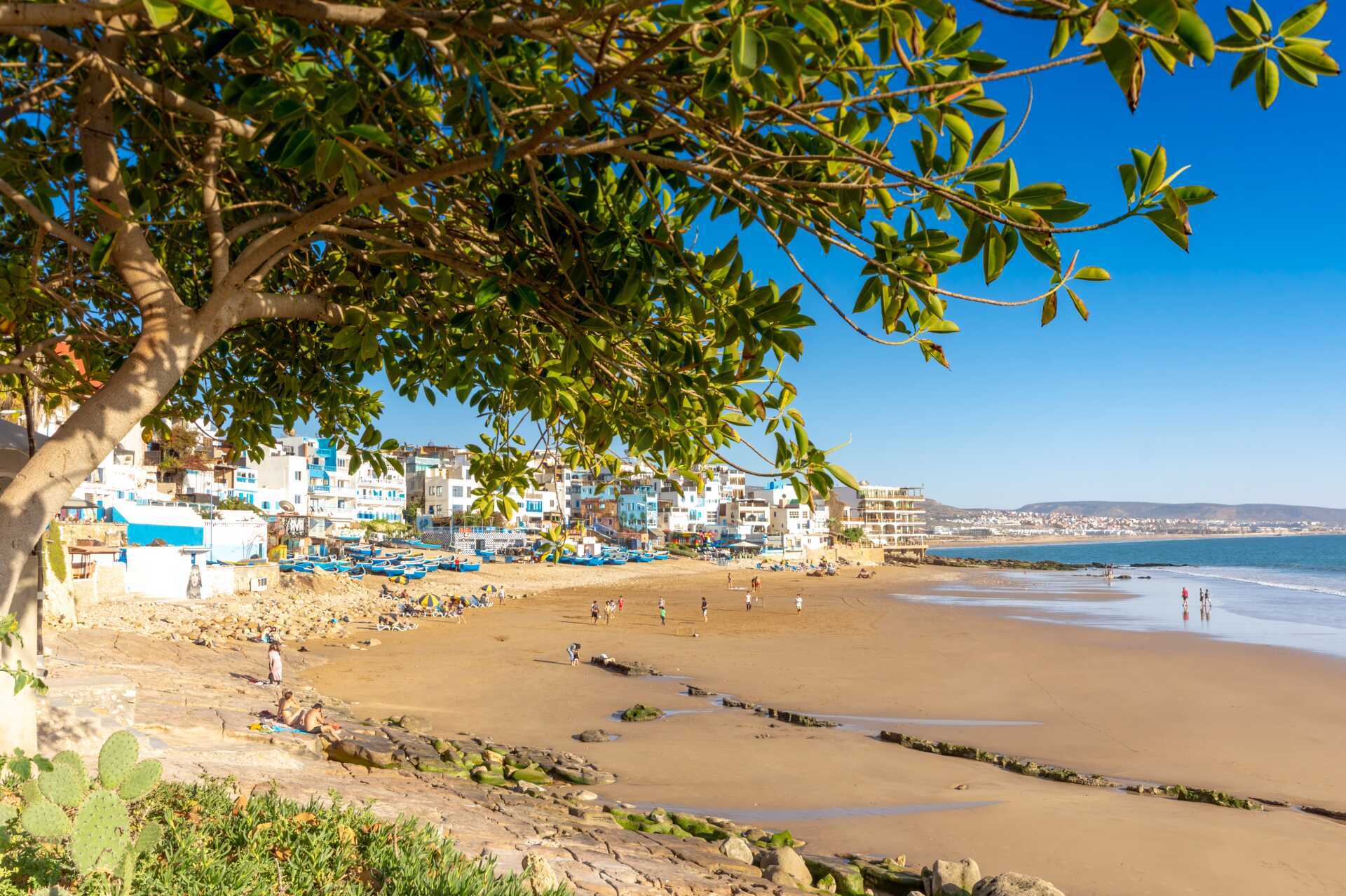 Taghazoutissa aurinko paistaa melkein koko ajan, ja pieni kylä rannikolla houkuttelee todella mukavilla rannoilla, jotka tarjoavat sekä aurinkoa että kylpyä, mutta myös maailmanluokan surffausta! Niille, jotka haluavat rentoutua auringossa, on vuokrattavissa aurinkotuoleja ja -varjoja. Joten etsitpä seikkailua aaltojen keskellä tai haluat vain rentoutua hyvän kirjan parissa aurinkotuolissa, Taghazout tarjoaa rantoja, jotka sopivat useimmille ihmisille!