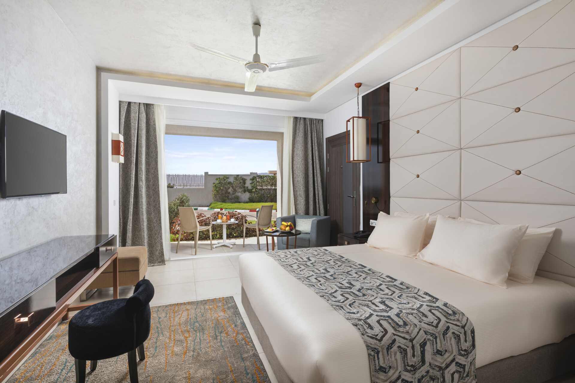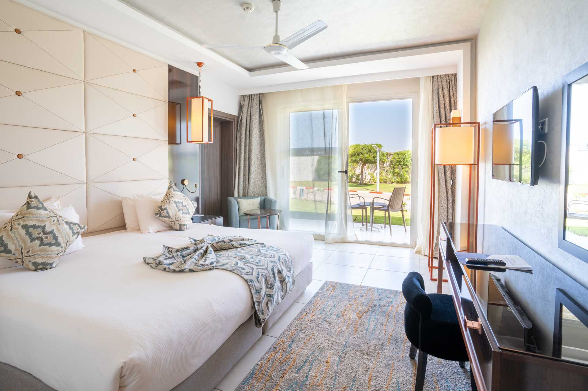 Deluxe-huoneissa on parveke, joista osasta on merinäköala, rajoitettu merinäköala tai näkymä uima-altaalle. Yksi parivuode tai kaksi erillistä vuodetta. Maksuton wifi, ilmastointi ja tallelokero. Minibaari - sisältyy hintaan ja täytetään joka päivä virvoitusjuomilla. Vedenkeitin, kahvia ja teetä. Kahvinkeitin - kapselit mukana. Tv kansainvälisillä kanavilla. Hiustenkuivain. Kylpyhuoneessa suihku ja wc. Siivous 7 krt/viikko.