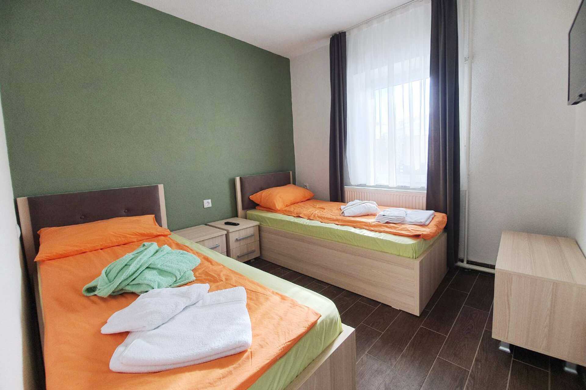 Kahden hengen huoneen voi varata yhdelle henkilölle, mutta se jaetaan aina toisen osallistujan kanssa. Huoneissa on kaksi erillistä sänkyä tai parivuode. Ei lisävuodemahdollisuutta. Maksuton wifi. Suihku ja wc.