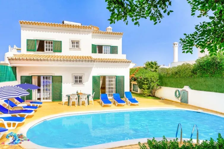 Tämä perinteinen valkoiseksi kalkittu huvila kauniine vihreine ikkunaluukkuineen on portugalilaisen muotoilun ruumiillistuma. Aurinkoisella terassilla sijaitsevan suuren uima-altaan keskellä sijaitseva majoituspaikka tarjoaa runsaasti tilaa kymmenelle aikuiselle nauttia auringosta päivällä ja nauttia ulkoilma-aterioista illalla. Sisällä majoitus on jaettu kahteen tasoon. Hyvin varusteltu keittiö ja oleskelutila sijaitsevat pohjakerroksessa, samoin kuin kaksi viidestä ilmastoidusta makuuhuoneesta, joista yhdessä on oma suihkuhuone. Yläkerrassa on kaksi kahden hengen makuuhuonetta, jotka jakavat tilavan perhekylpyhuoneen, sekä yksi kahden hengen makuuhuone, jossa on oma kylpyhuone.