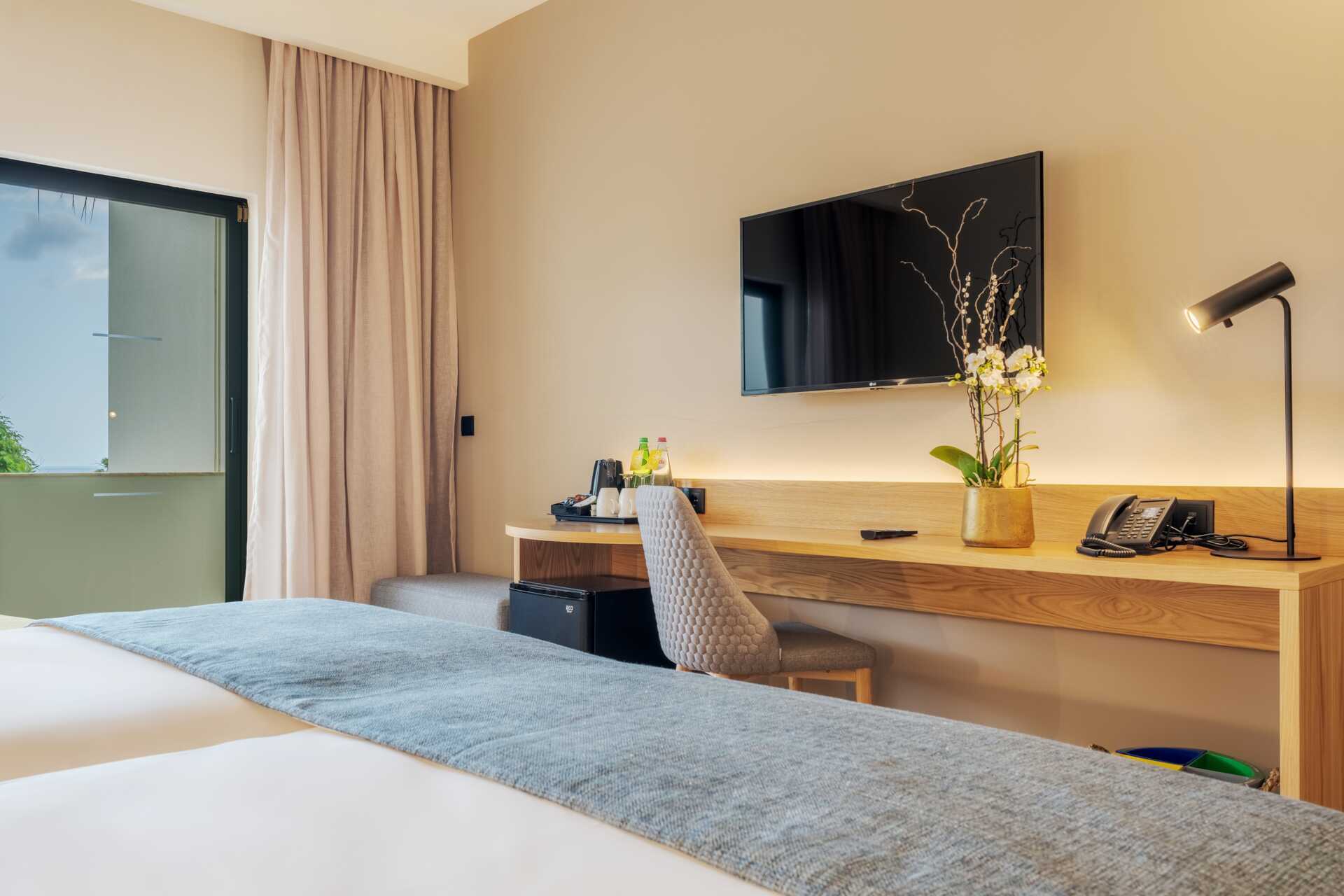Kahden hengen huoneita, joissa on parveke tai terassi rajoitetulla merinäköalalla. Parivuode tai kaksi yhden hengen vuodetta. Lisävuodemahdollisuus yhden hengen vuoteesta. Tyynymenu. Maksuton wifi, ilmastointi ja tallelokero. Jääkaappi. Vedenkeitin, kahvia ja teetä. Tv kansainvälisillä kanavilla. Hiustenkuivain. Suihku ja wc. Siivous 7 krt/viikko.