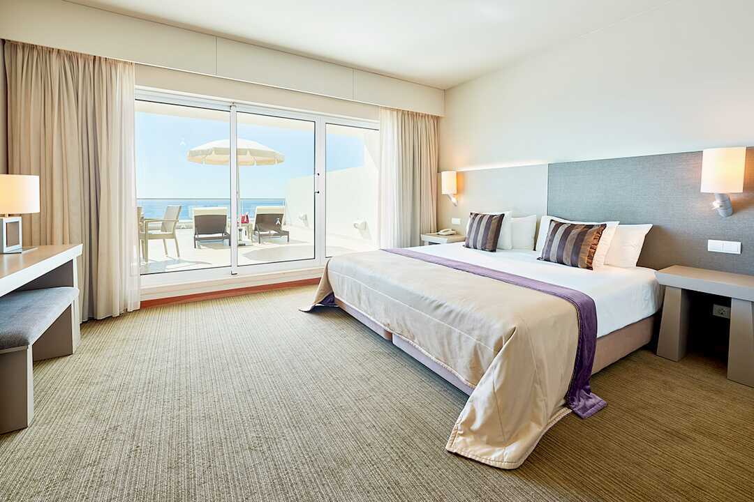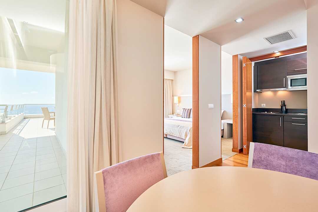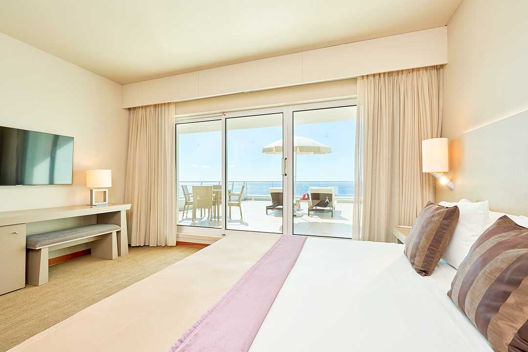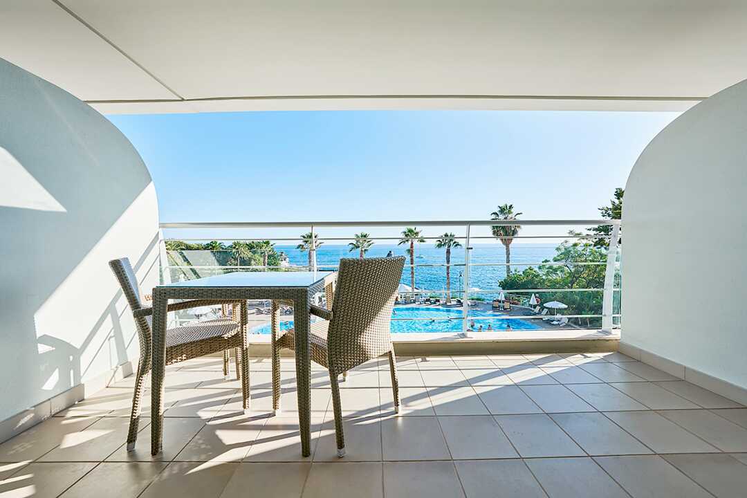 Sviitti jossa parveke tai terassi merinäköalalla. Sviitissä on makuuhuone, olohuonee minikeittiöllä ja iso terassi (32 neliömetriä), jossa on aurinkotuoleja, tuoleja ja pöytä. Parivuode tai kaksi yhden hengen sänkyä. Lisävuodemahdollisuus vuodesohvasta. Kokolattiamatto. minikeittiö, jossa mikroaaltouuni, liesi, jääkaappi, kahvikone, vedenkeitin kahvia ja teetä, yksinkertaiset keittiövarusteet. Maksuton wifi, ilmastointi ja tallelokero. Tv kansainvälisillä kanavilla. Hiustenkuivain. Kylpyhuoneessa kylpyamme, erillinen suihku ja wc. Siivous 7 krt/viikko. Alle 2-vuotiaat lapset lasketaan lisävuoteella majoittuviksi henkilöiksi.