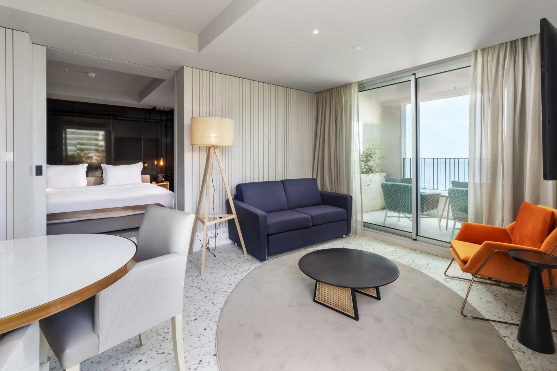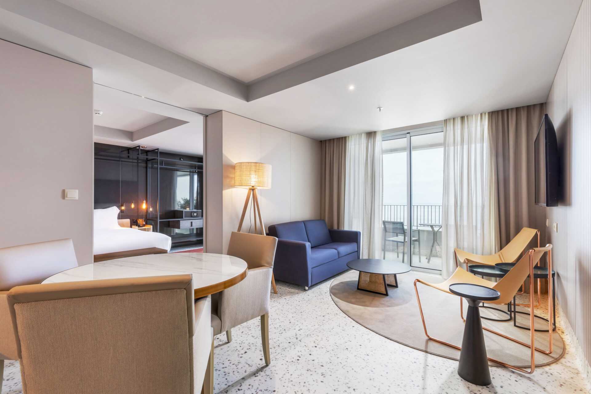 Sviitti, jossa on parveke. Sviitti koostuu makuuhuoneesta ja olohuoneesta, jotka voidaan erottaa liukuovella. Parivuode tai kaksi yhden hengen sänkyä. Lisävuodemahdollisuus vuodesohvasta. Sviitissä, johon mahtuu kaksi lasta lisävuoteella, voi majoittua 3–13-vuotiaat lapset. Maksuton wifi ja ilmastointi. Tallelokero lisämaksusta. Minibaari. Vedenkeitin, kahvia ja teetä. Tv kansainvälisillä kanavilla. Kylpytakit ja tossut. Hiustenkuivain. Kylpyhuoneessa suihku ja wc. Siivous 7 krt/viikko. Alle 2-vuotiaat lapset lasketaan lisävuoteella majoittuviksi henkilöiksi.