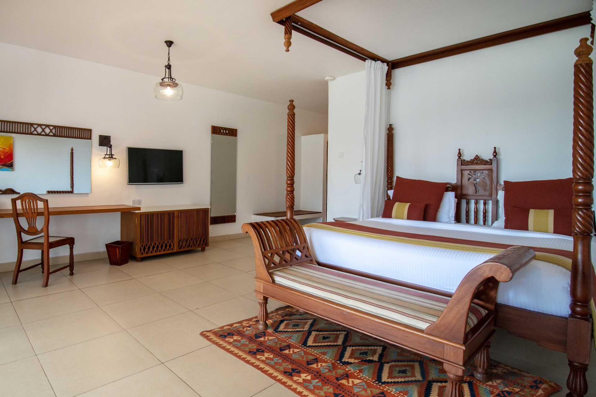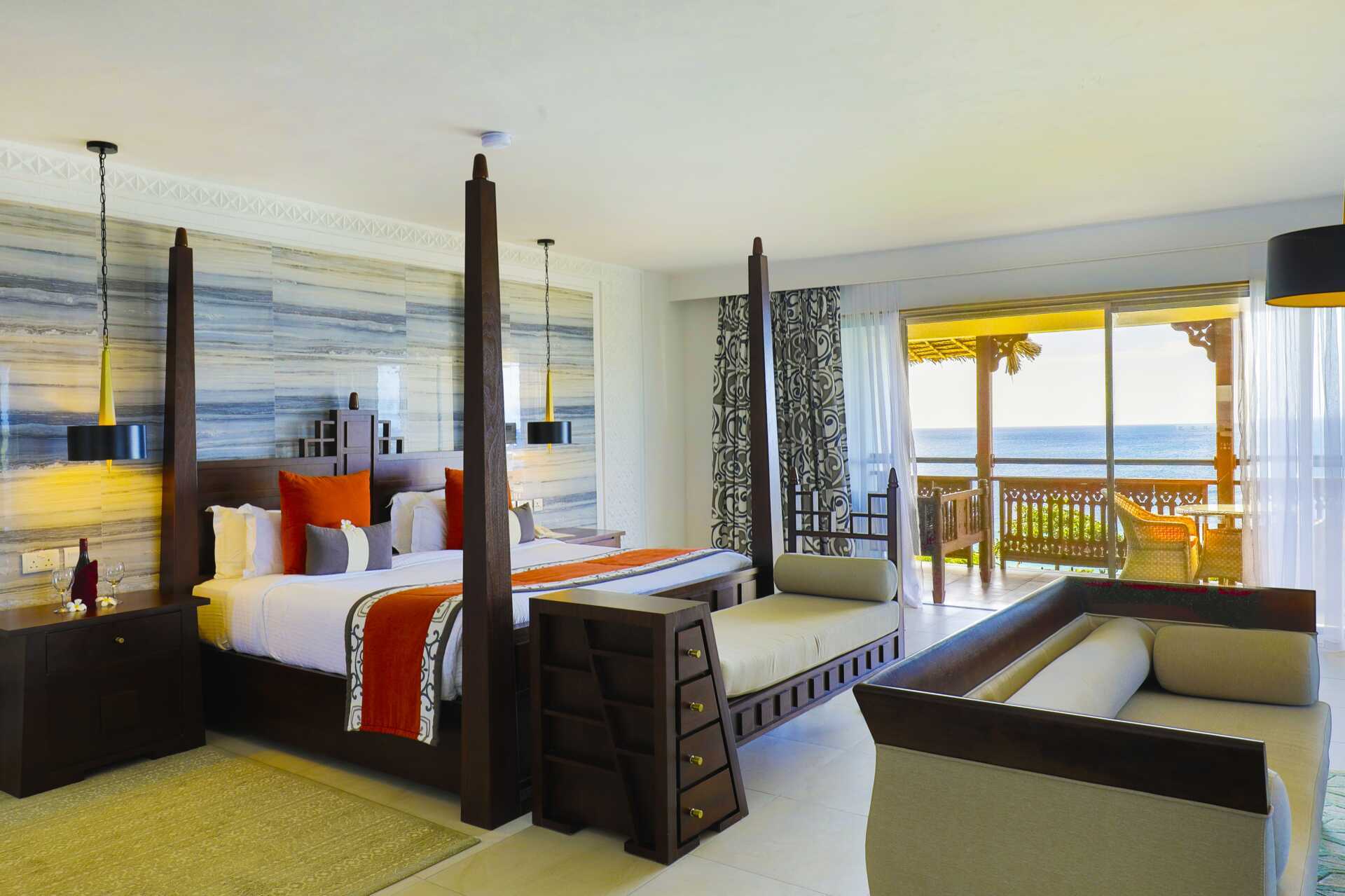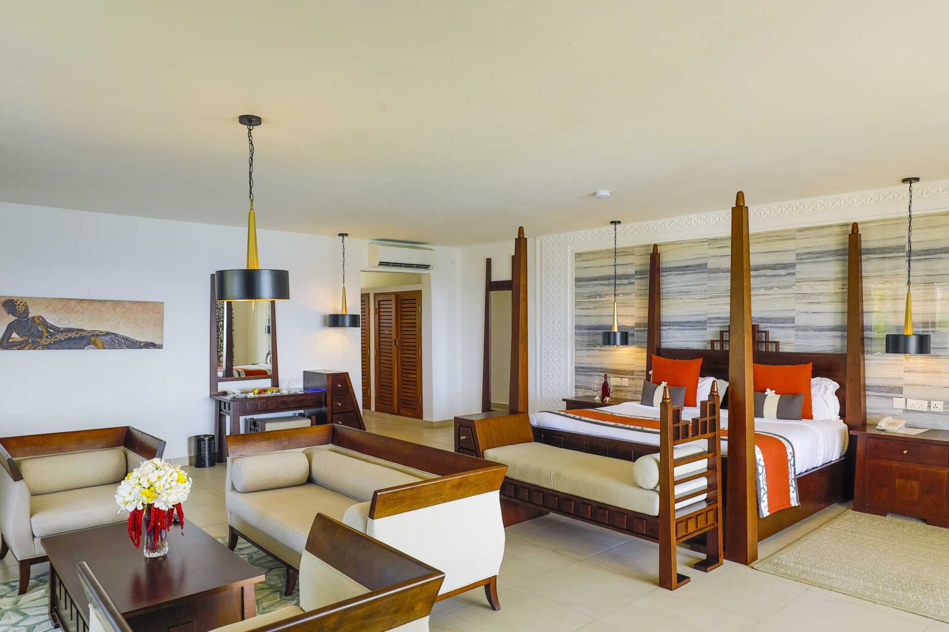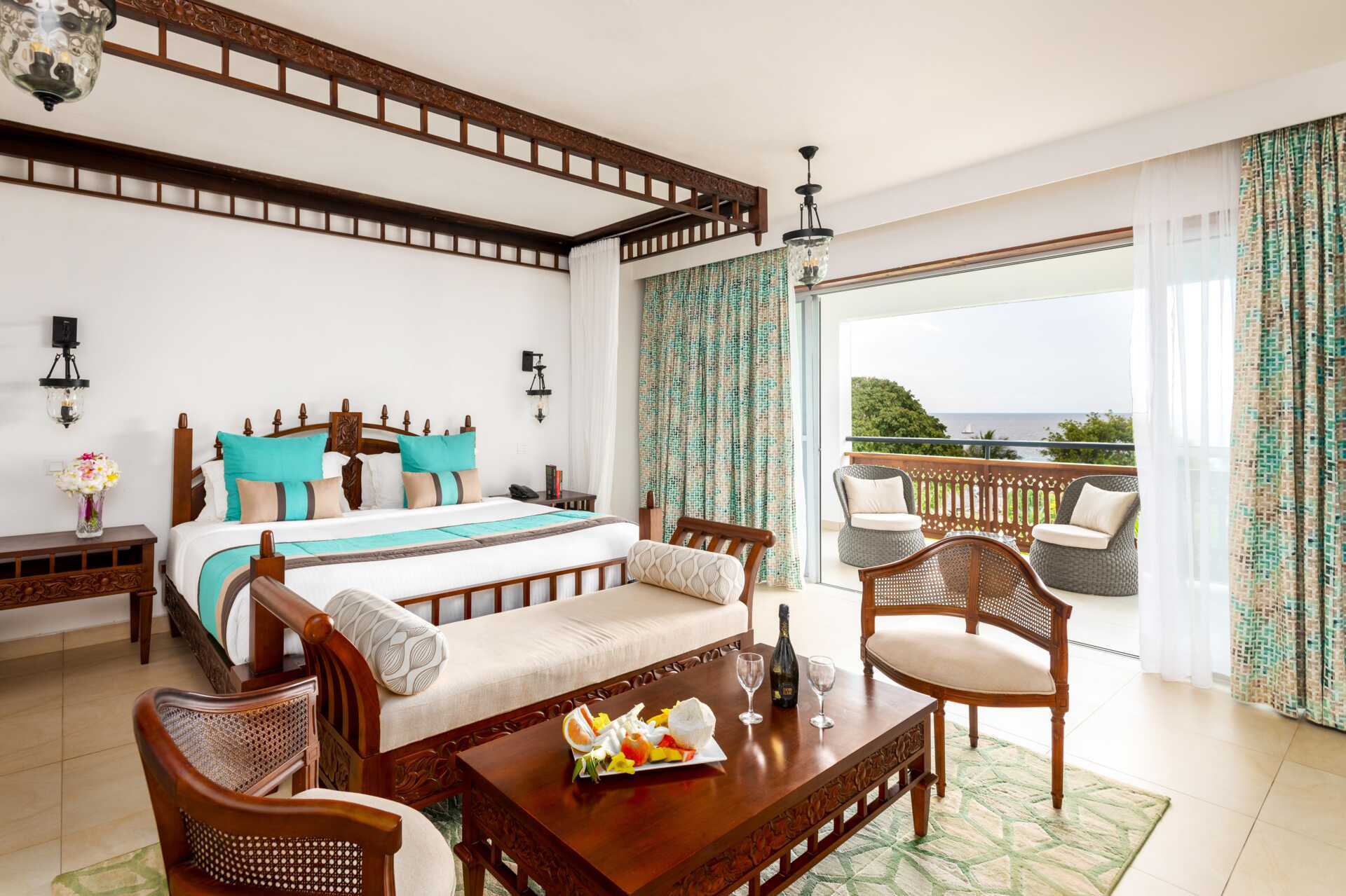 Sviitti, parvekkeella tai terassilla ja merinäköalalla. Parivuode. Lisävuodemahdollisuus yhden hengen sängystä. Maksuton wifi, ilmastointi ja tallelokero. Jääkaappi. Vedenkeitin, kahvia ja teetä. Ranskalainen kahvipuristin. Tv kansainvälisillä kanavilla. Hiustenkuivain. Kylpyhuoneessa kaksi pesuallasta, kylpyamme, erillinen suihku ja wc. Siivous 7 krt/viikko.