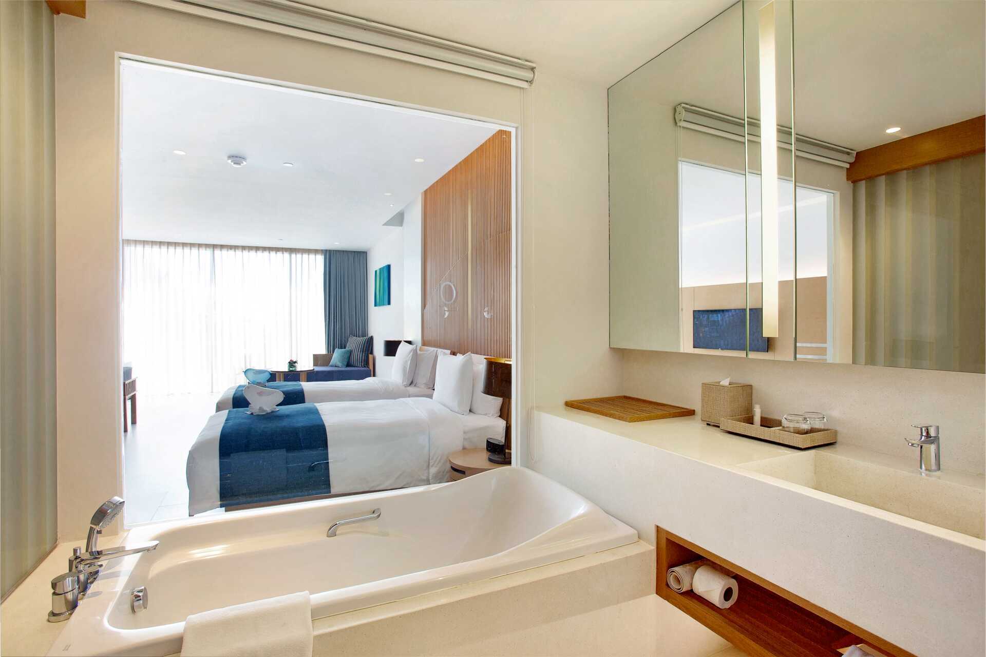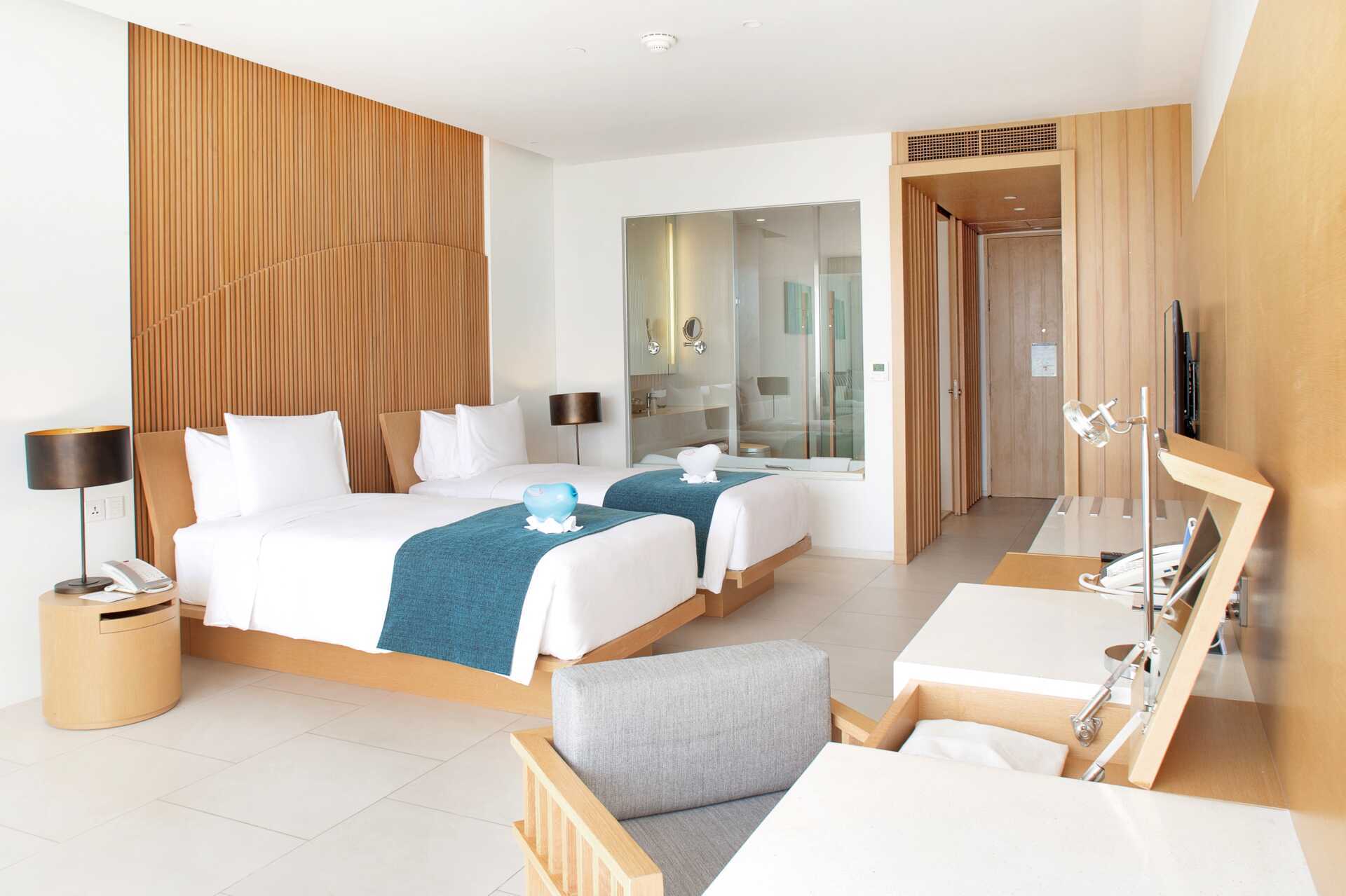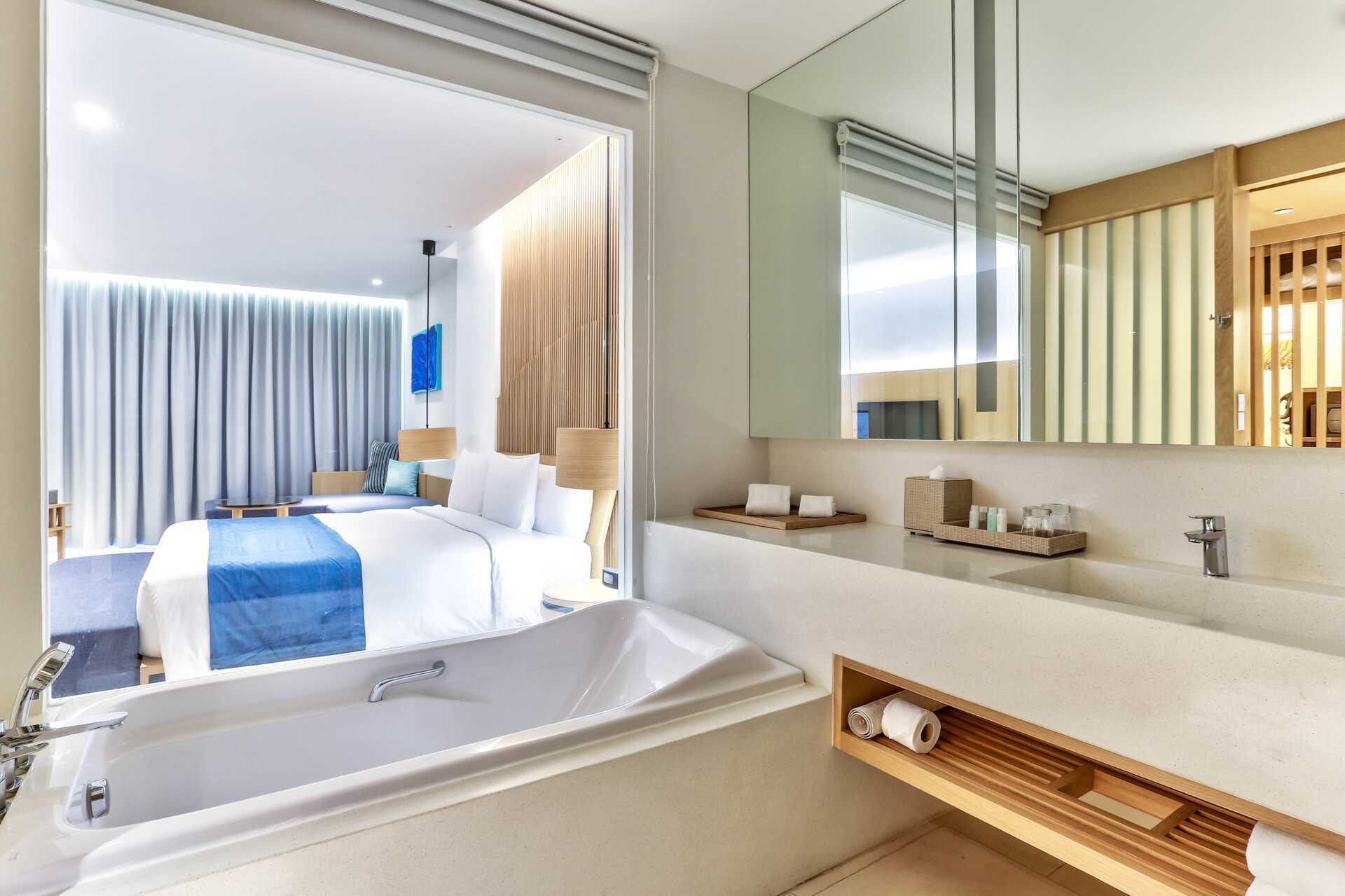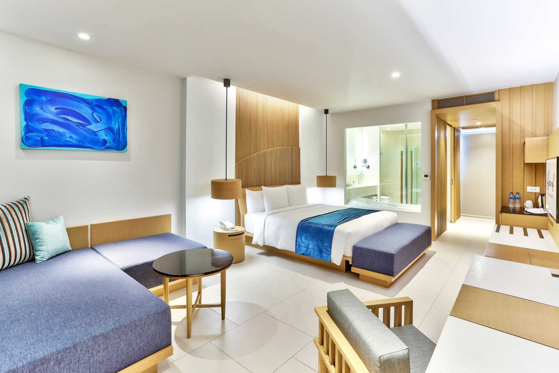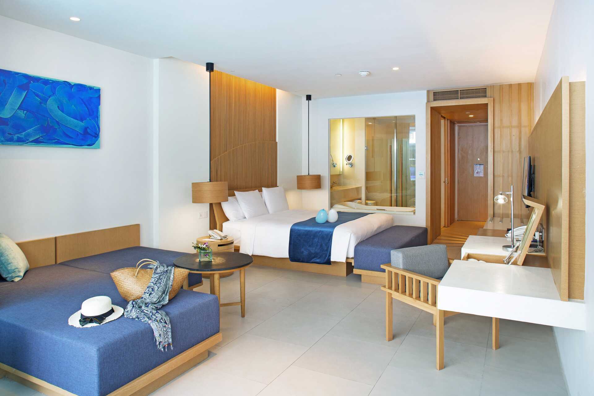 Deluxe-huone, jossa ulkotilassa uloskäynti yhteiselle uima-altaalle. Terassilla on lounge-sohva. Parivuode. Mahdollisuus saada lisävuode vuodesohvaan tai päivävuoteeseen. Maksuton wifi, ilmastointi ja tallelokero. Jääkaappi – kaksi vesipulloa sisältyy hintaan ja täytetään päivittäin. Vedenkeitin, kahvia ja teetä. Tv kansainvälisillä kanavilla. Aurinkovarjo. Silitysrauta ja -lauta. Kylpytakit ja tossut. Hiustenkuivain. Kylpyhuoneessa kylpyamme, erillinen suihku ja wc. Siivous 7 krt/viikko.