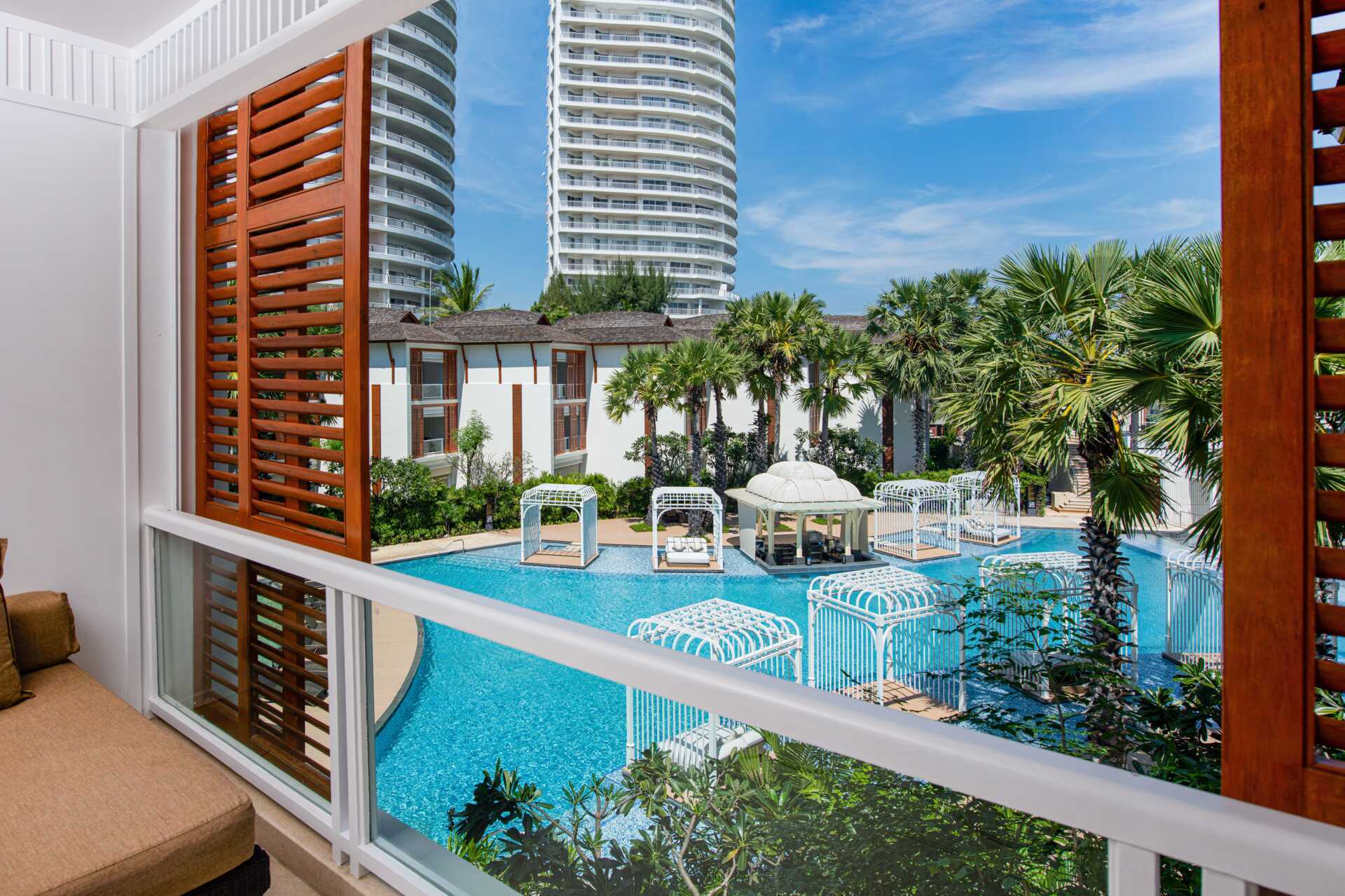 Deluxe-huone parvekkeella ja allasnäköalalla. Parvekkeella on leposohva ja pöytä ja tuolit. Huoneet sijaitsevat Beach Wing -siivessä, ja niitä kutsutaan Premium-huoneiksi. Parivuode tai kaksi yhden hengen vuodetta. Mahdollisuus lisävuoteisiin. Maksuton wifi, ilmastointi ja tallelokero. Minibaari, yksi vesipullo päivässä sisältyy hintaan. Vedenkeitin, kahvia ja teetä. Tv kansainvälisillä kanavilla. Silitysrauta ja -lauta. Kylpytakit ja tossut. Hiustenkuivaaja. Kylpyhuoneen tarvikkeet. Kylpyhuone, jossa kylpyamme, erillinen suihku ja wc. Väliseinä makuuhuoneen ja kylpyhuoneen välillä. Siivous 7 krt/viikko. Alle 2-vuotiaat lapset lasketaan lisävuoteella majoittuviksi henkilöiksi.