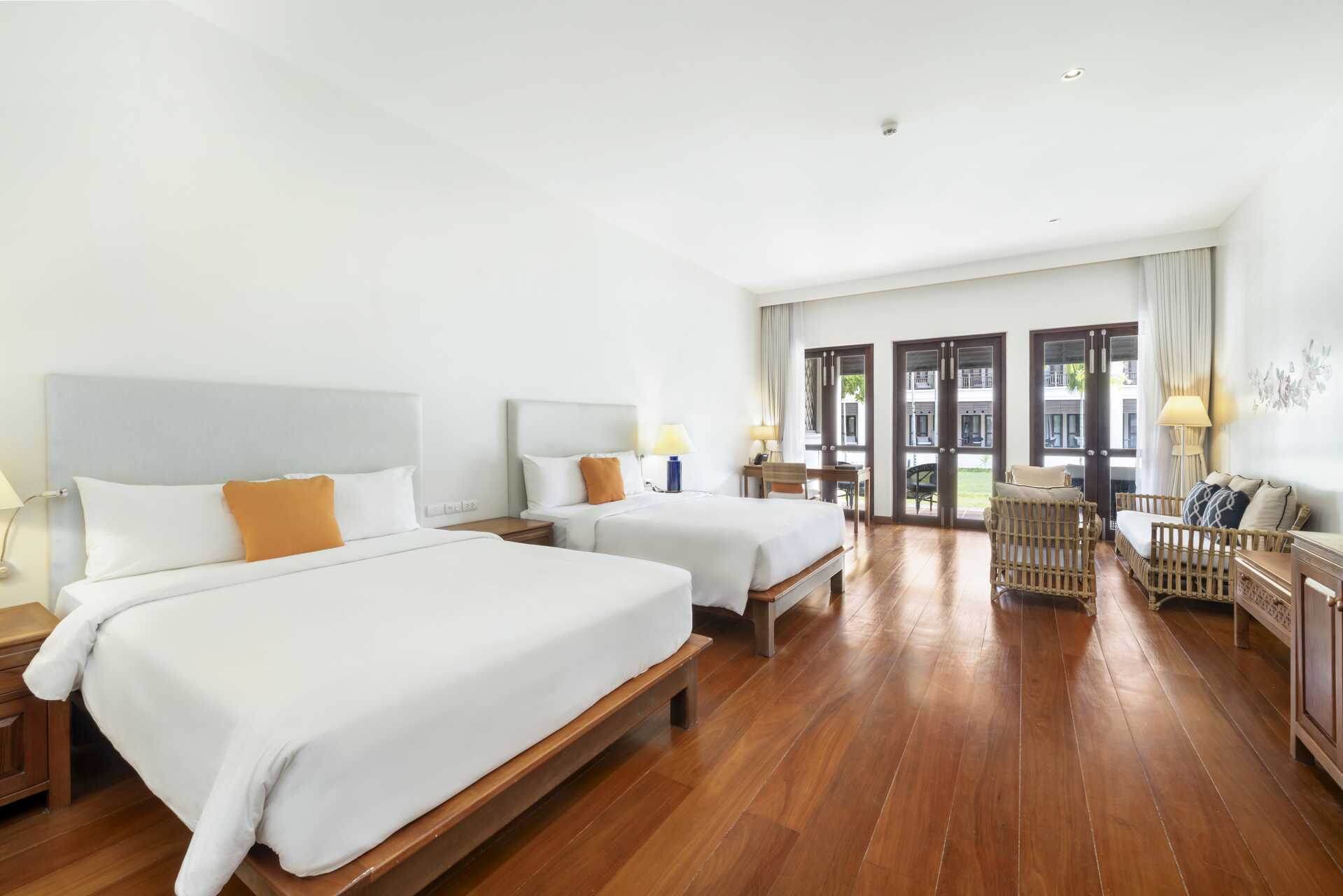 Deluxe-huone bungalowissa parvekkeella tai terassilla. Portaat ylös huoneiden sisäänkäynnille. Ulkotilassa on pöytiä ja tuoleja. Leveämpi sänky ja parivuode. Mahdollisuus saada lisävuoteita olemassa oleviin vuoteisiin. Maksuton wifi, ilmastointi ja tallelokero. Minibaari lisämaksulla. Vedenkeitin. Tv kansainvälisillä kanavilla. Kylpytakit ja tossut. Hiustenkuivain. Kylpyhuoneessa kylpyamme, erillinen suihku ja wc. Siivous 7 krt/viikko.