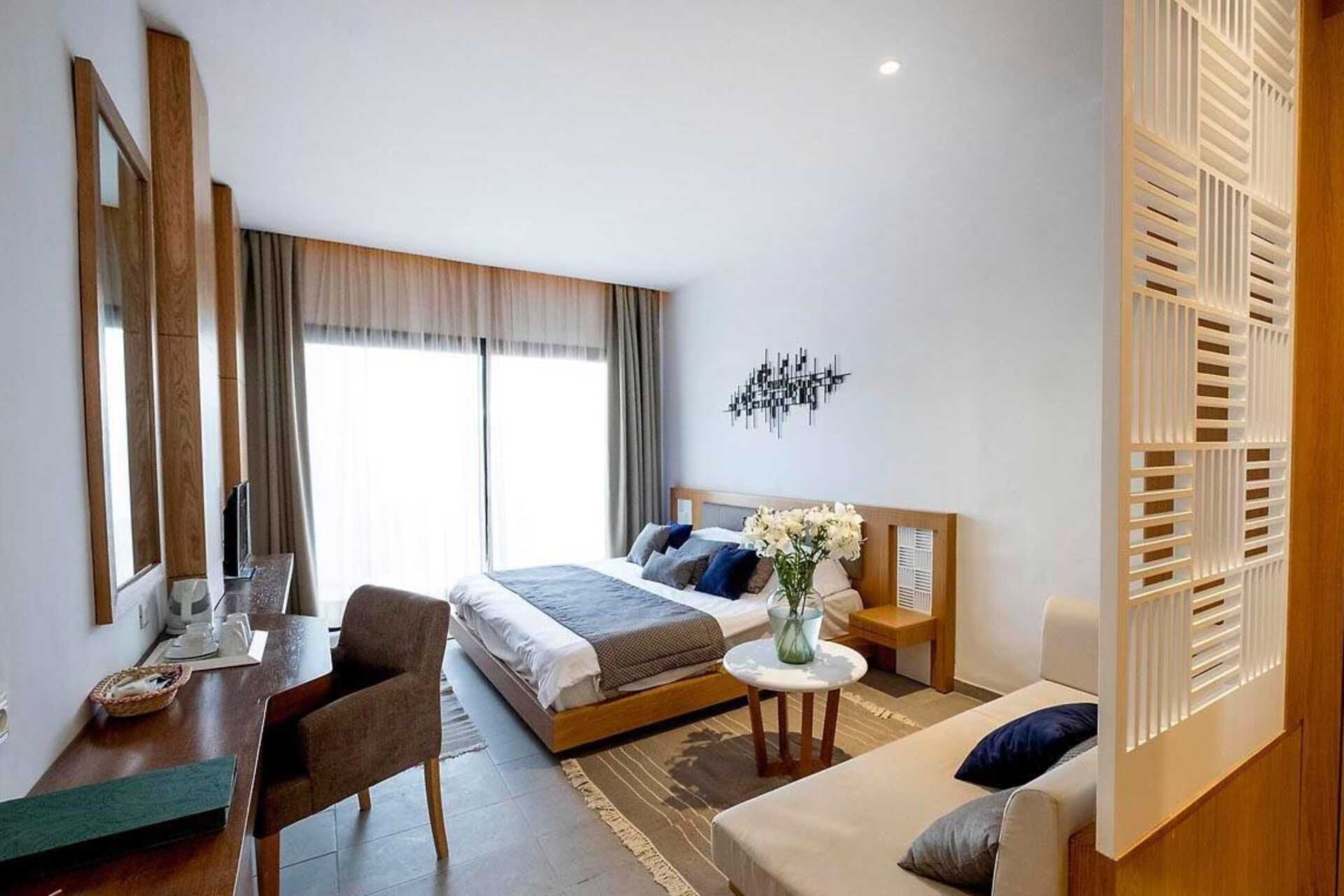 Sviitti jossa parveke tai terassi. Sviitissä on parivuode ja sohvaryhmä. Lisävuodemahdollisuus vuodesohvasta. Maksuton wifi, ilmastointi ja tallelokero. Jääkaappi. Kahvinkeitin. Tv kansainvälisillä kanavilla. Kylpytakit ja tohvelit. Hiustenkuivain. Kylpyhuoneessa kylpyamme, erillinen suihku ja wc. Siivous 7 krt/viikko. Alle 2-vuotiaat lapset lasketaan lisävuoteella majoittuviksi henkilöiksi.