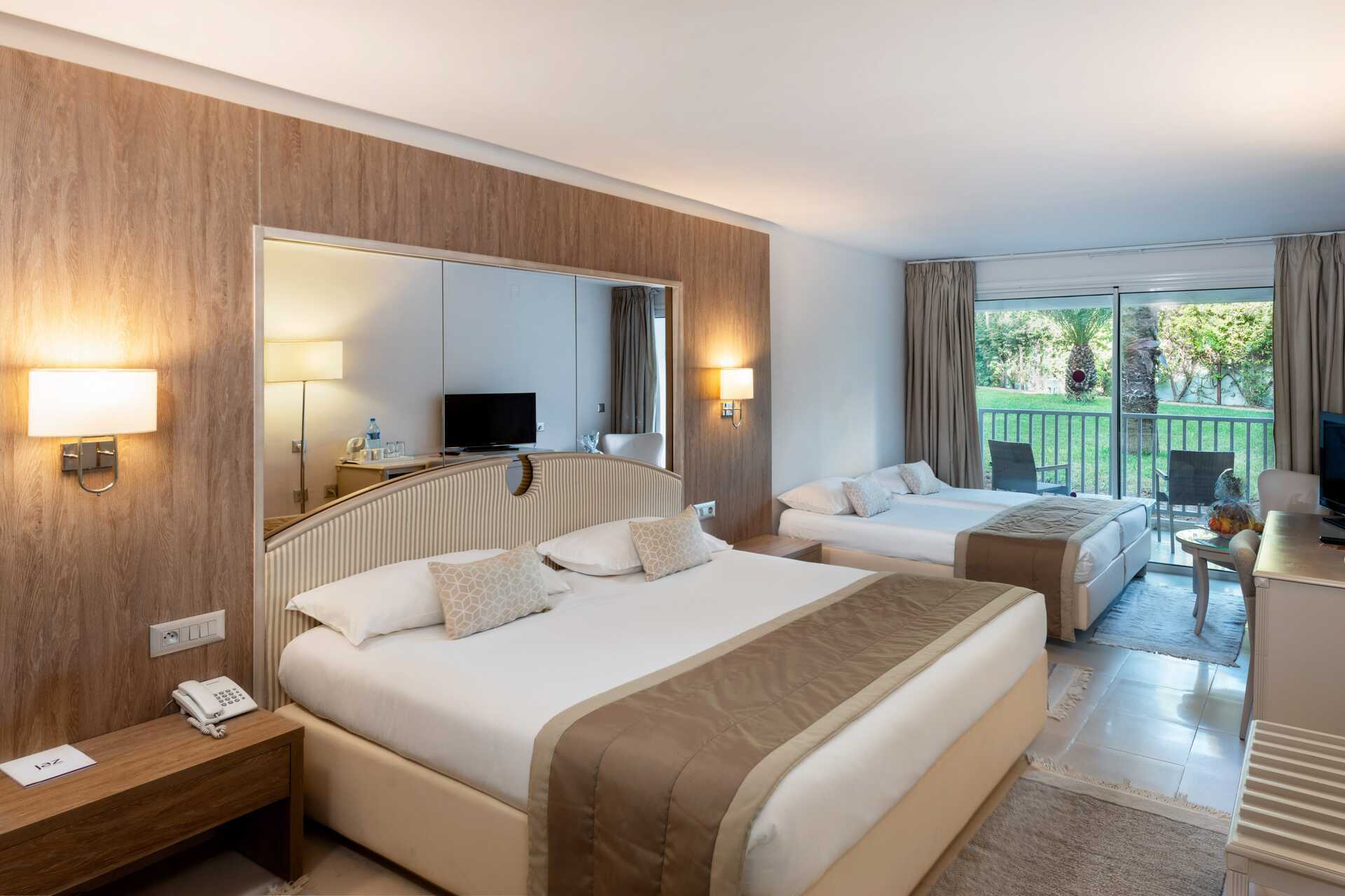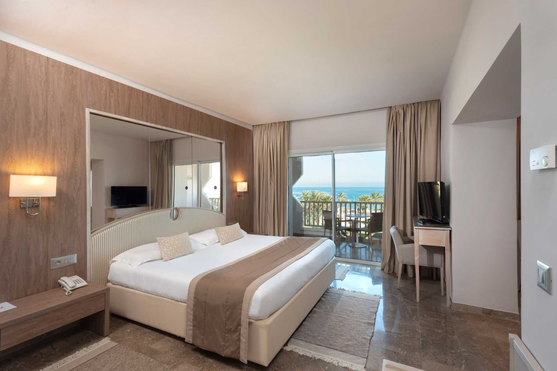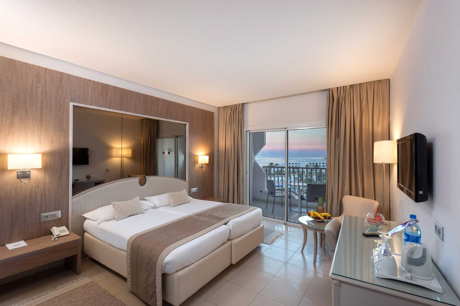 Deluxe-huone parvekkeella ja merinäköalalla. Deluxe-huoneessa on makuuhuone ja olohuone, jossa on sohva, pöytä ja tuolit. Parivuode. Lisävuodemahdollisuus. Maksuton wifi, ilmastointi ja tallelokero. Minibaarissa vesipullo, joka täytetään päivittäin, muut tuotteet lisämaksusta. Tv kansainvälisillä kanavilla. Hiustenkuivain. Kylpyhuoneessa suihku ja wc. Siivous 7 krt/viikko.