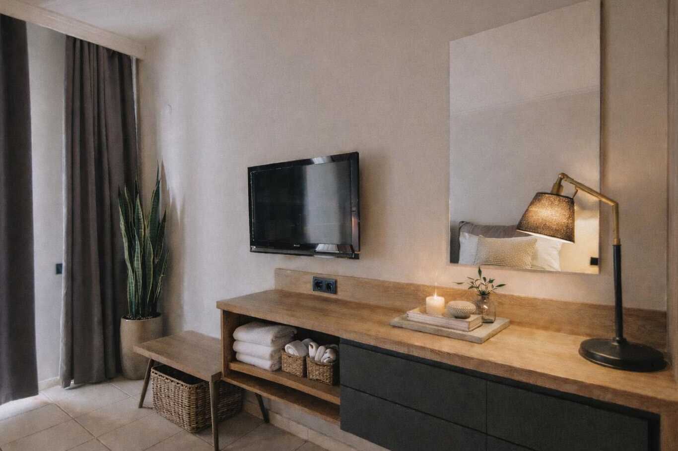 Kahden hengen huone parvekkeella tai terassilla. Kaksi yhden hengen sänkyä. Maksuton wifi, ilmastointi ja tallelokero. Jääkaappi ja vedenkeitin. Tv kansainvälisillä kanavilla. Hiustenkuivain. Kylpyhuoneessa suihku ja wc. Siivous 7 krt/viikko.