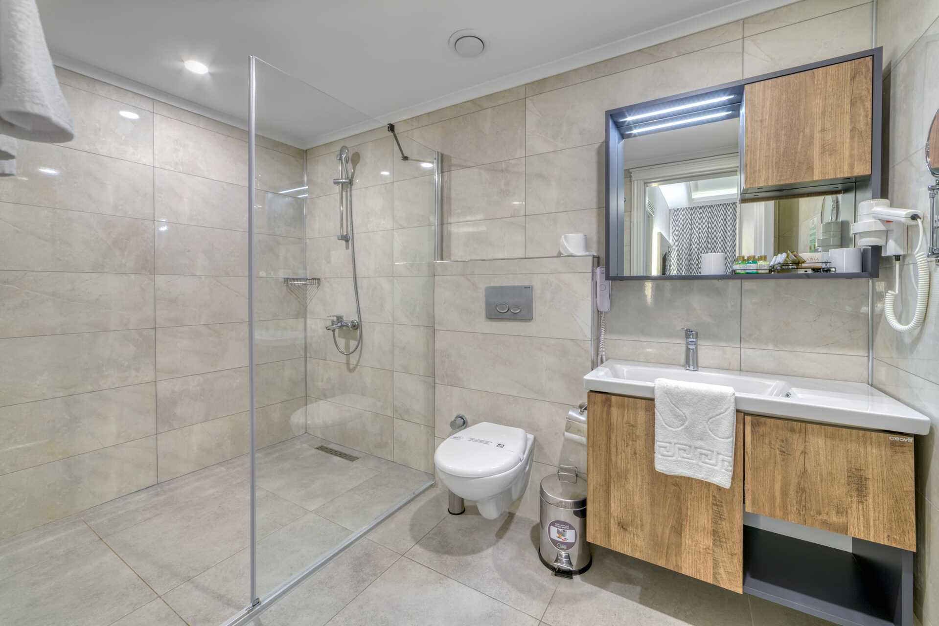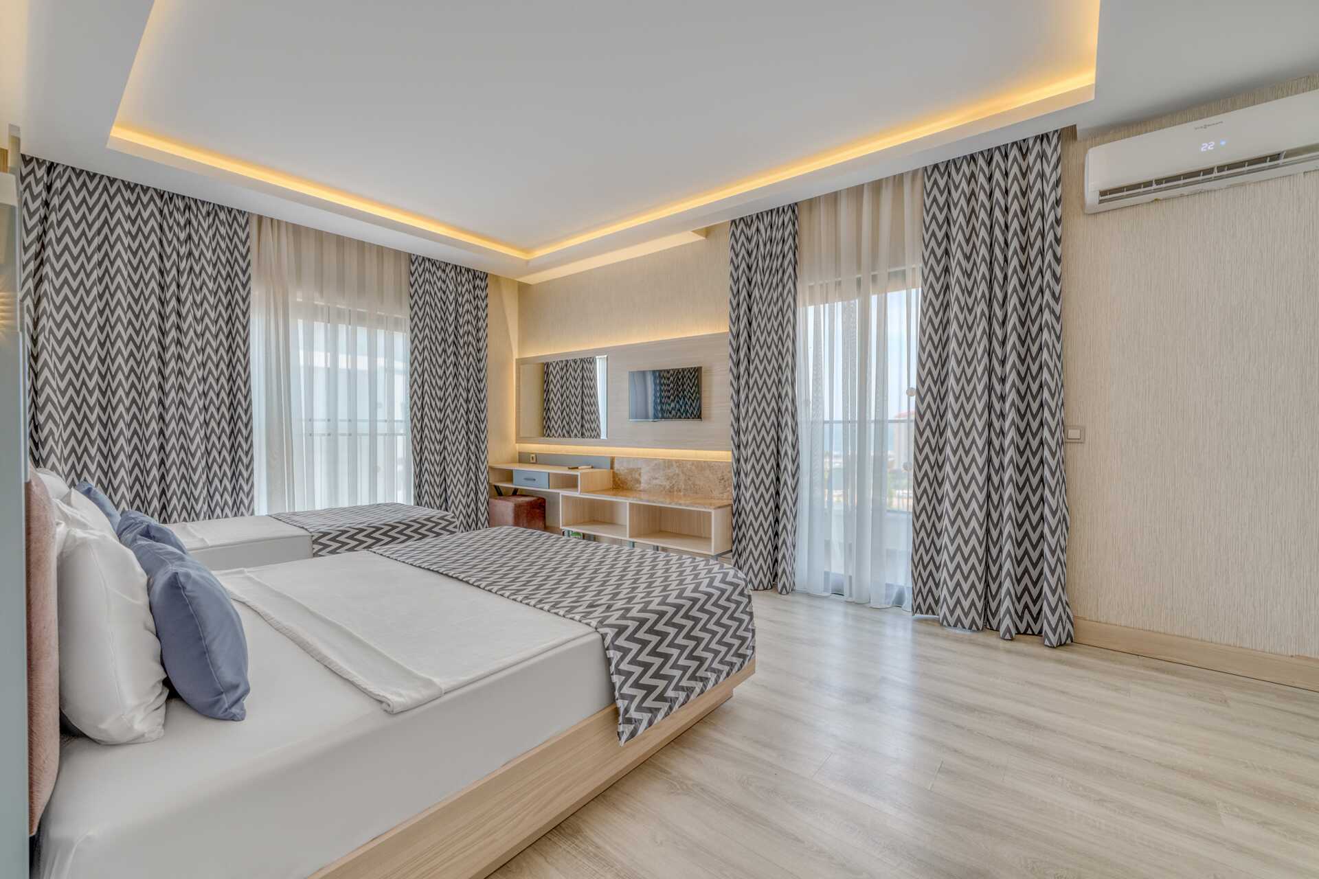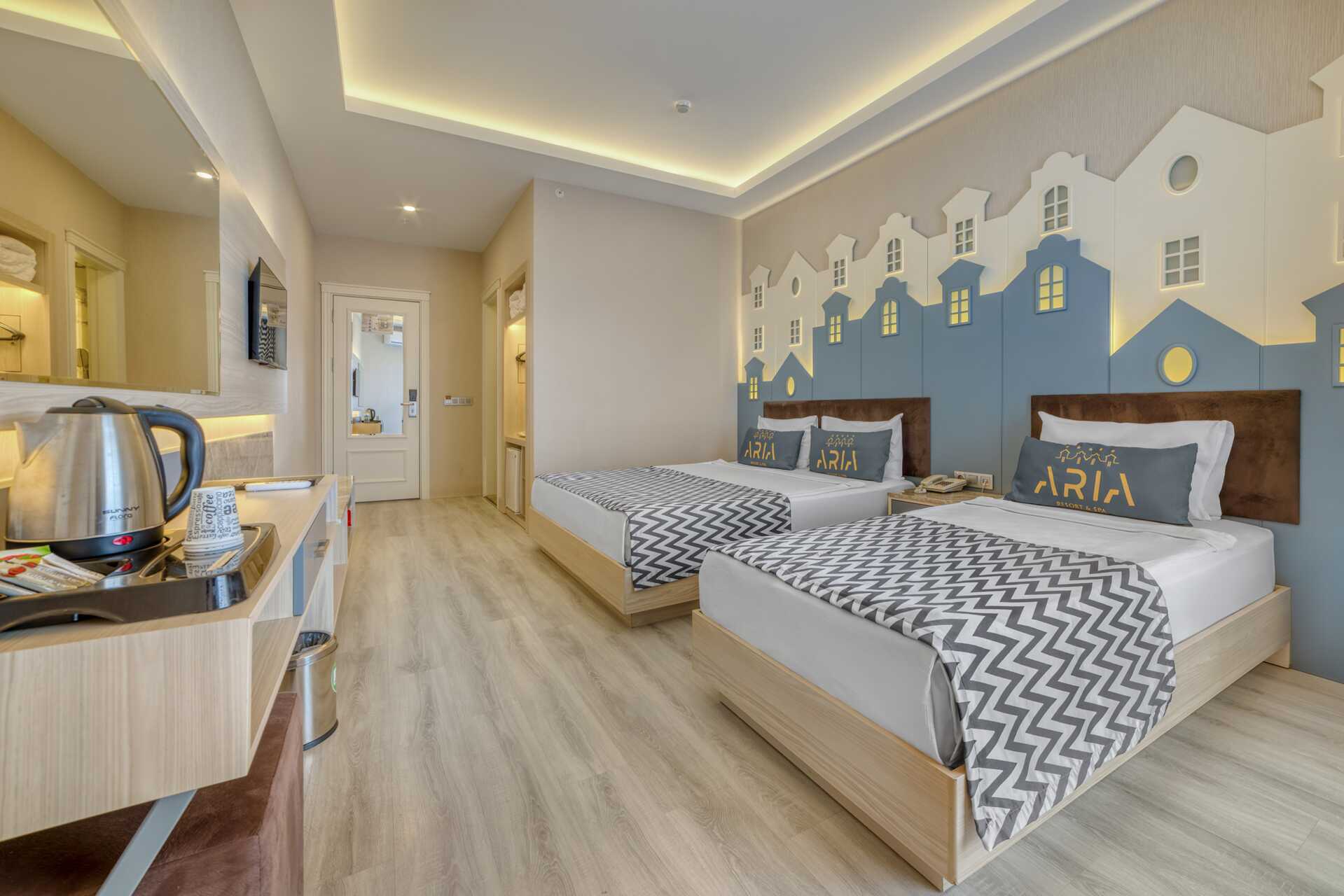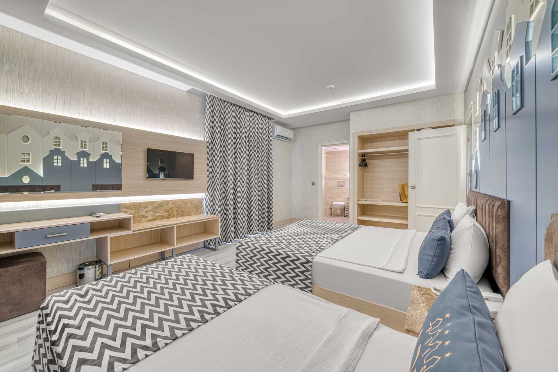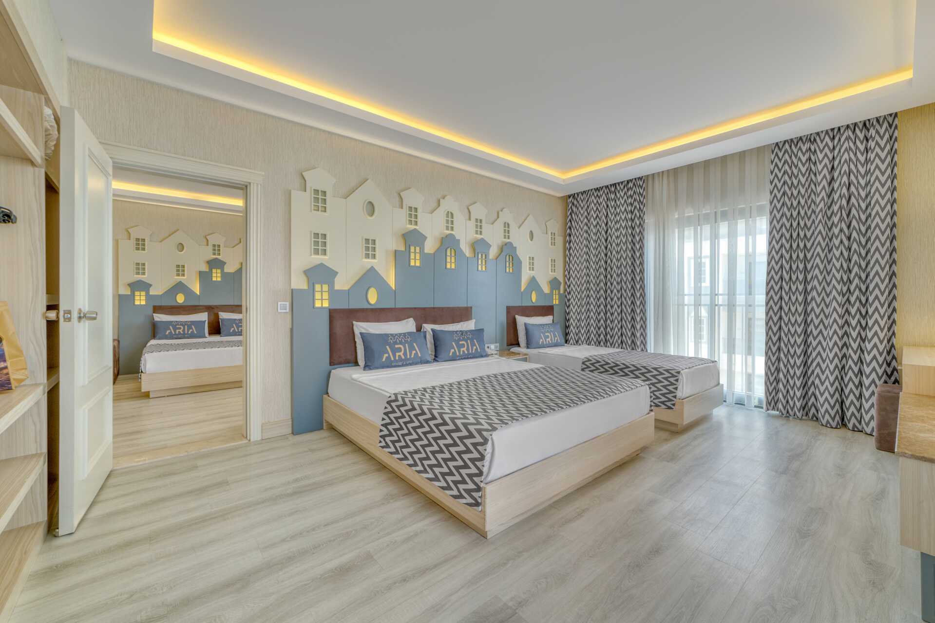 Deluxe-perhehuoneita, joissa on parveke. Kaksi huonetta, joissa kummassakin on parivuode ja yksi yhden hengen vuode. Maksuton wifi, ilmastointi ja tallelokero. Minibaari täytetään päivittäin virvoitusjuomilla ja vedellä. Vedenkeitin, kahvia ja teetä. Tv kansainvälisillä kanavilla. Tohvelit. Hiustenkuivain. Kaksi kylpyhuonetta, joissa on suihku ja wc. Siivous 7 krt/viikko.