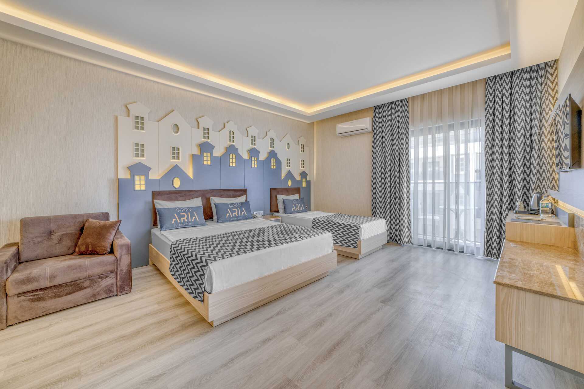 Perhehuone parvekkeella. Kaksi huonetta, joissa kummassakin on parivuode ja yksi yhden hengen vuode. Maksuton wifi, ilmastointi ja tallelokero. Minibaari täytetään päivittäin virvoitusjuomilla ja vedellä. Vedenkeitin, kahvia ja teetä. Tv kansainvälisillä kanavilla. Tohvelit. Hiustenkuivain. Kaksi kylpyhuonetta, joissa on suihku ja wc. Siivous 7 krt/viikko.