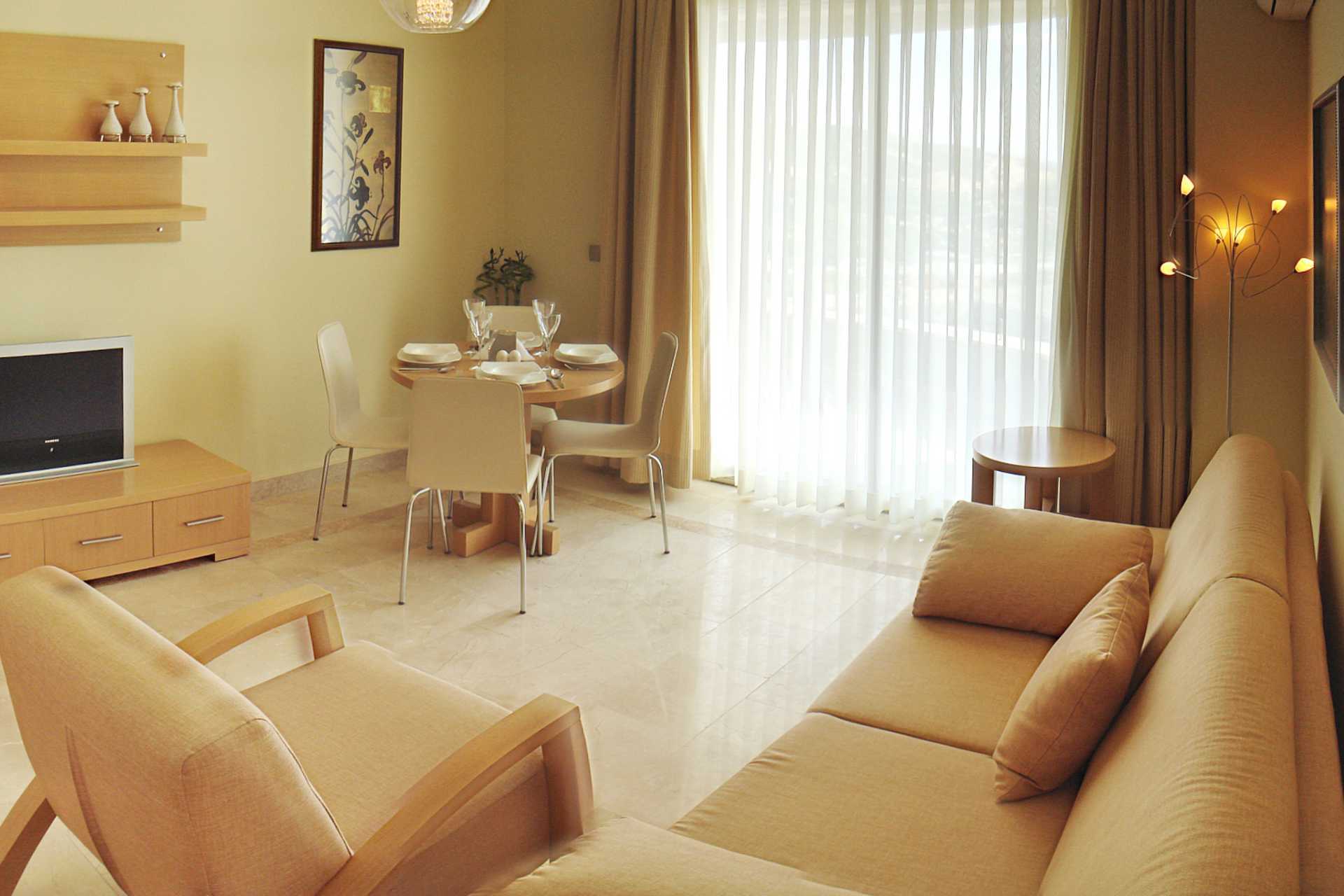 Perhehuone parvekkeella. Huoneet sijaitsevat päärakennuksessa, ja koostuvat kahdesta makuuhuoneesta sekä yhdistetystä olohuoneesta ja minikeittiöstä. Yhdessä makuuhuoneessa on parivuode ja toisessa makuuhuoneessa kaksi erillistä vuodetta. Lisävuodemahdollisuus vuodesohvasta. Minikeittiö, jossa jääkaappi, uuni, astianpesukone, mikroaaltouuni, vedenkeitin ja keittiön perusvarusteet. Maksuton wifi, ilmastointi ja tallelokero. Tv kansainvälisillä kanavilla. Pesukone. Hiustenkuivain. Kaksi kylpyhuonetta, joissa on suihku ja wc. Siivous 7 krt/viikko. Alle 2-vuotiaat lapset lasketaan lisävuoteella majoittuviksi henkilöiksi.