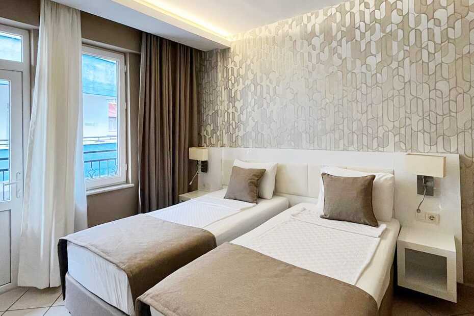Kaksioita, joissa erillinen makuuhuone sekä yhdistetty olohuone/minikeittiö. Parveke. Kaksi yhden hengen vuodetta, lisävuodemahdollisuus vuodesohvasta. Minikeittiö, jossa keittolevyt, jääkaappi, mikro, vedenkeitin ja yksinkertainen keittiövarustelu. Tv kansainvälisillä kanavilla. Hiustenkuivain. Maksuton wifi. Ilmastointi lisämaksusta. Suihku ja wc. Parveke. Siivous 7 krt/viikko.