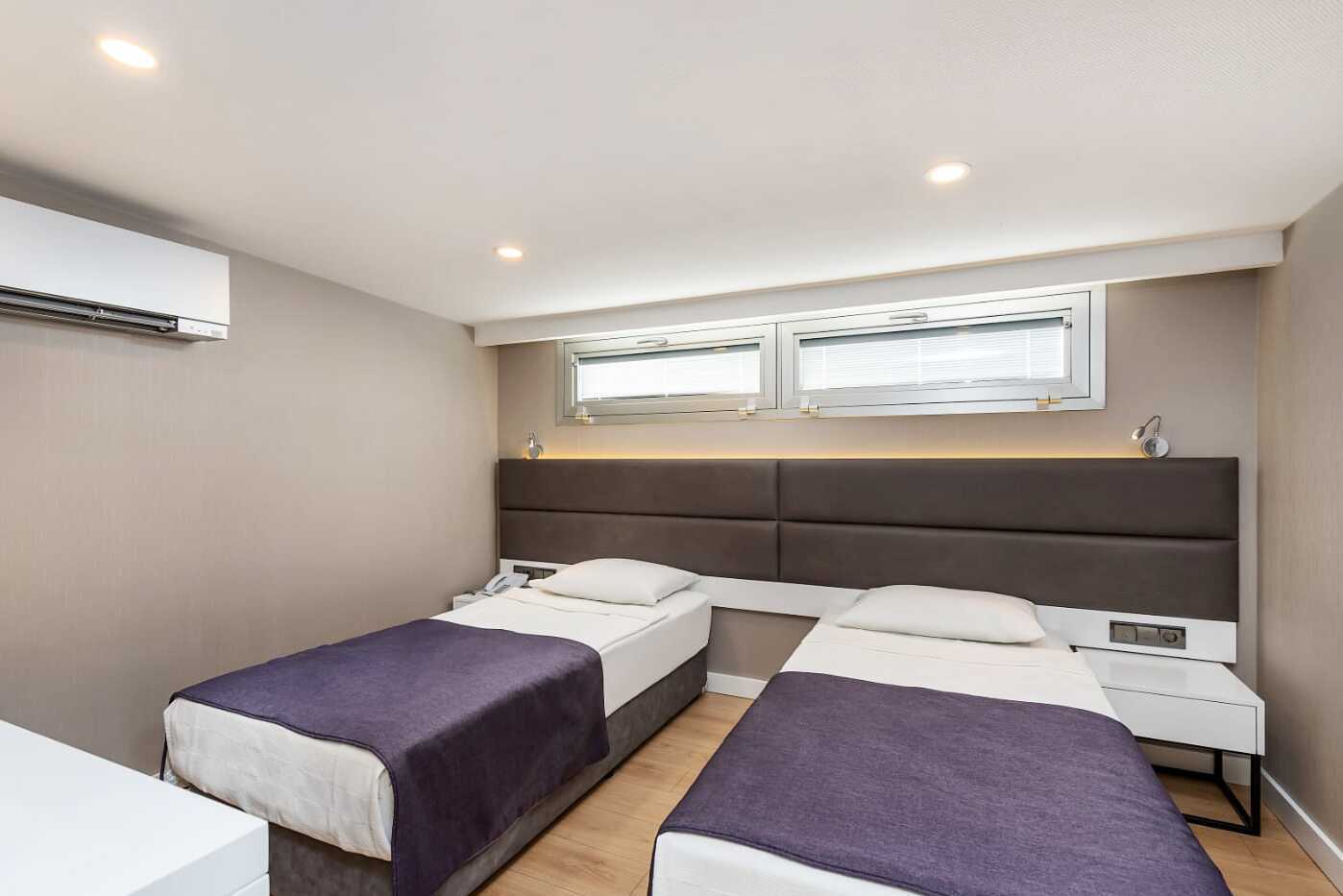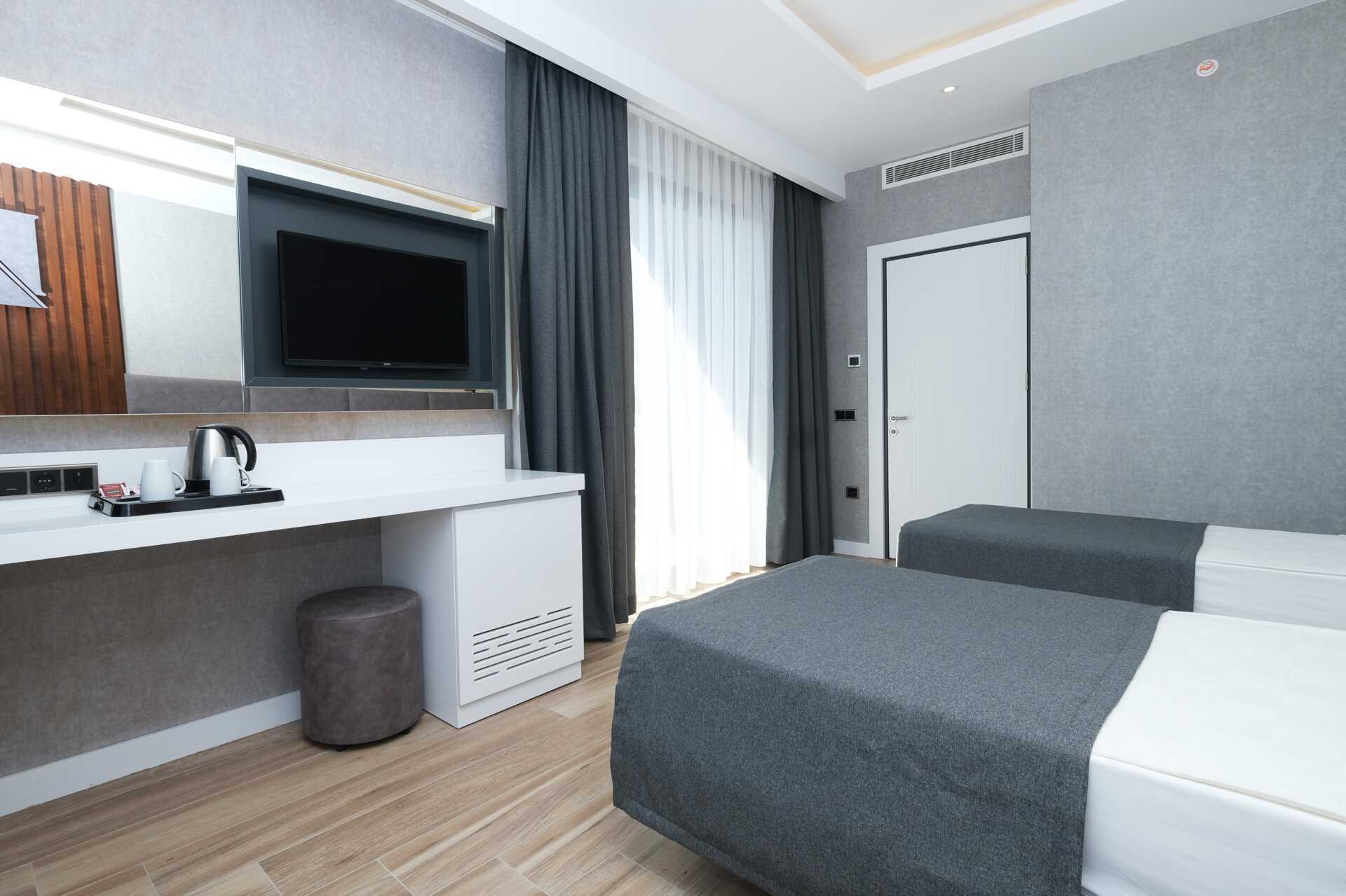 Kahden hengen huone parvekkeella. Parivuode tai kaksi yhden hengen sänkyä. Lisävuodemahdollisuus vuodesohvaan tai yhden hengen vuoteeseen. Maksuton wifi ja ilmastointi. Tallelokero lisämaksusta. Minibaari. Vedenkeitin, kahvia ja teetä. Tv kansainvälisillä kanavilla. Hiustenkuivain. Kylpyhuoneessa suihku ja wc. Siivous 7 krt/viikko. Alle 2-vuotiaat lapset lasketaan lisävuoteella majoittuviksi henkilöiksi.