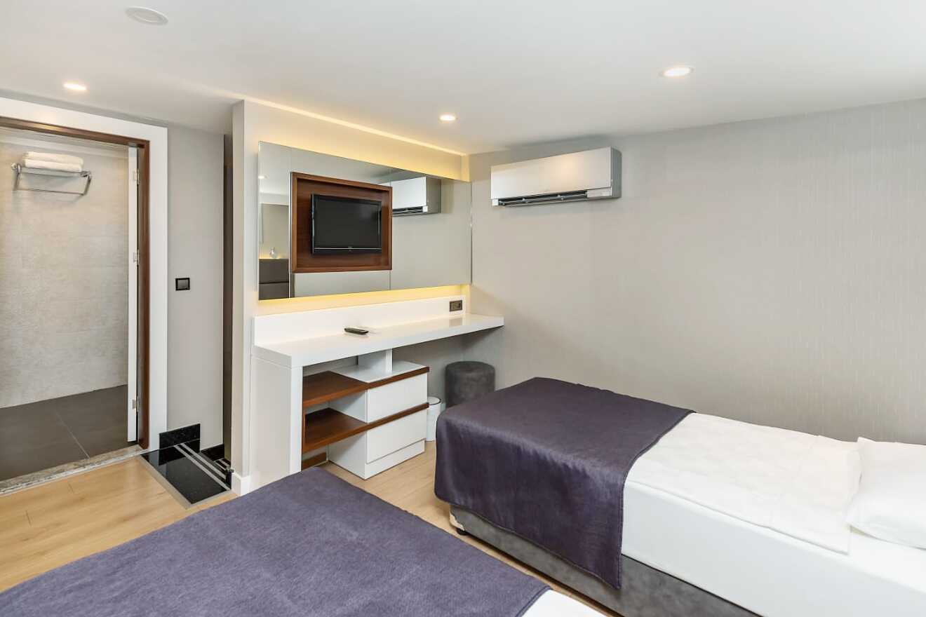 Kaksikerroksinen perhehuone, jossa parveke. Perhehuone koostuu kahdesta makuuhuoneesta kahdessa kerroksessa. Yläkerran makuuhuoneessa on kaksi erillistä vuodetta ja pohjakerroksen makuuhuoneessa parivuode. Mahdollisuus lisävuoteeseen nojatuolissa tai kokoontaitettavassa sängyssä. Maksuton wifi ja ilmastointi. Tallelokero lisämaksulla. Minibaari. Vedenkeitin, kahvia ja teetä. Tv kansainvälisillä kanavilla. Hiustenkuivain. Kylpyhuoneessa suihku ja wc. Siivous 7 krt/viikko. Alle 2-vuotiaat lapset lasketaan lisävuoteella majoittuviksi henkilöiksi.