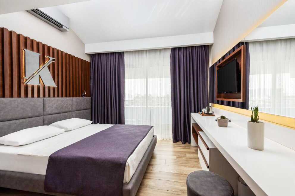 Deluxe-huone parvekkeella. Huonetyypin ikäraja on 12 vuotta. Parivuode tai kaksi yhden hengen sänkyä. Lisävuodemahdollisuus kokoontaitettavasta nojatuolista. Maksuton wifi ja ilmastointi. Tallelokero lisämaksulla. Minibaari. Vedenkeitin, kahvia ja teetä. Tv kansainvälisillä kanavilla. Hiustenkuivain. Kylpyhuoneessa suihku ja wc. Siivous 7 krt/viikko. Alle 2-vuotiaat lapset lasketaan lisävuoteella majoittuviksi henkilöiksi.