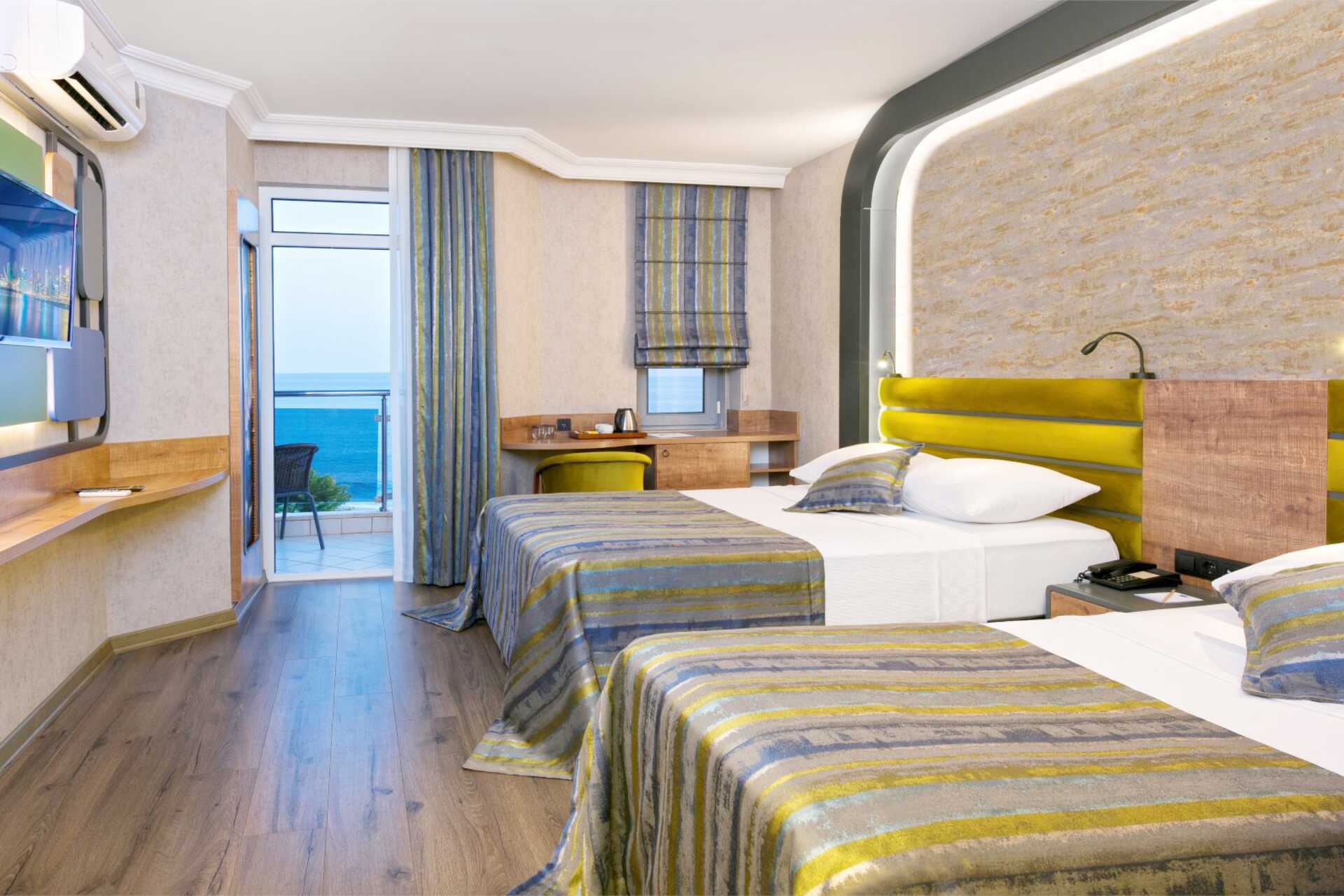 Superior-huoneita, joissa on parveke, osassa rajoitettu merinäköala ja osassa merinäköala. Huoneet sijaitsevat A-rakennuksessa. Parivuode tai kaksi yhden hengen vuodetta. Maksuton wifi ja ilmastointi. Tallelokero lisämaksusta. Jääkaappi. Vesipullo maksutta saapumisen yhteydessä. Tv kansainvälisillä kanavilla. Hiustenkuivain. Suihku ja wc. Siivous 7 krt/viikko. Alle 2-vuotiaat lapset katsotaan lisävuoteessa majoittuviksi henkilöiksi.