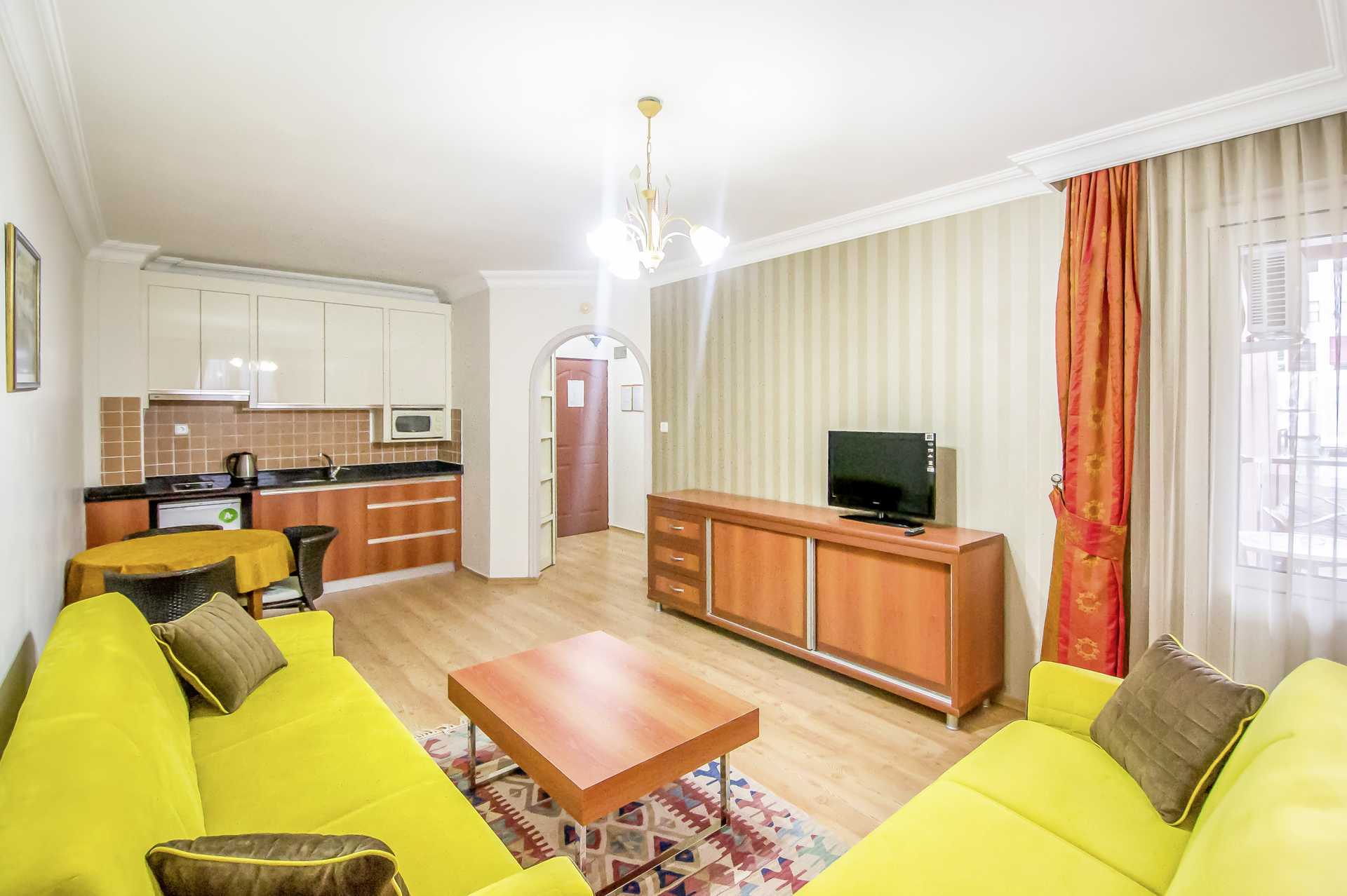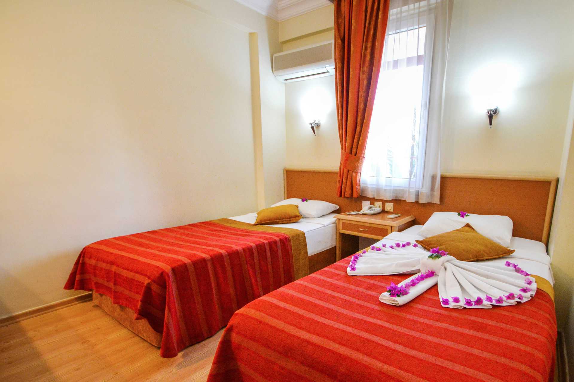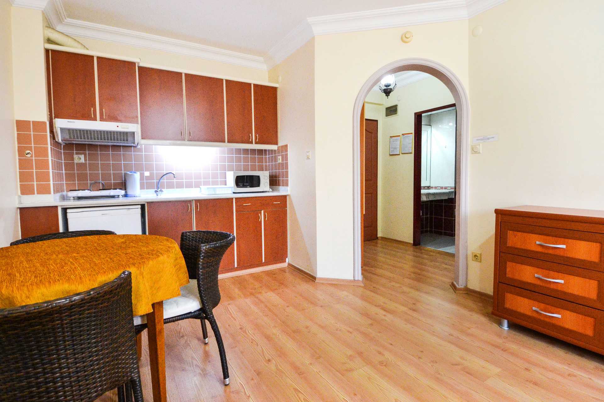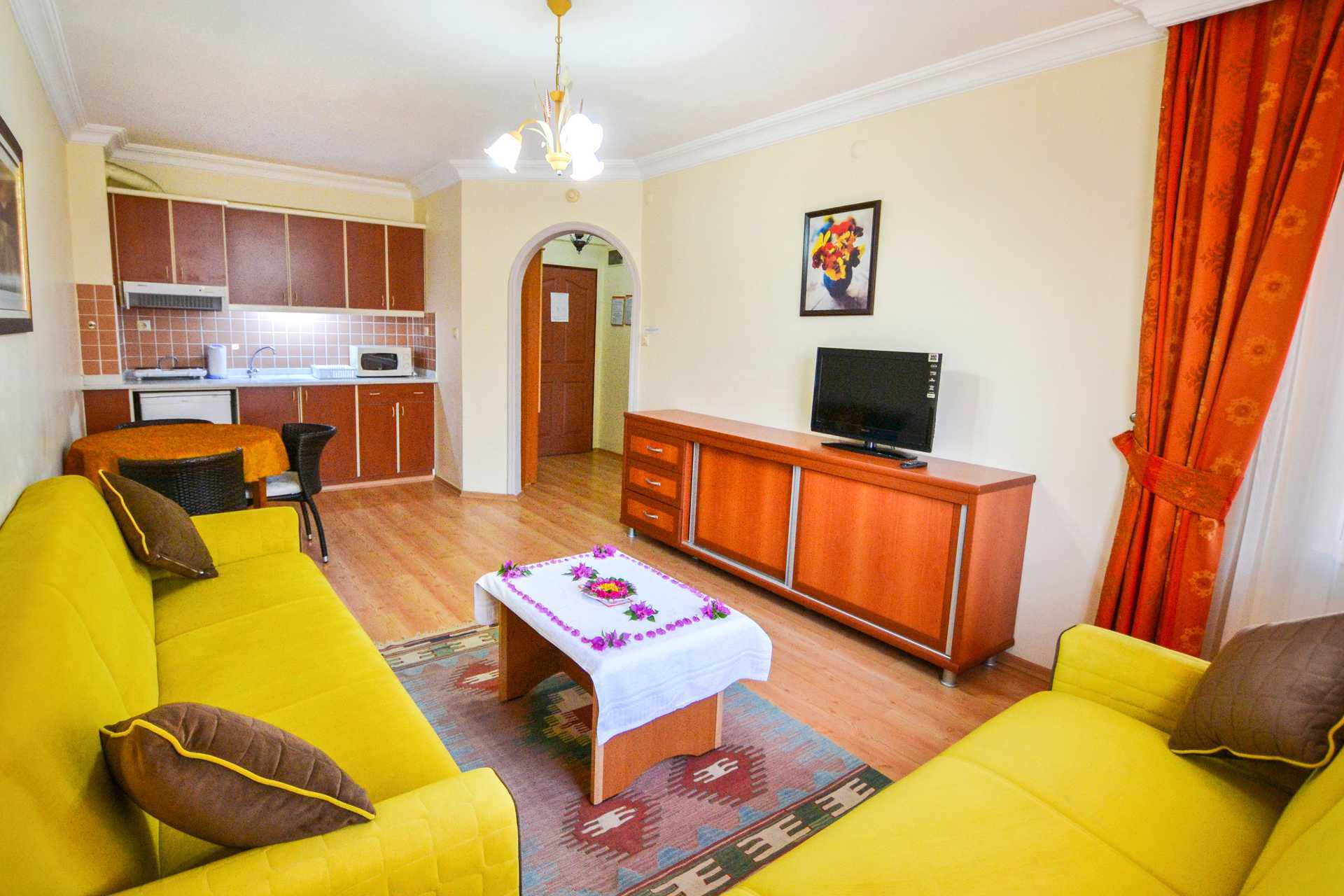 Kaksio parvekkeella tai terassilla. Makuuhuone sekä yhdistetty olohuone ja minikeittiö. Kaksi yhden hengen sänkyä. Lisävuodemahdollisuus kahteen vuodesohvaan. Minikeittiössä keittolevyt, jääkaappi, vedenkeitin, mikro ja yksinkertainen keittiövarustus. Tallelokero ja ilmastointi lisämaksulla. Tv kansainvälisillä kanavilla. Hiustenkuivain. Kylpyhuoneessa suihku ja wc. Siivous 7 krt/viikko.