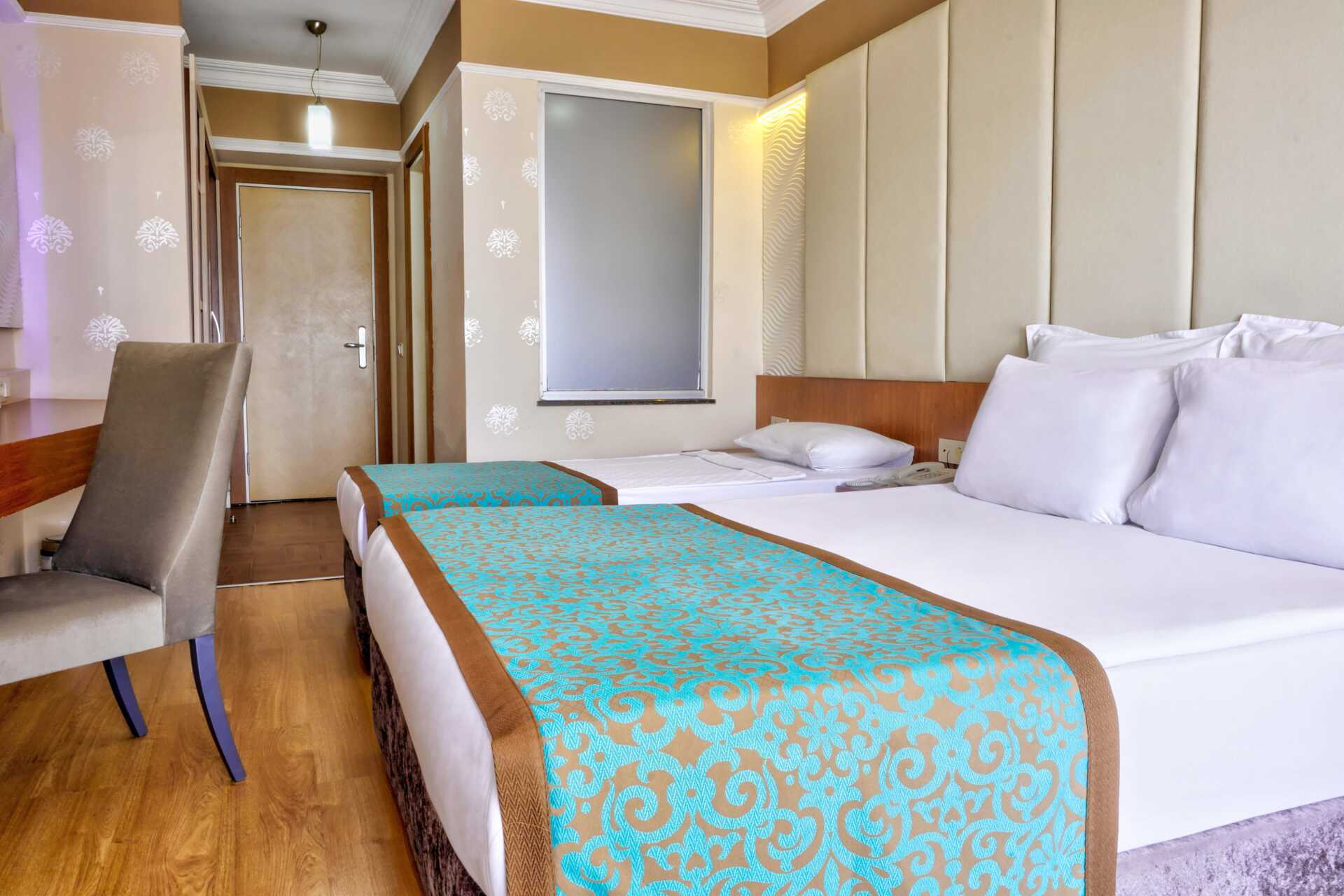 Kahden hengen huone, parvekkeella. Parvekkeet ovat pieniä, mutta niissä on pöytä ja tuoleja. Parivuode. Lisävuodemahdollisuus yhden hengen sängystä. Wifi ja ilmastointi sisältyvät. Tallelokero lisämaksusta. Jääkaappi. Vedenkeitin, kahvia ja teetä. Tv kansainvälisillä kanavilla. Hiustenkuivain. Suihku ja wc. Siivous 7krt/viikko.