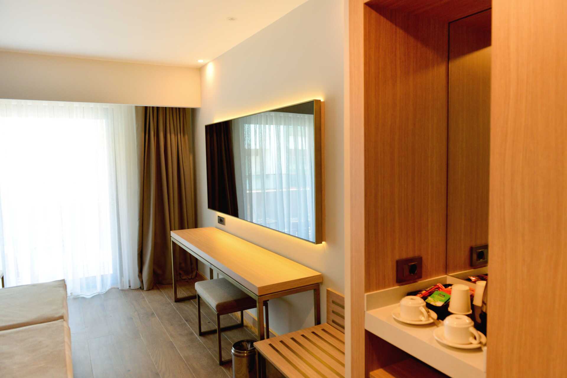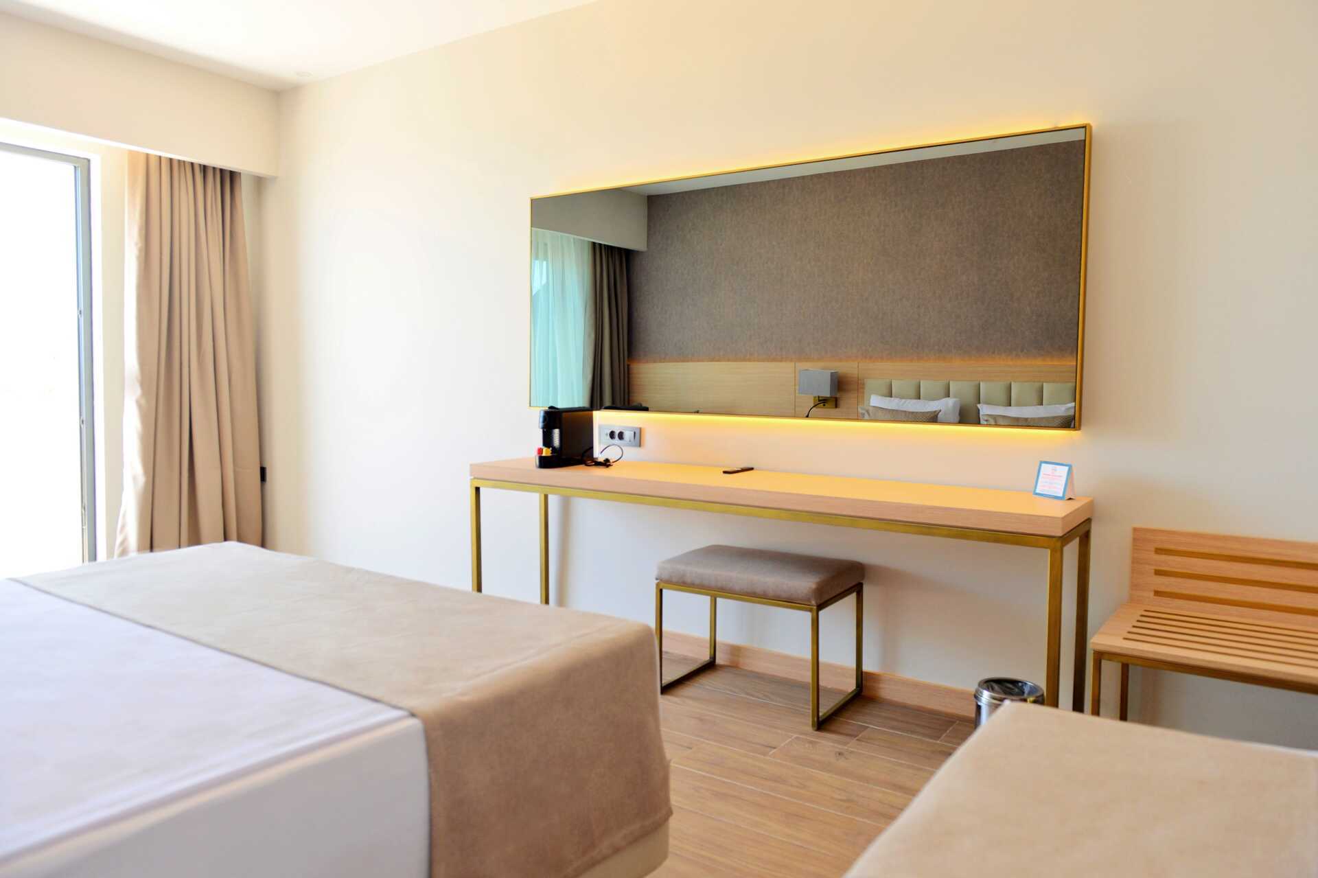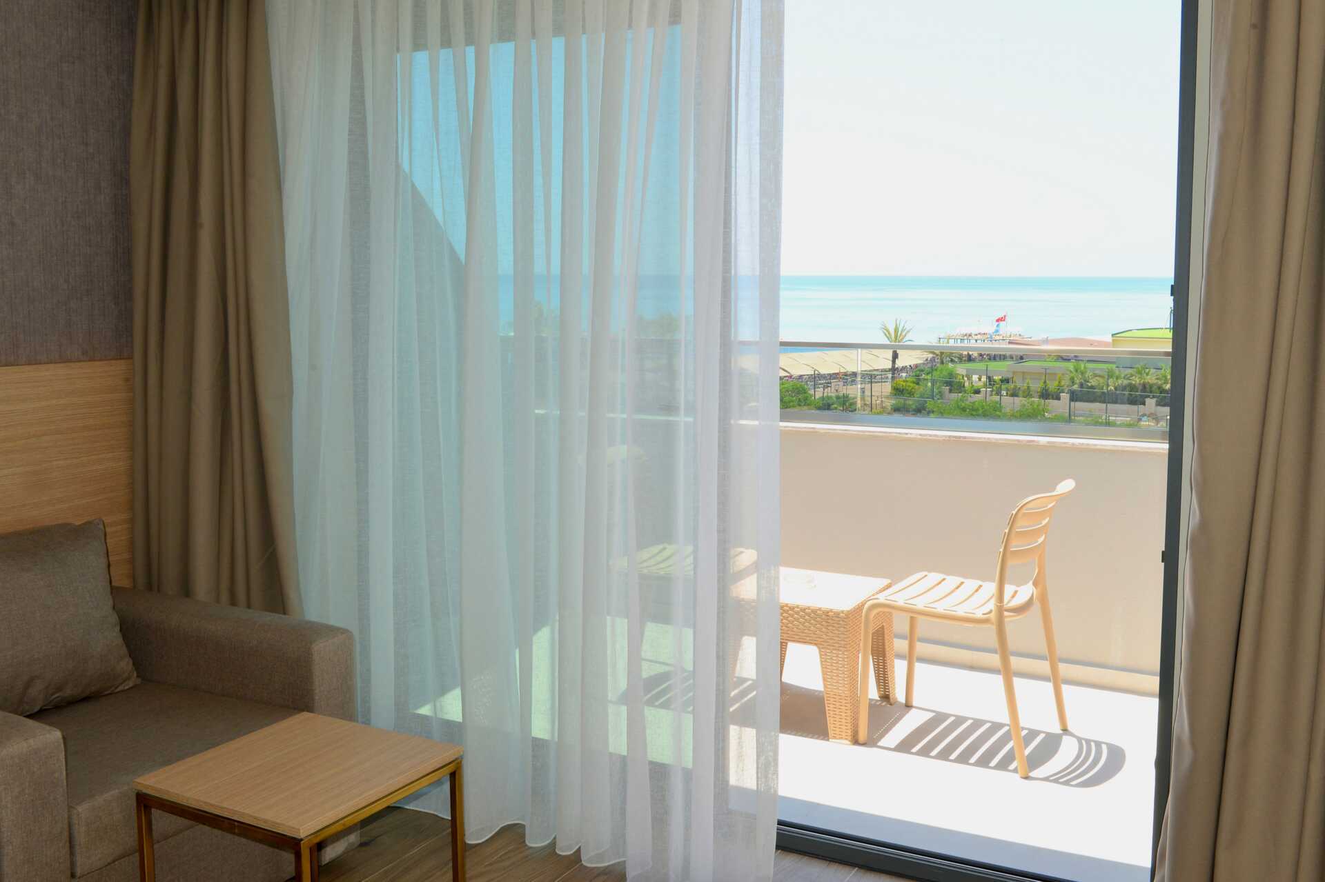 Deluxe-huone parvekkeella ja merinäköalalla. Parivuode tai kaksi yhden hengen sänkyä. Lisävuodemahdollisuus yhden hengen vuoteesta. Maksuton wifi, ilmastointi ja tallelokero. Minibaari (täytetään päivittäin). Kapselikeitin kahvin valmistukseen. Vedenkeitin, kahvia ja teetä. Tv kansainvälisillä kanavilla. Kylpytakit ja tossut. Hiustenkuivain. Suihku ja wc. Siivous 7 krt/viikko. Alle 2-vuotiaat lapset lasketaan lisävuoteella majoittuviksi henkilöiksi.