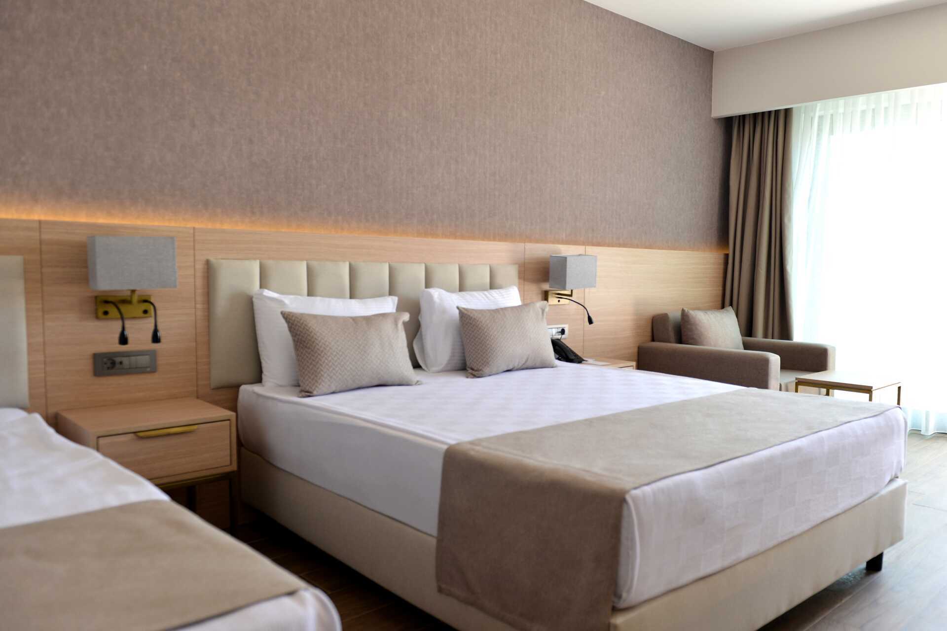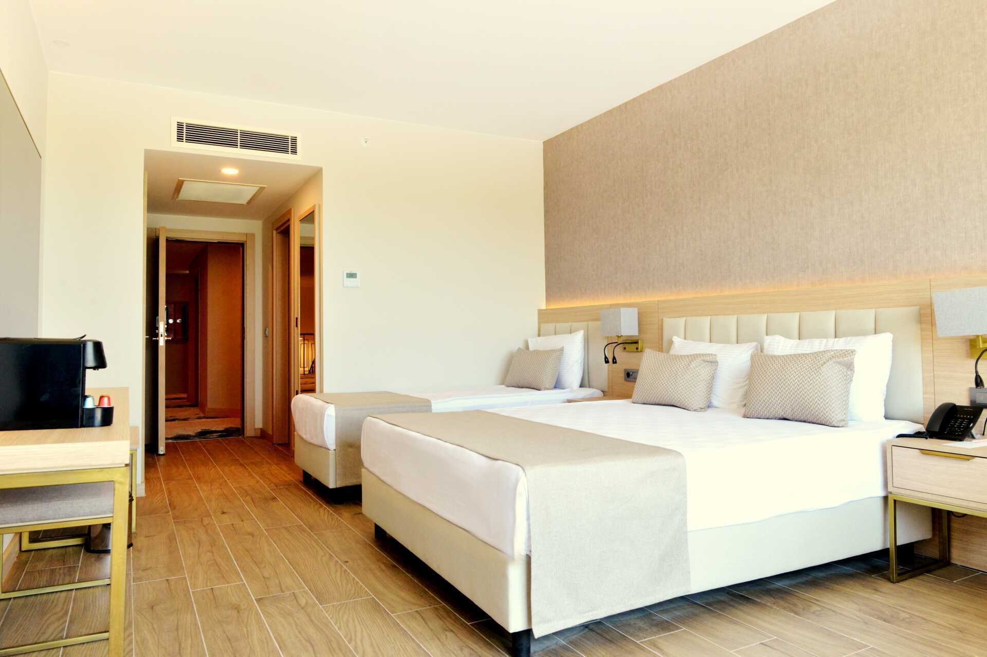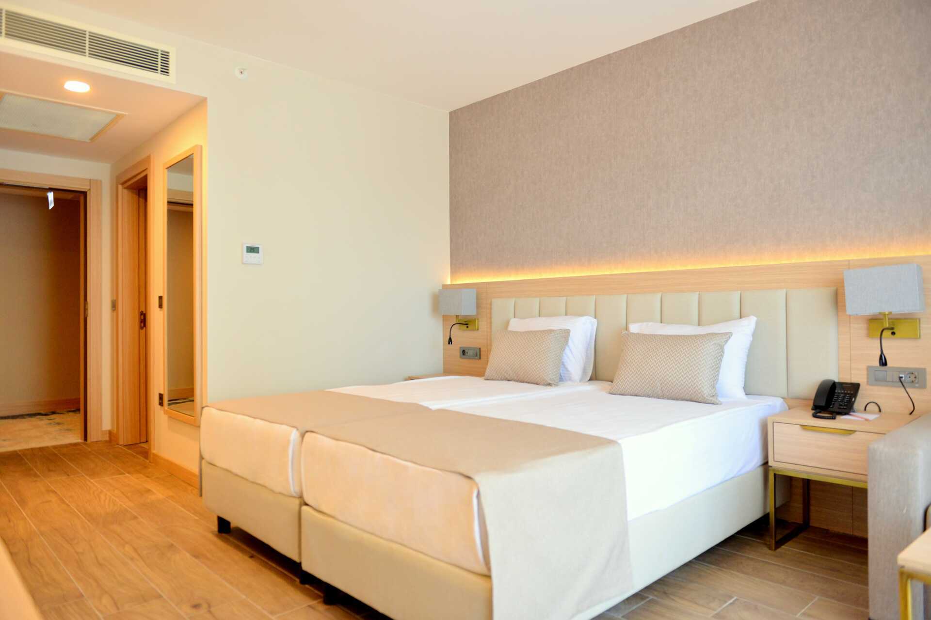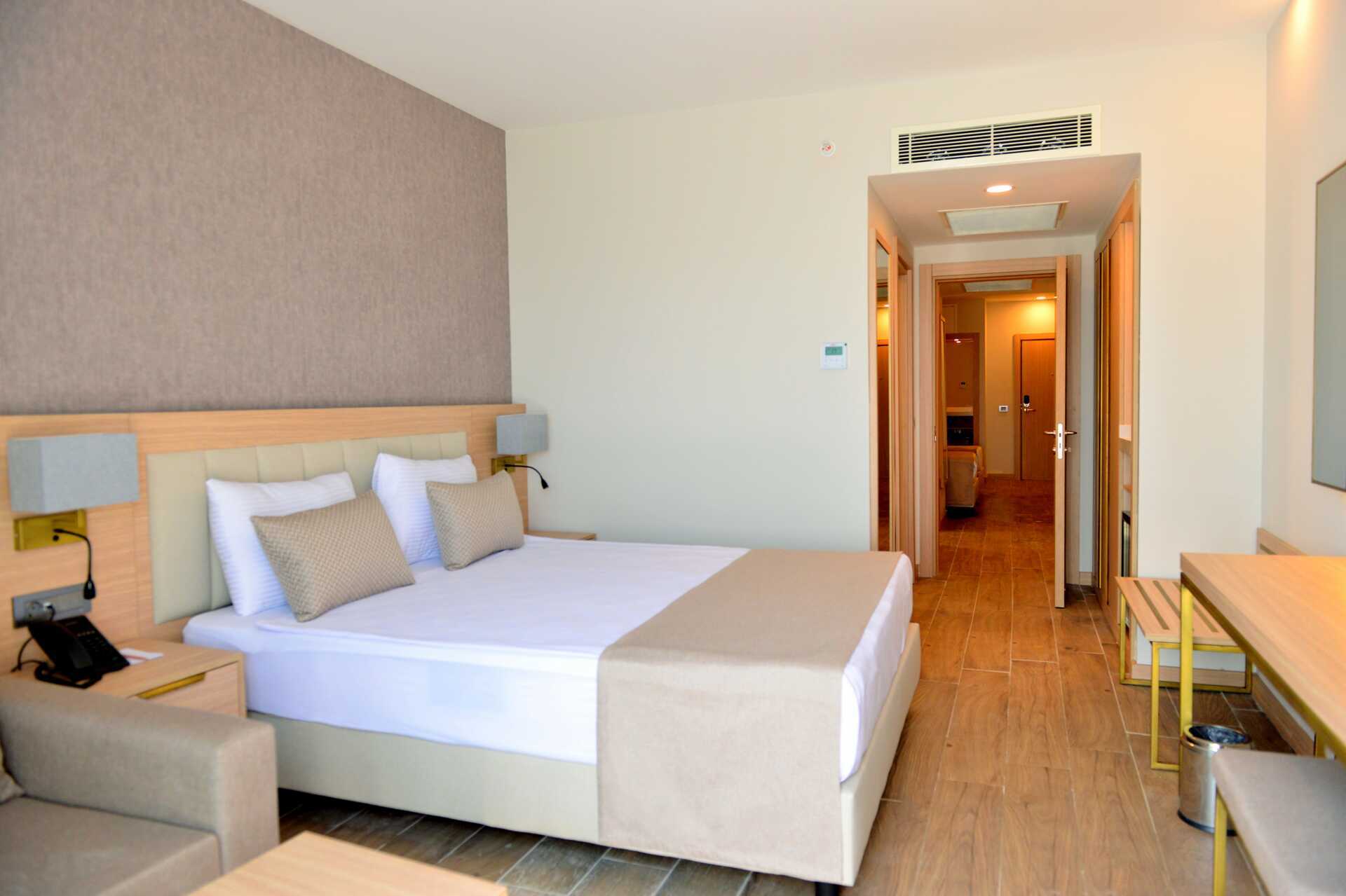 Deluxe-huone parvekkeella ja merinäköalalla. Parivuode tai kaksi yhden hengen sänkyä. Lisävuodemahdollisuus yhden hengen vuoteesta. Maksuton wifi, ilmastointi ja tallelokero. Minibaari (täytetään päivittäin). Kapselikeitin kahvin valmistukseen. Vedenkeitin, kahvia ja teetä. Tv kansainvälisillä kanavilla. Kylpytakit ja tossut. Hiustenkuivain. Suihku ja wc. Siivous 7 krt/viikko. Alle 2-vuotiaat lapset lasketaan lisävuoteella majoittuviksi henkilöiksi.