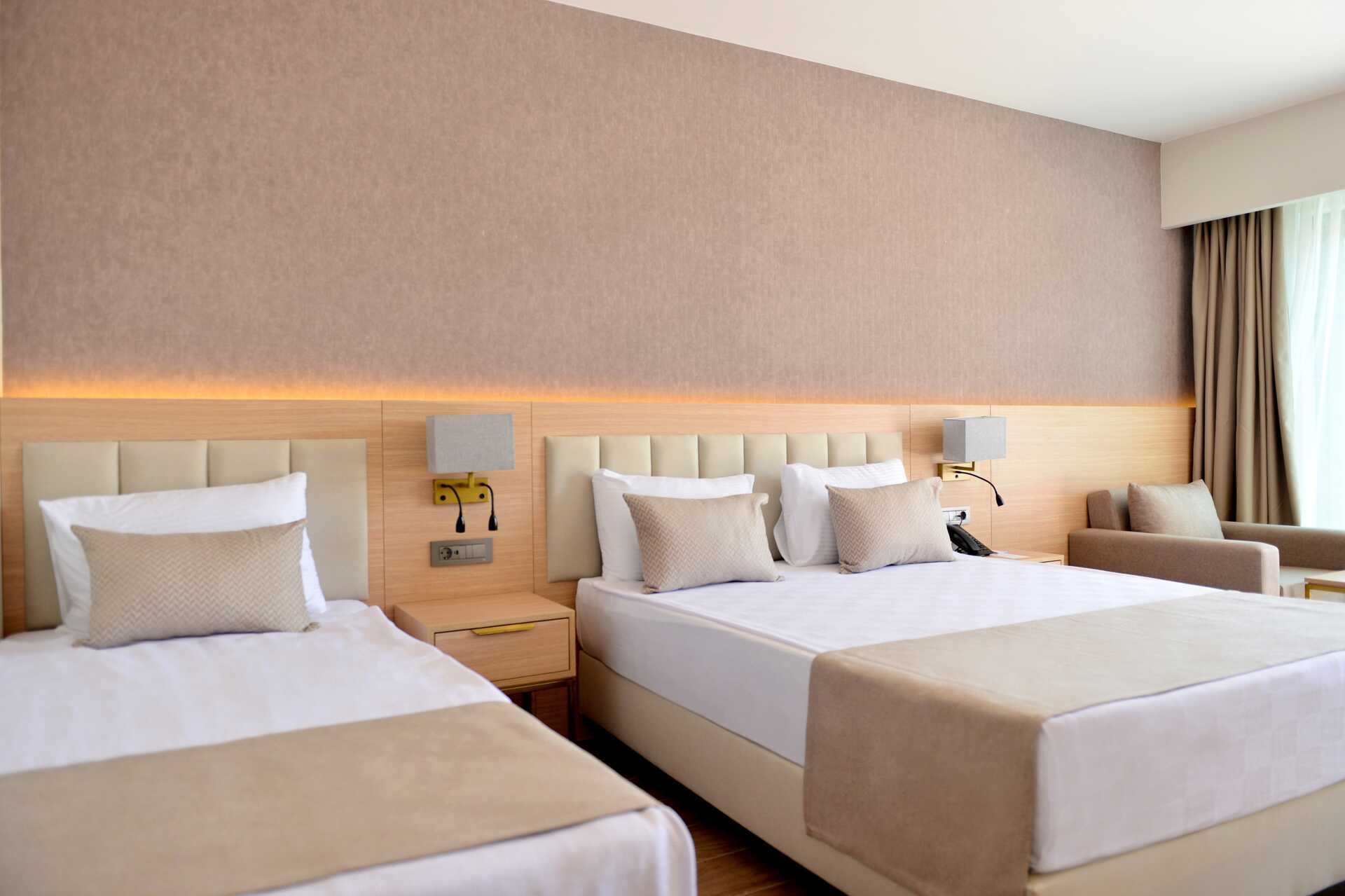 Kahden hengen huone parvekkeella. Parivuode tai kaksi yhden hengen sänkyä. Lisävuodemahdollisuus kokoontaitettavasta nojatuolista. Maksuton wifi, ilmastointi ja tallelokero. Minibaari (täytetään päivittäin). Vedenkeitin, kahvia ja teetä. Tv kansainvälisillä kanavilla. Kylpytakit ja tossut. Hiustenkuivain. Suihku ja wc. Siivous 7 krt/viikko. Alle 2-vuotiaat lapset lasketaan lisävuoteella majoittuviksi henkilöiksi.