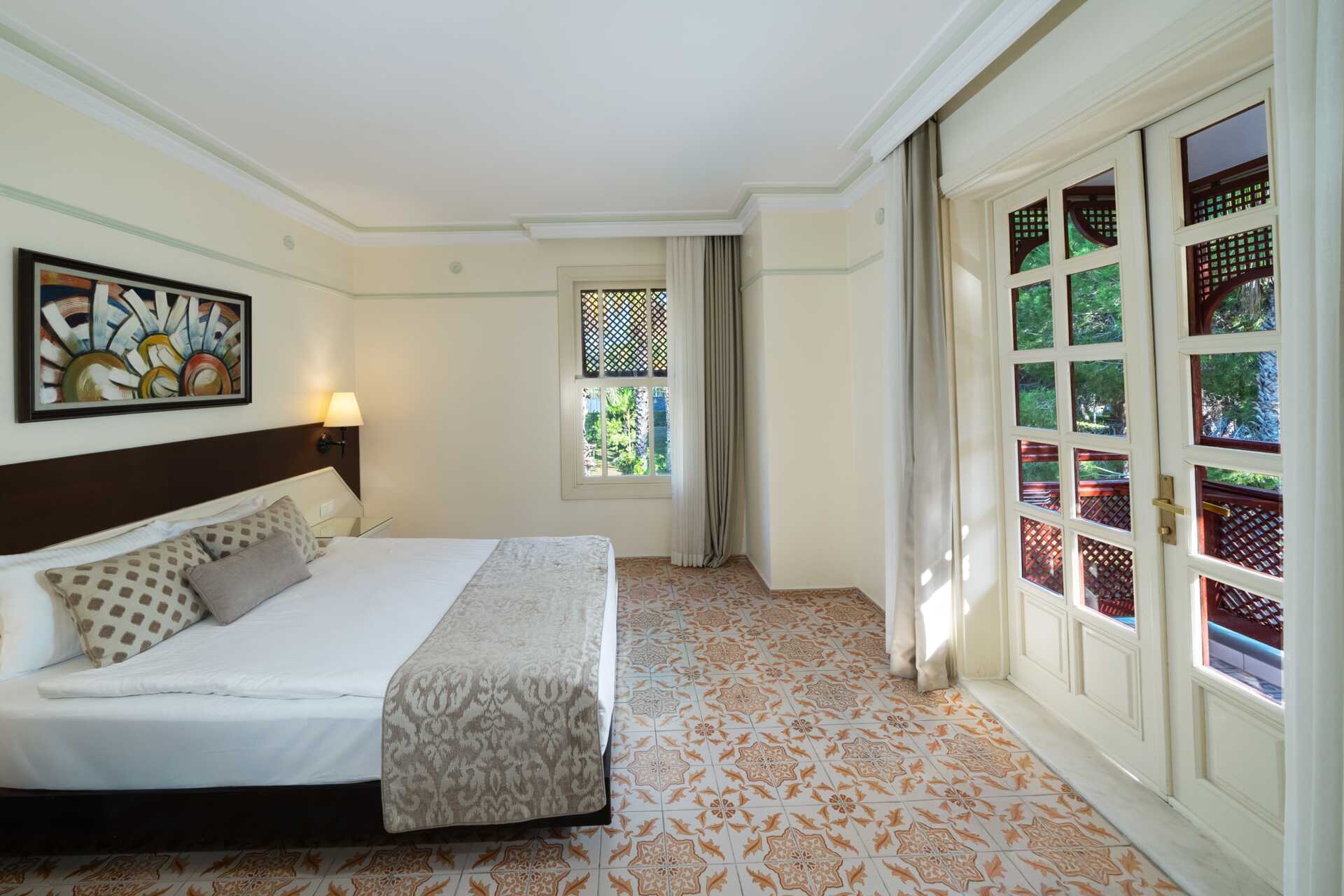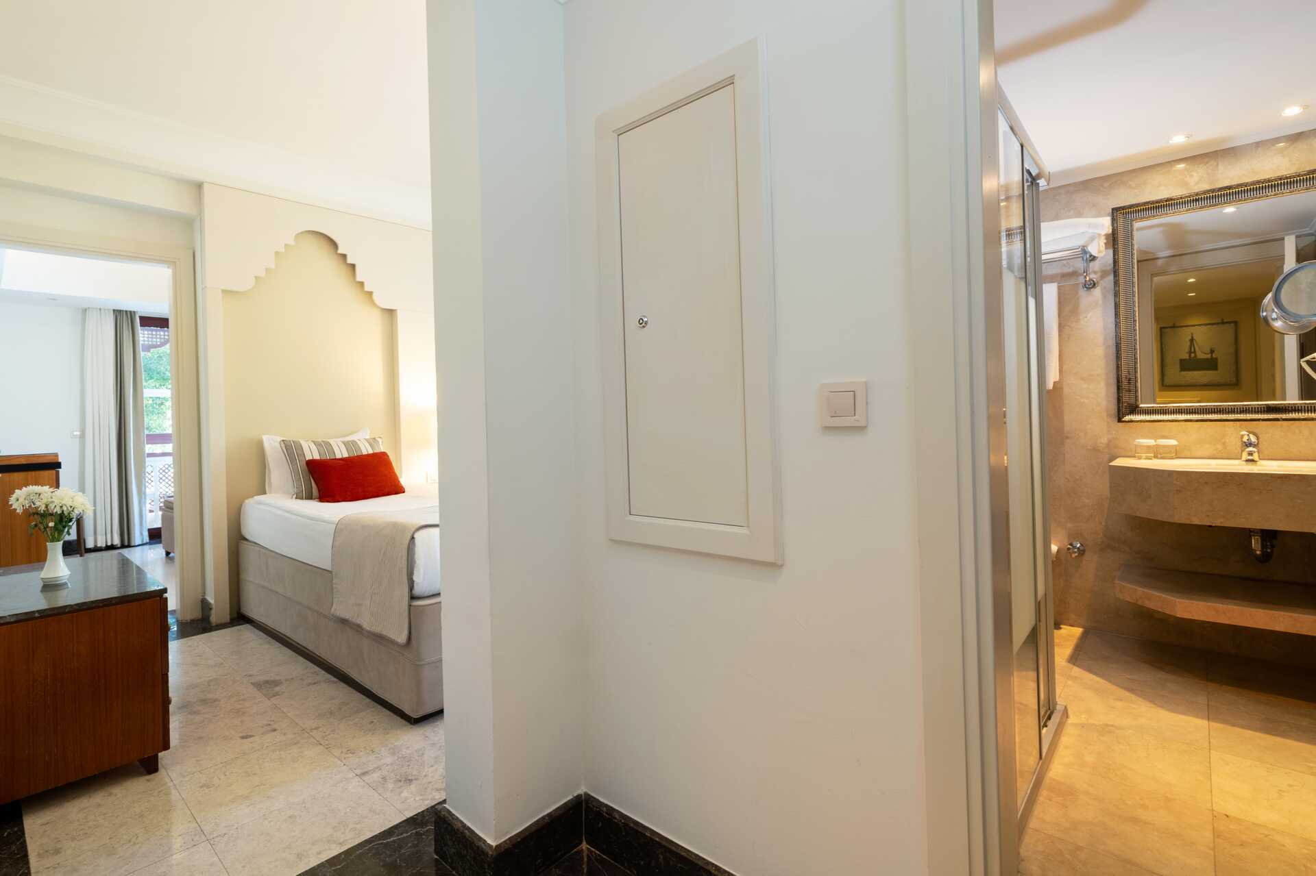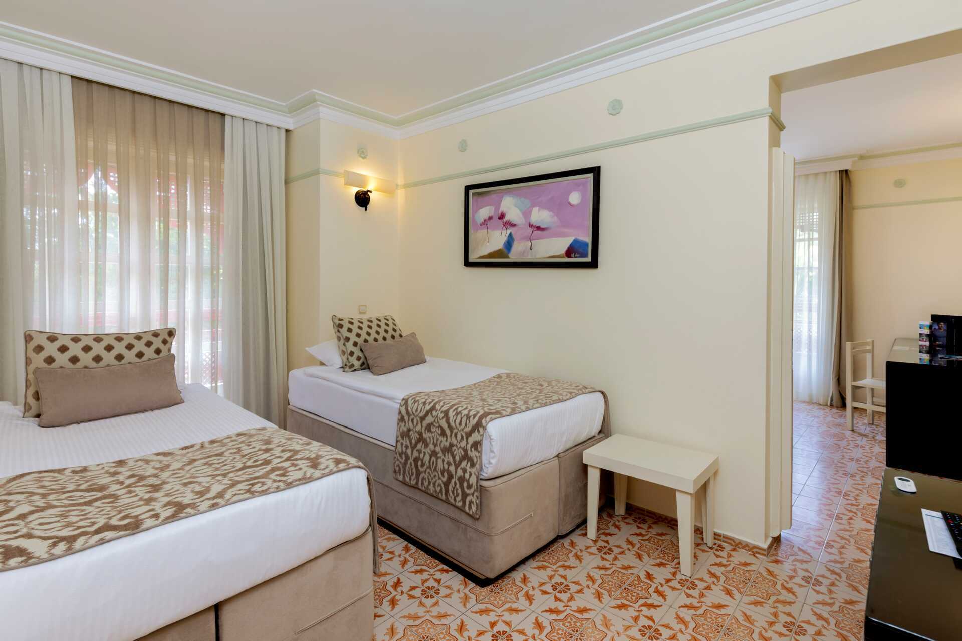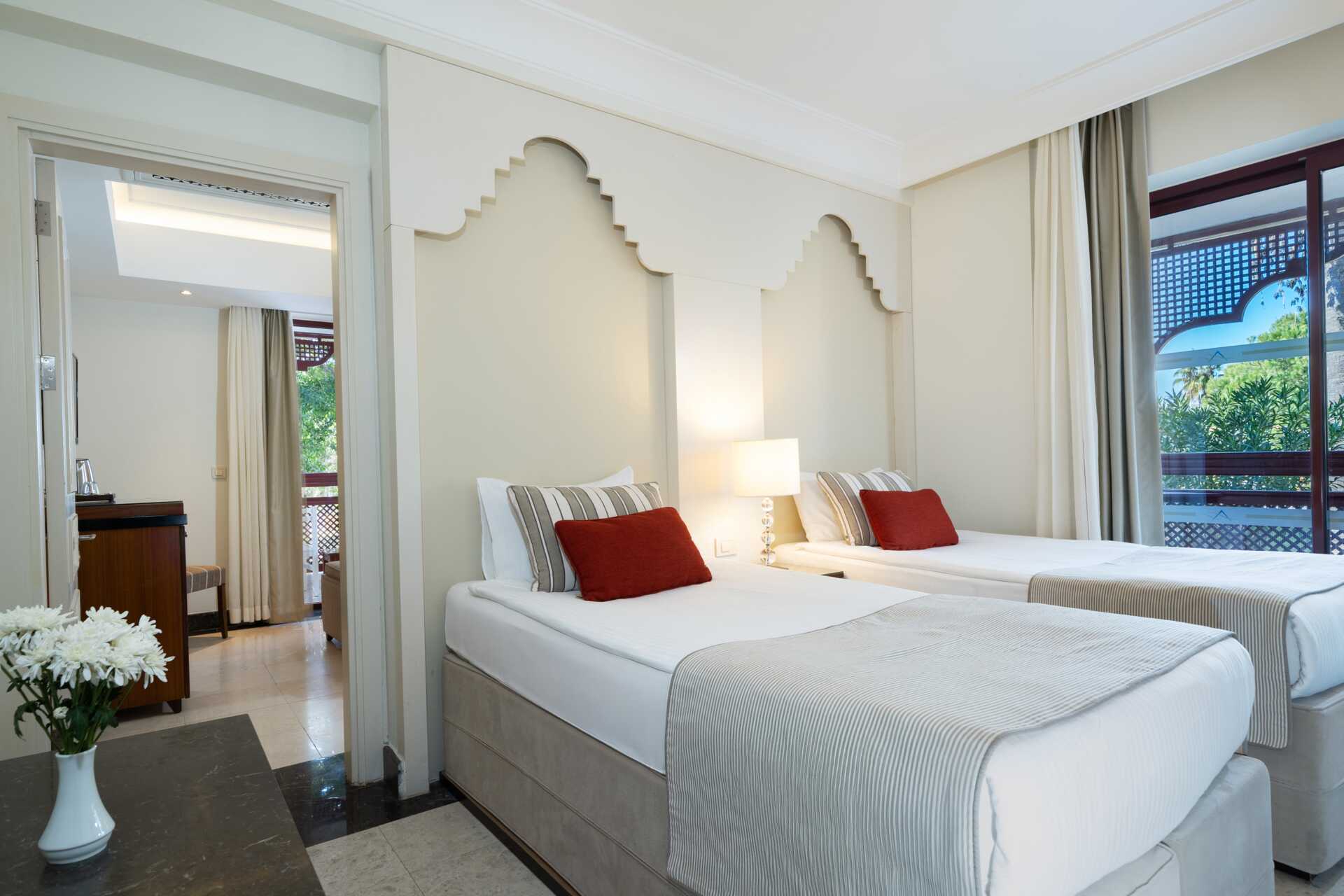 Perhehuone parvekkeella tai terassilla. Perhehuone koostuu kahdesta makuuhuoneesta, jotka on erotettu toisistaan liukuovella. Toisessa makuuhuoneessa on parivuode ja toisessa kaksi erillistä sänkyä. Tyynymenu. Maksuton wifi, ilmastointi ja tallelokero. Minibaari. Vedenkeitin kahvin ja teen kanssa. Tv kansainvälisillä kanavilla. Hiustenkuivain. Kylpyhuoneessa suihku ja wc. Siivous 7 krt/viikko.